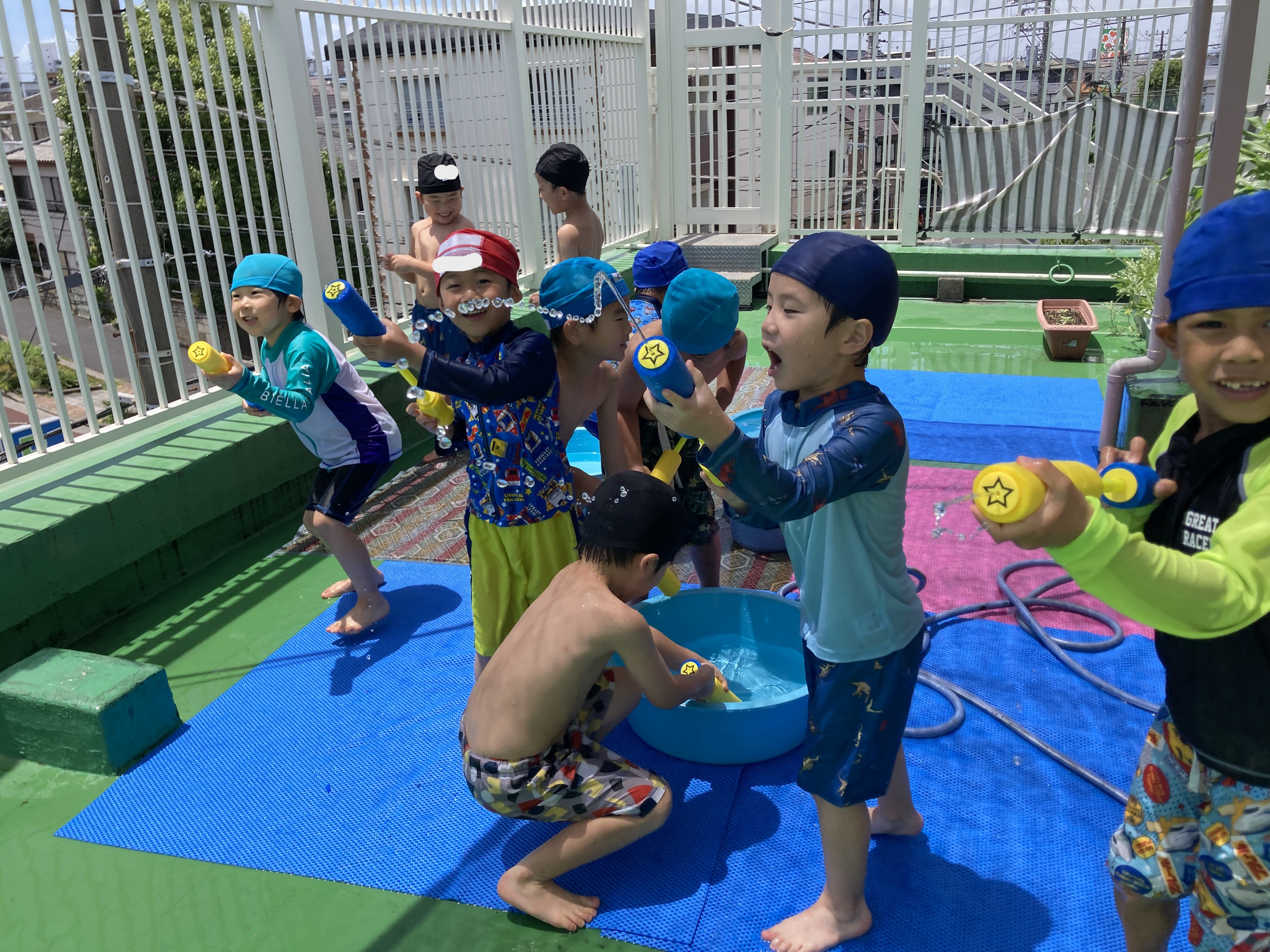 夏は、3階テラスで水あそび。