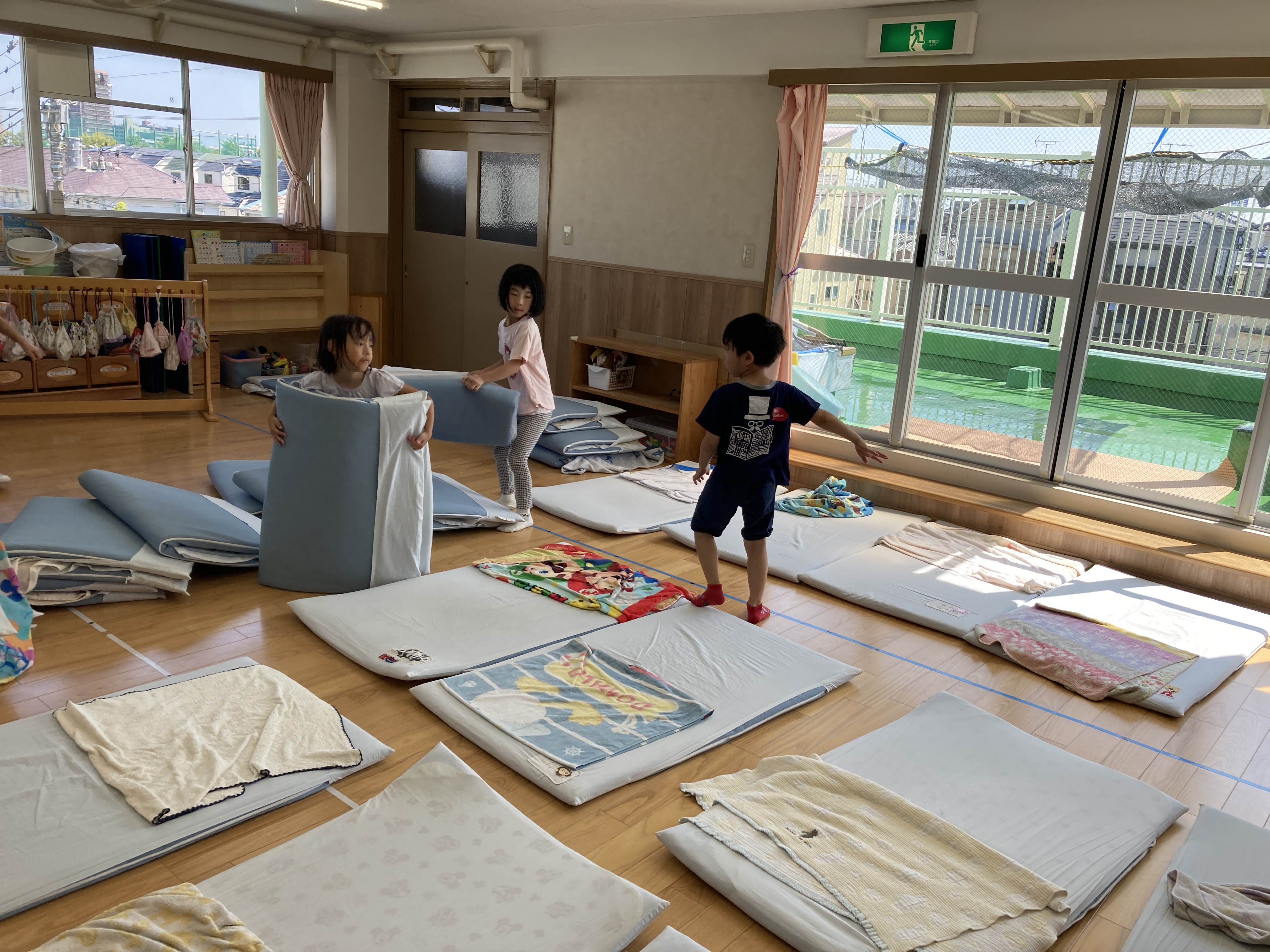配膳の間、布団敷き当番の子は頑張って布団を並べています。