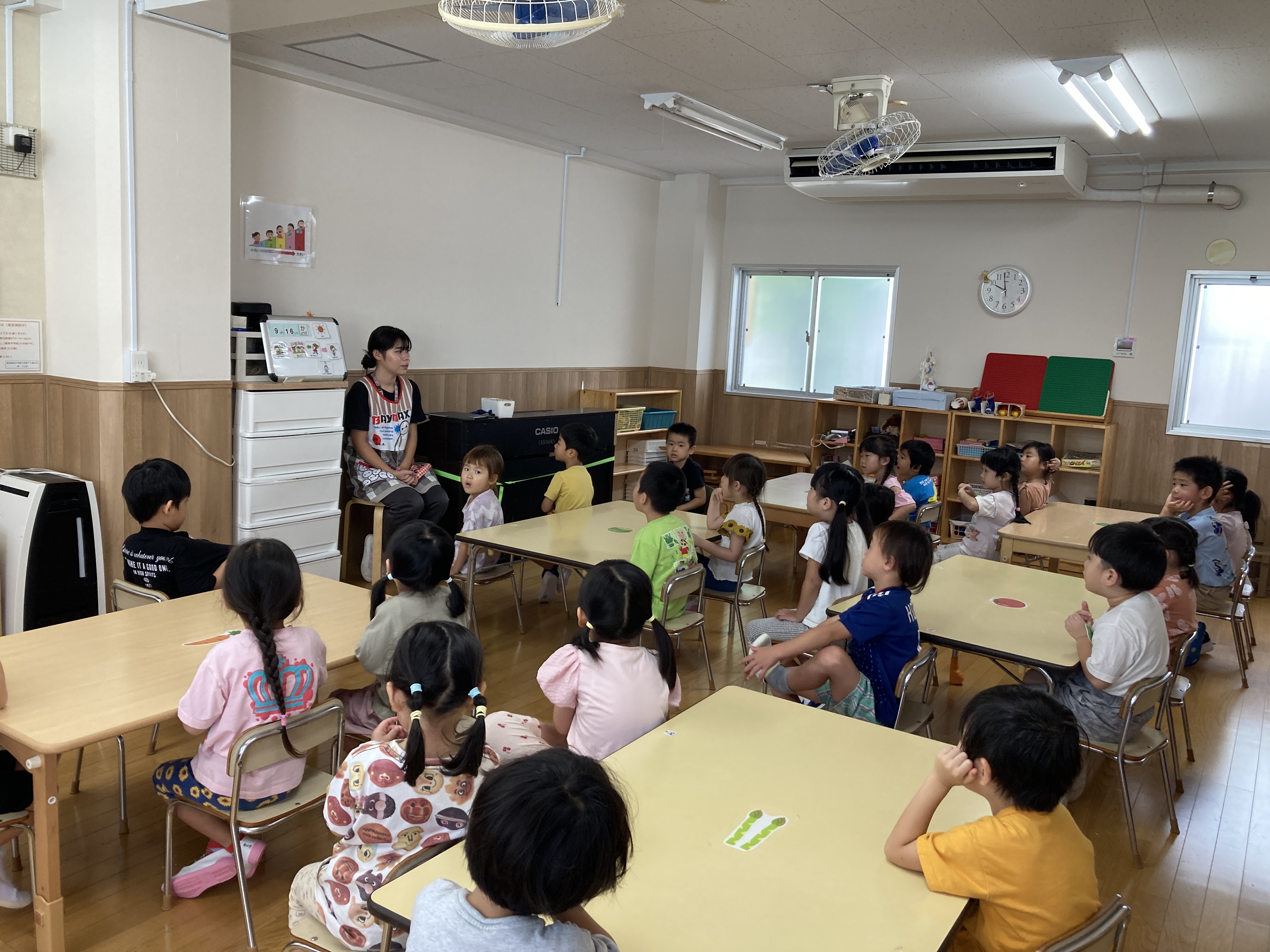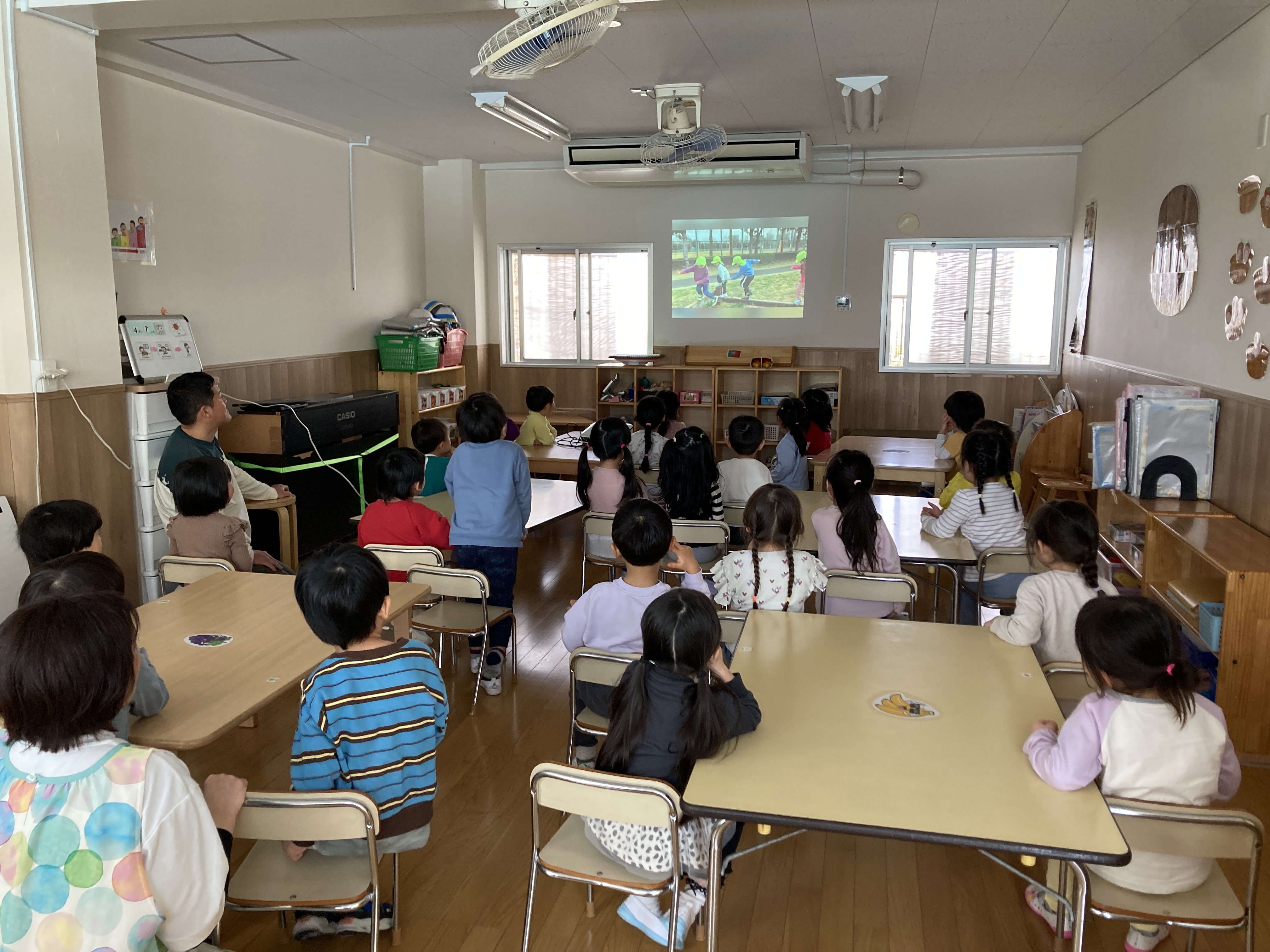 担任のピアノに合わせてリズム。端で見ているのは4歳きりん組さん。お手本になっています。
