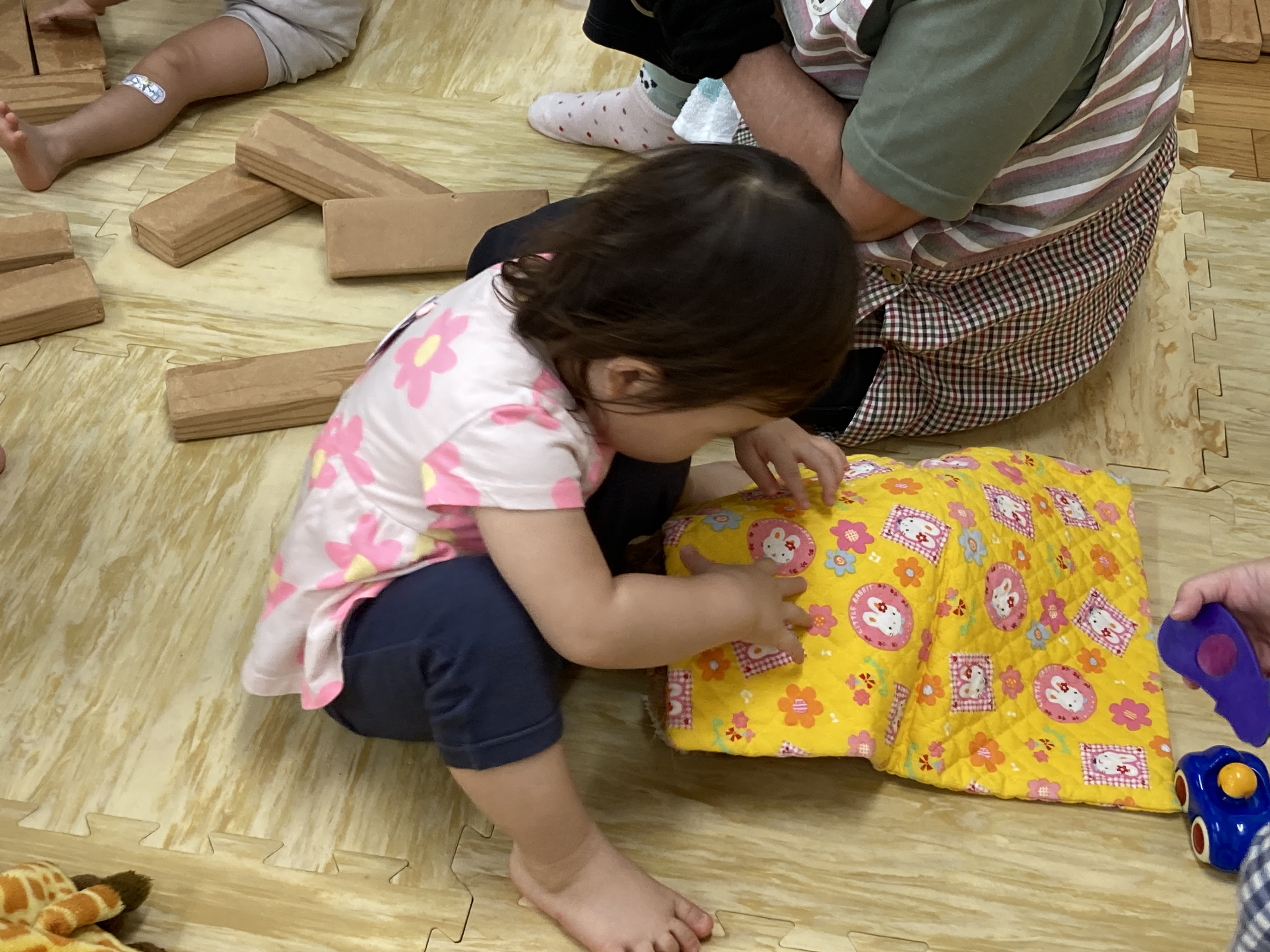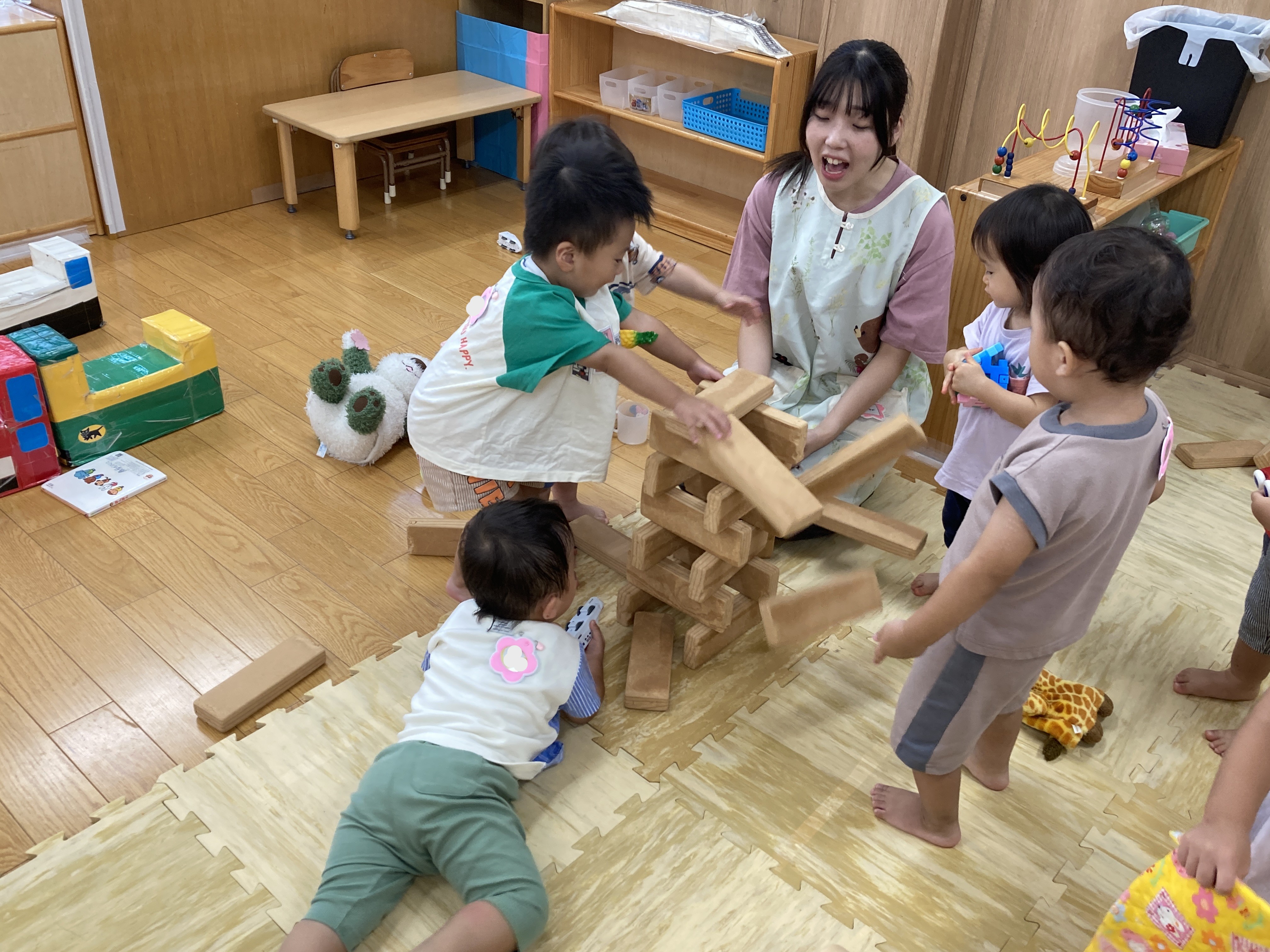 こちらは、先生が積む積み木を崩して楽しそう♪1番下の段に電車を通して楽しんでもいましたよ。