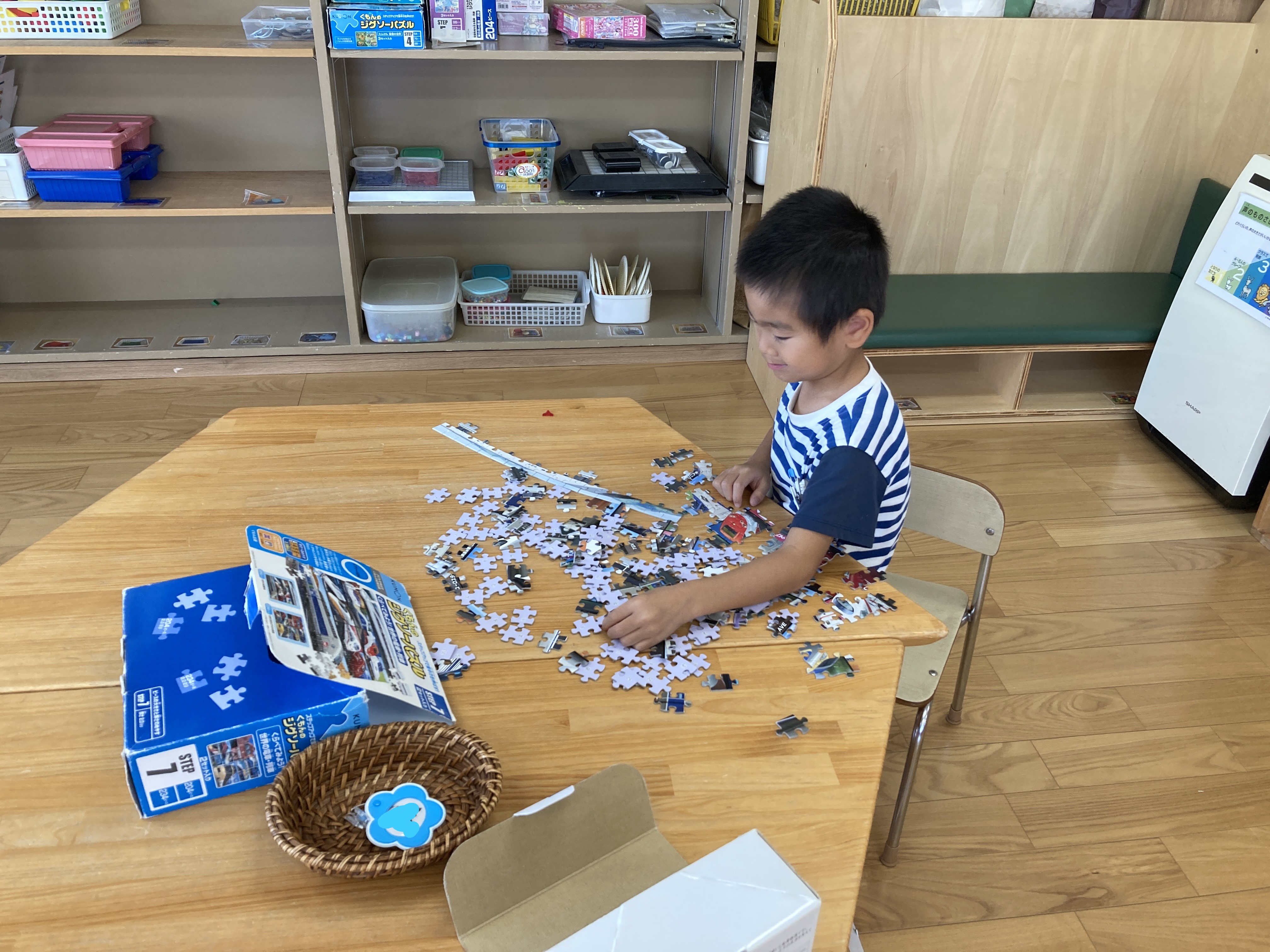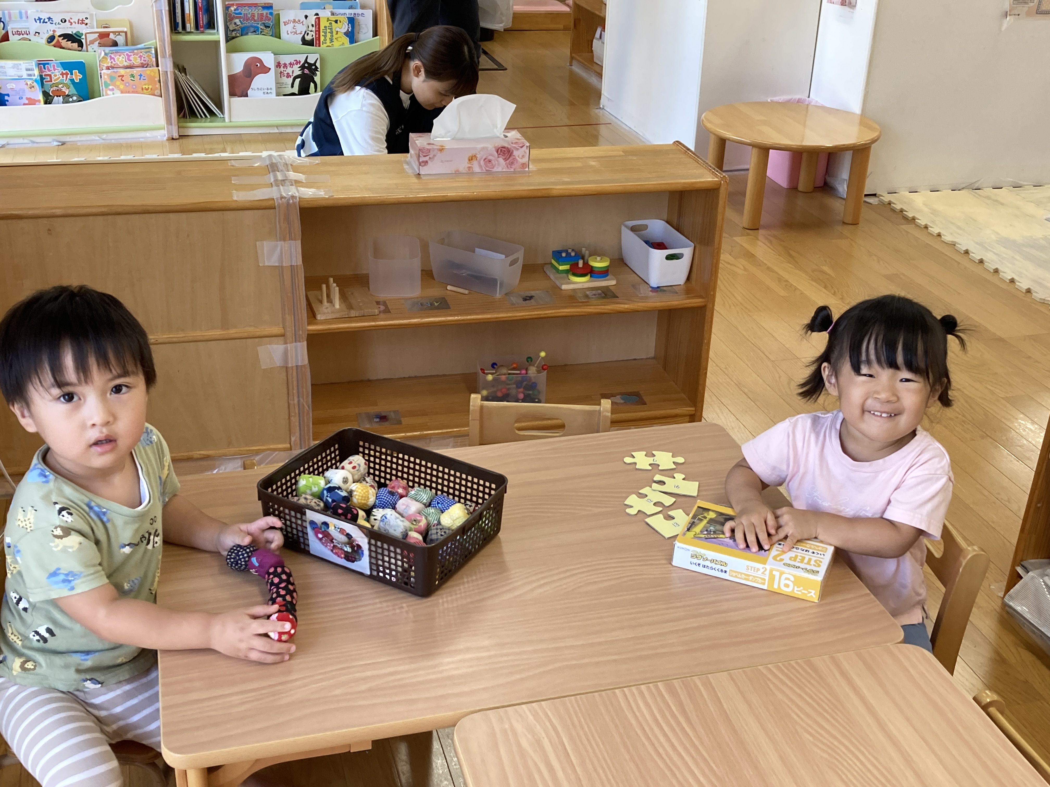 落ち着いて机で遊ぶのも大好き。手作りのおもちゃもたくさんあります。