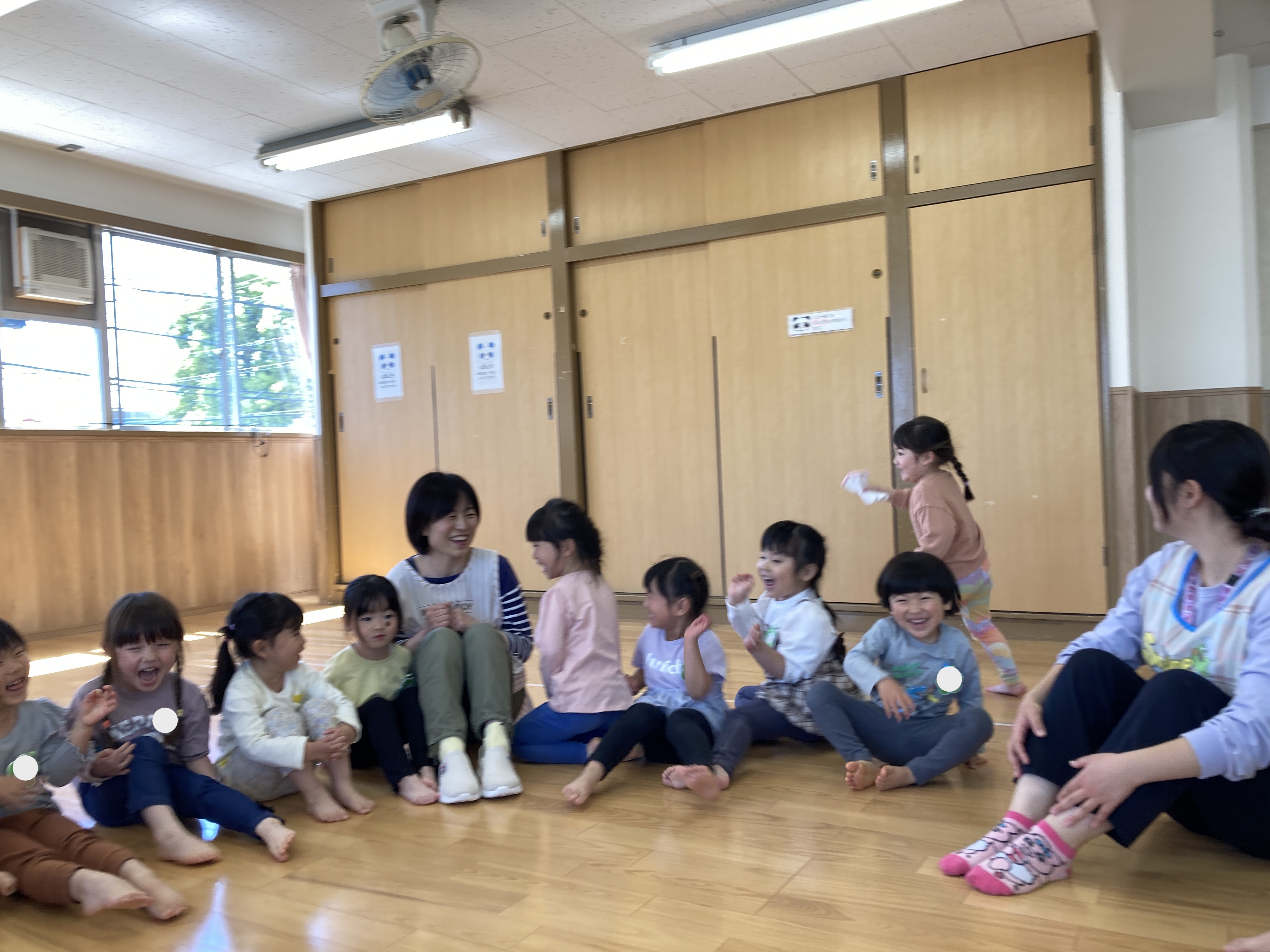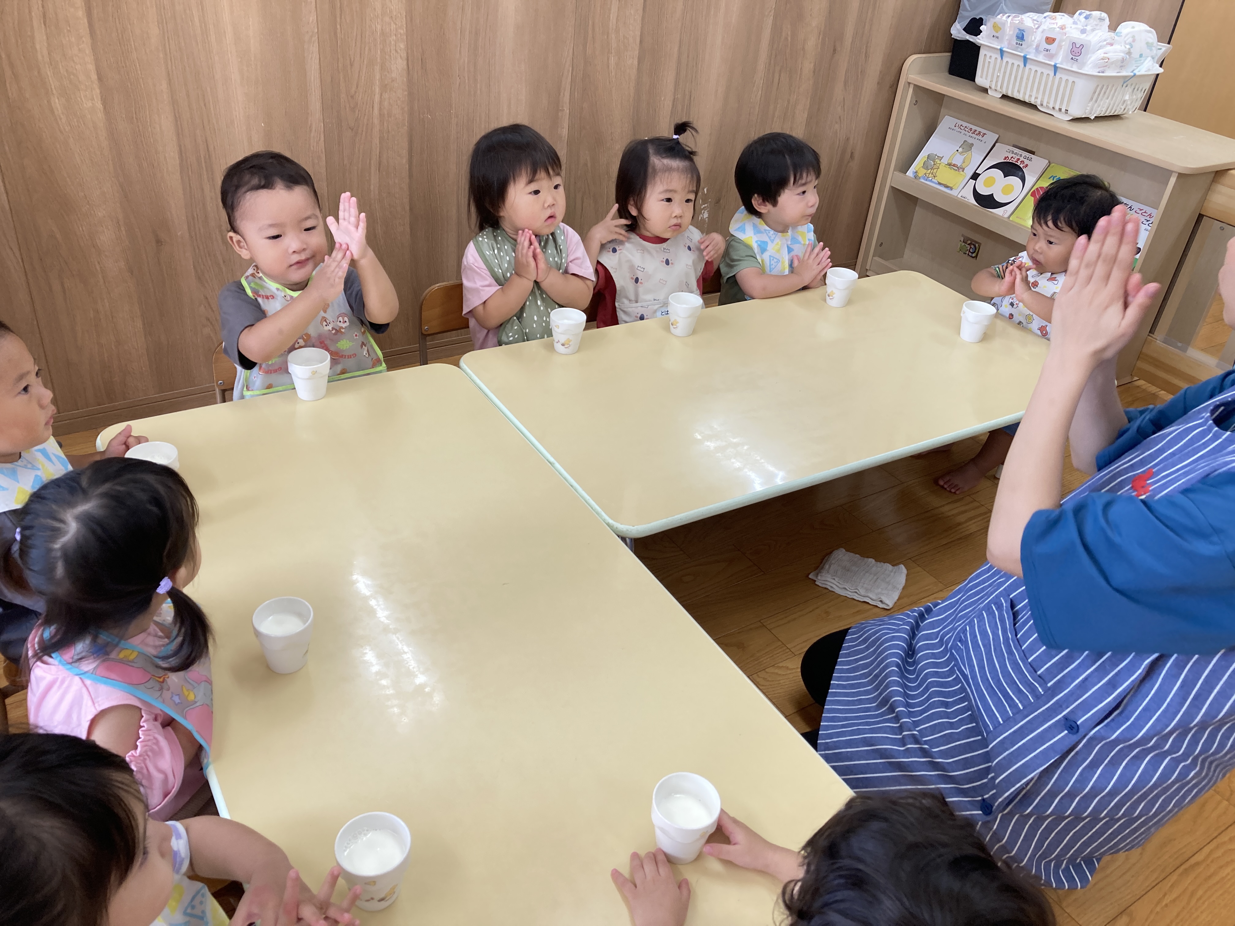 さぁ1日のはじまり、朝のおやつ(牛乳)を飲む時の手遊びの様子です。保育士の笑顔にも注目!子ども達と一緒に楽しそう♬