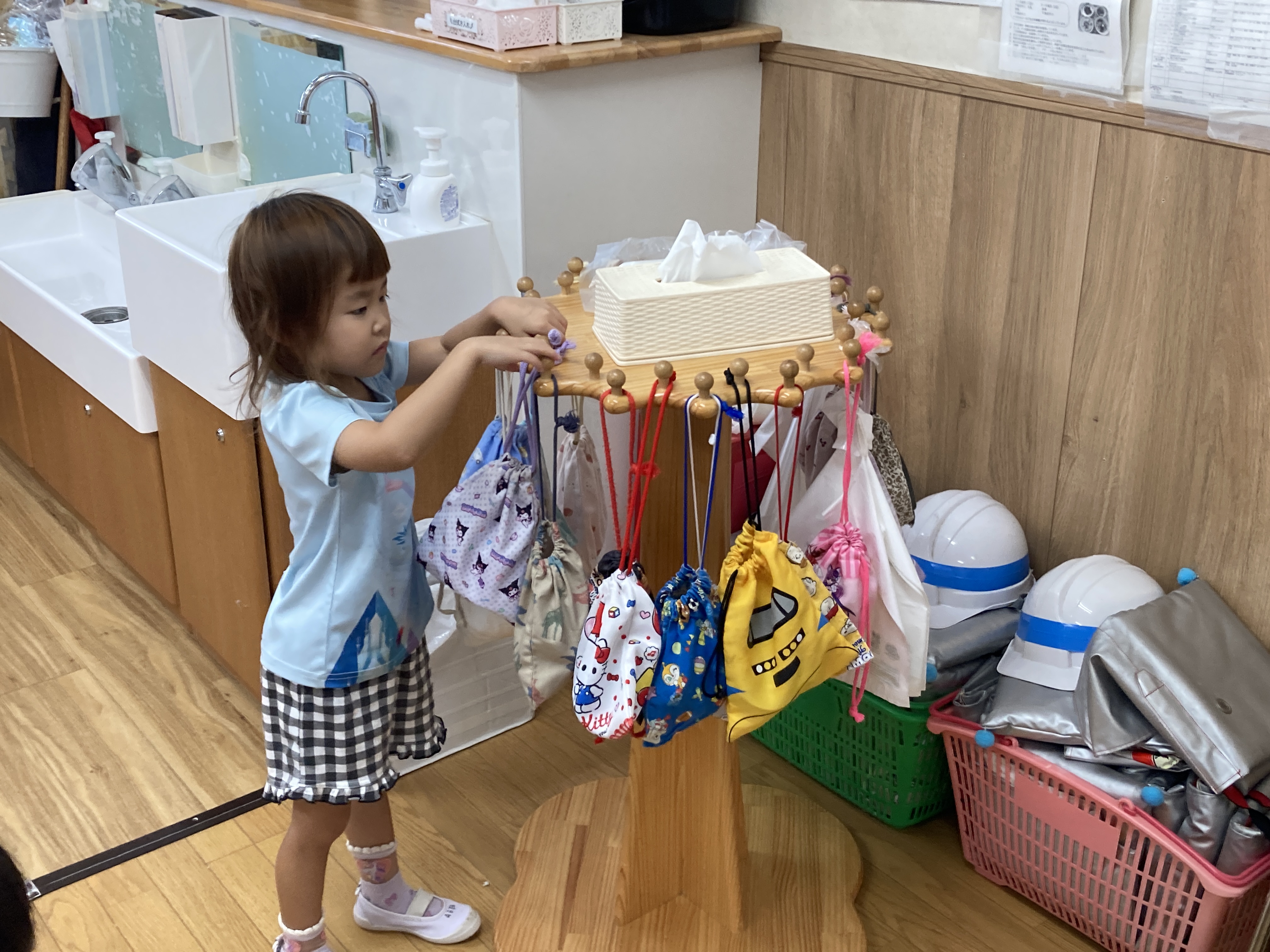 早番の部屋から自分たちのクラスに行くとすぐに朝の支度です。もう先生に言われなくてもすぐにできます。