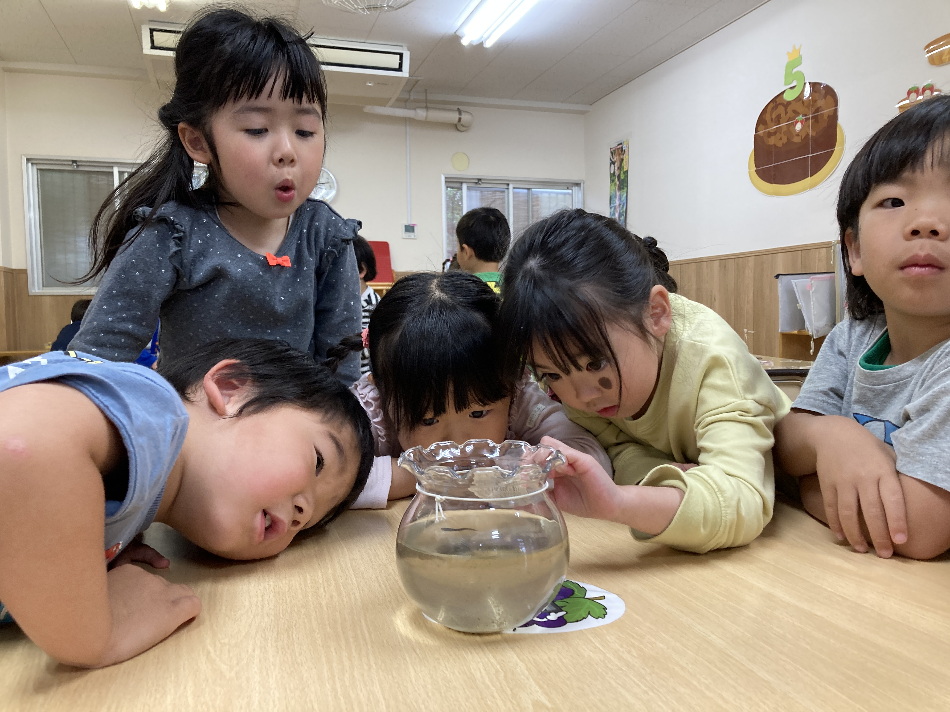 4歳になると”不思議”に思う気持ちも一層育ってきます。みんなで真剣におたまじゃくしを観察しています。