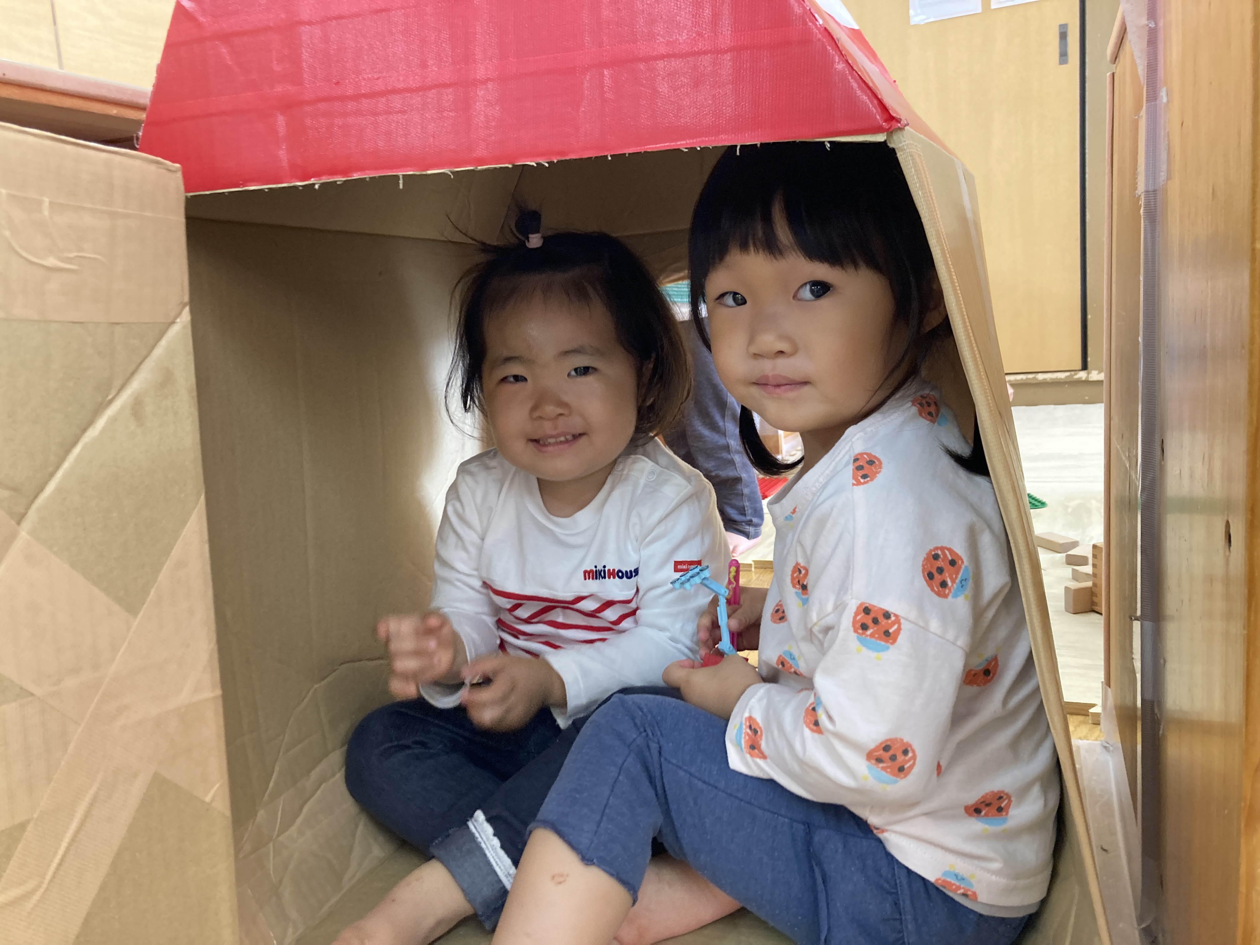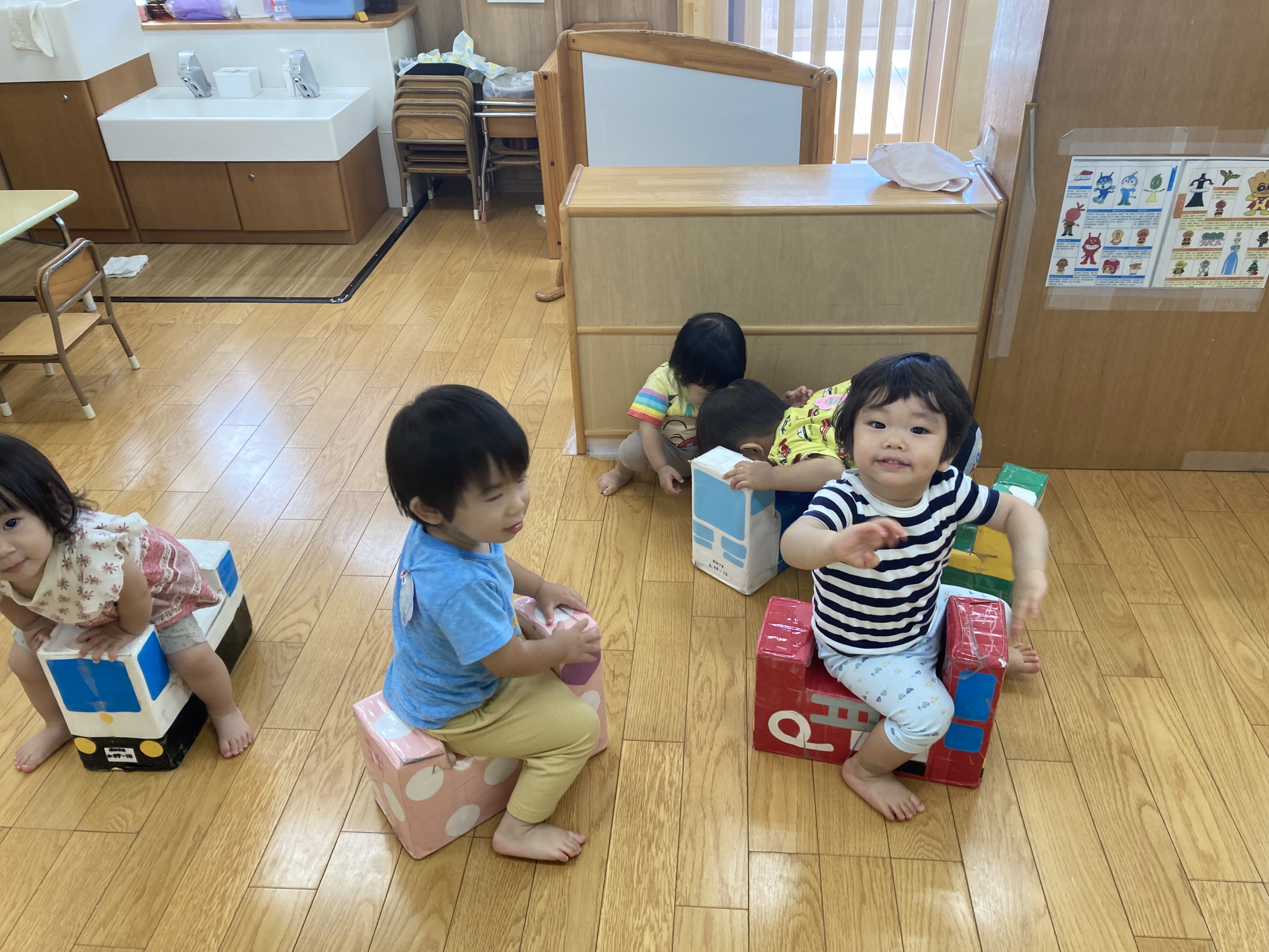 保育士の作った大きな箱積み木で家を作ったり高く積んだり。