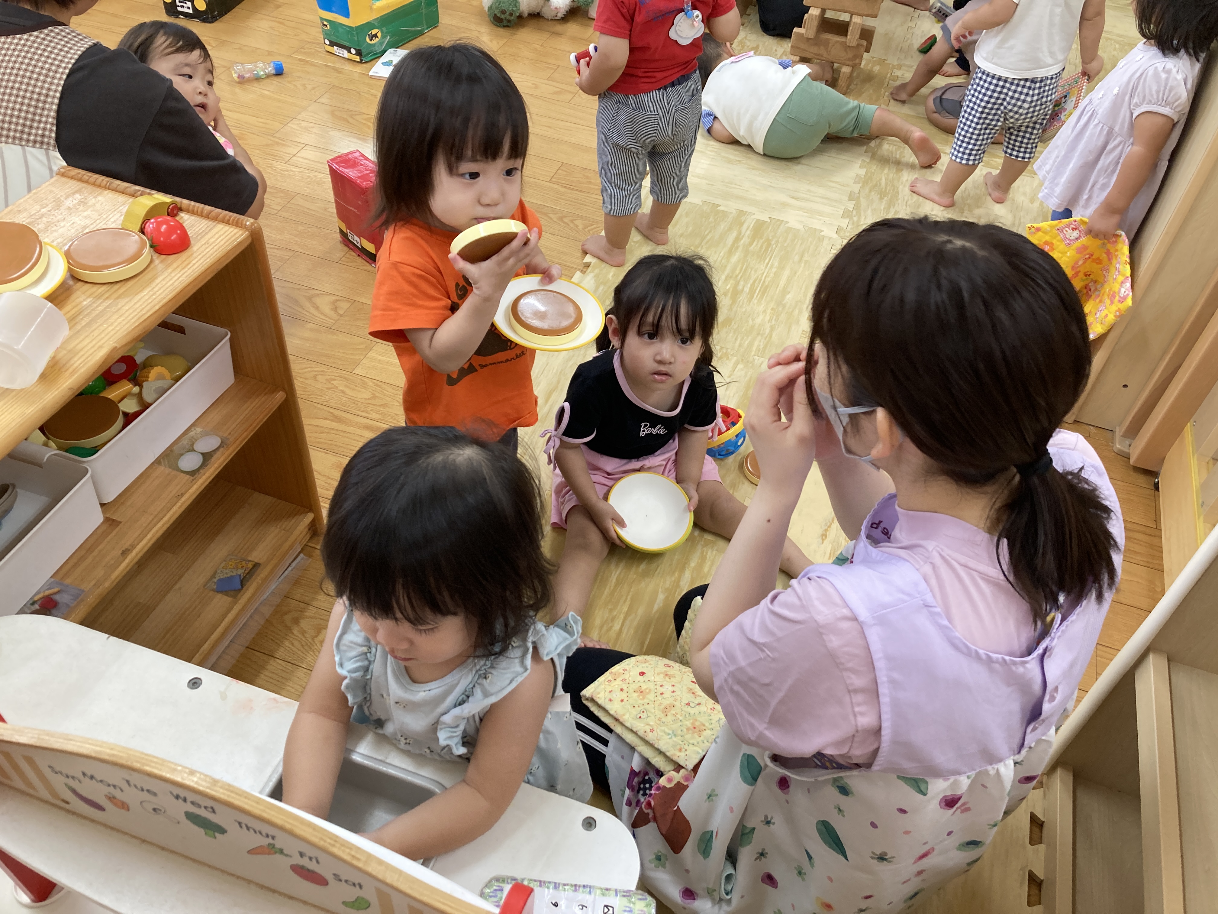おままごとで、先生と一緒に食べる真似。段々想像して遊ぶのも上手になってきました。