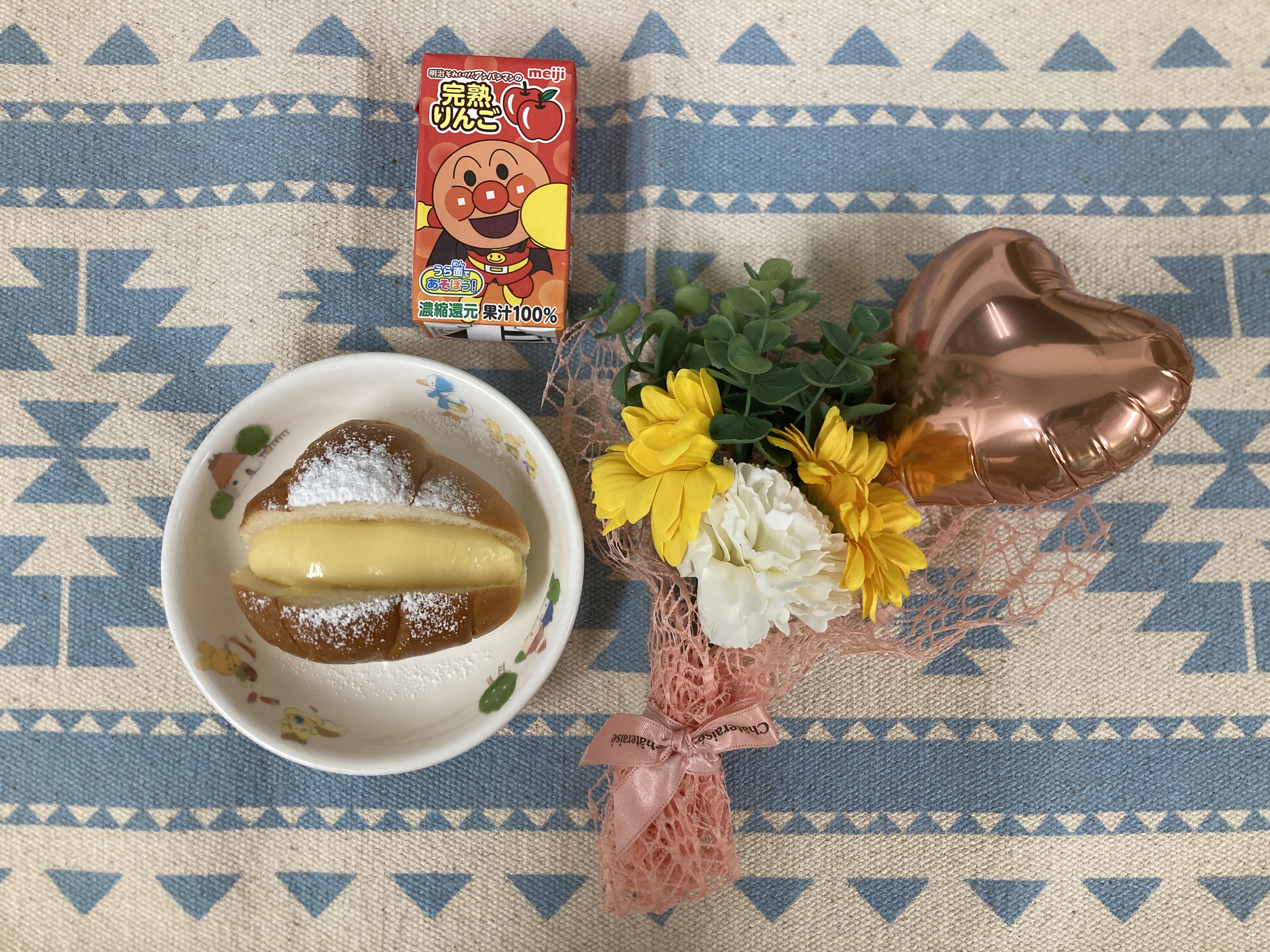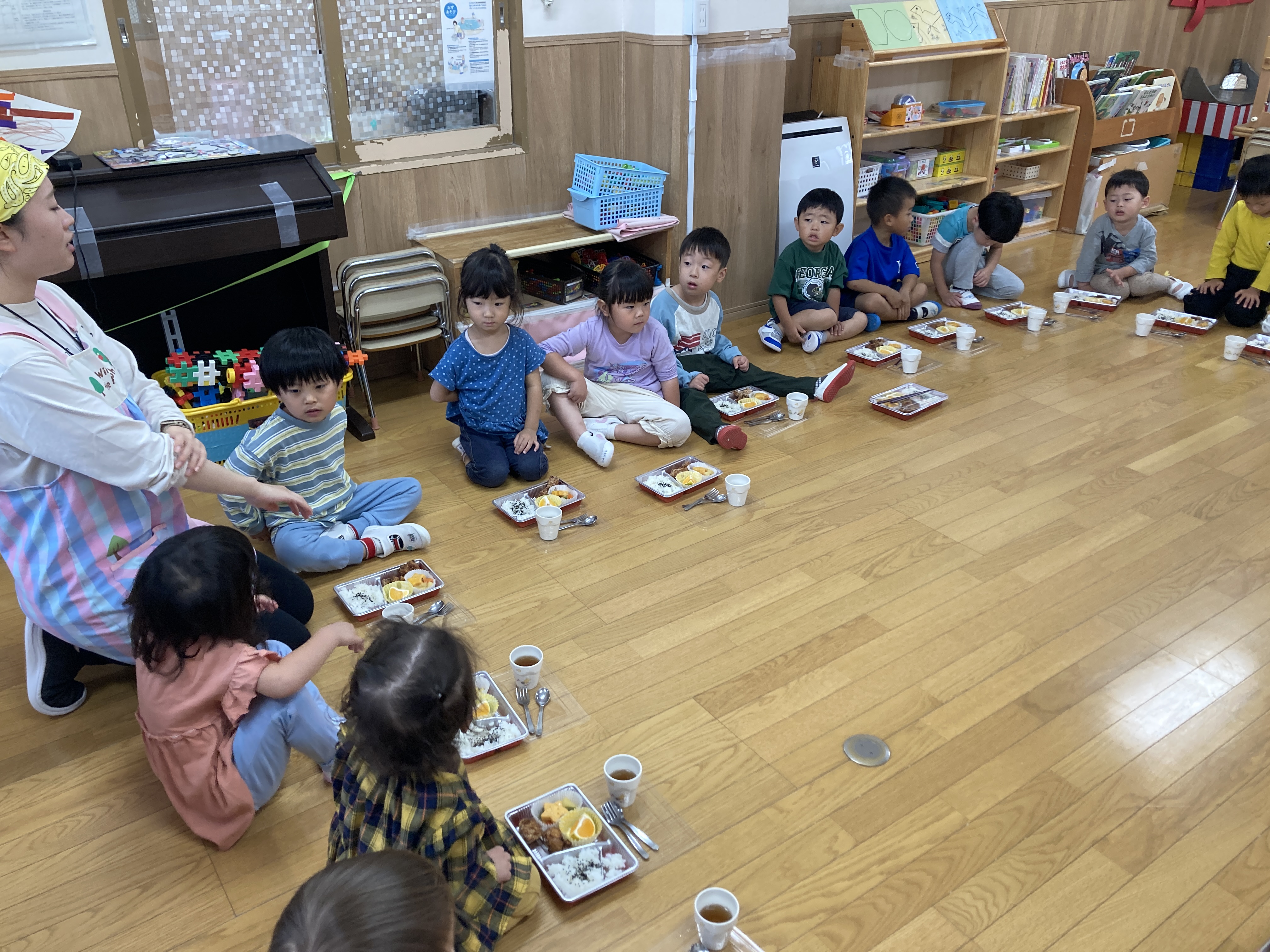 おやつのクリームパンは出てきた時から甘い匂いが部屋中に広がり、「甘い匂いがするー」と子ども達も笑顔が広がる様子が見られていました。口にクリームを付けながら美味しそうに食べていました。