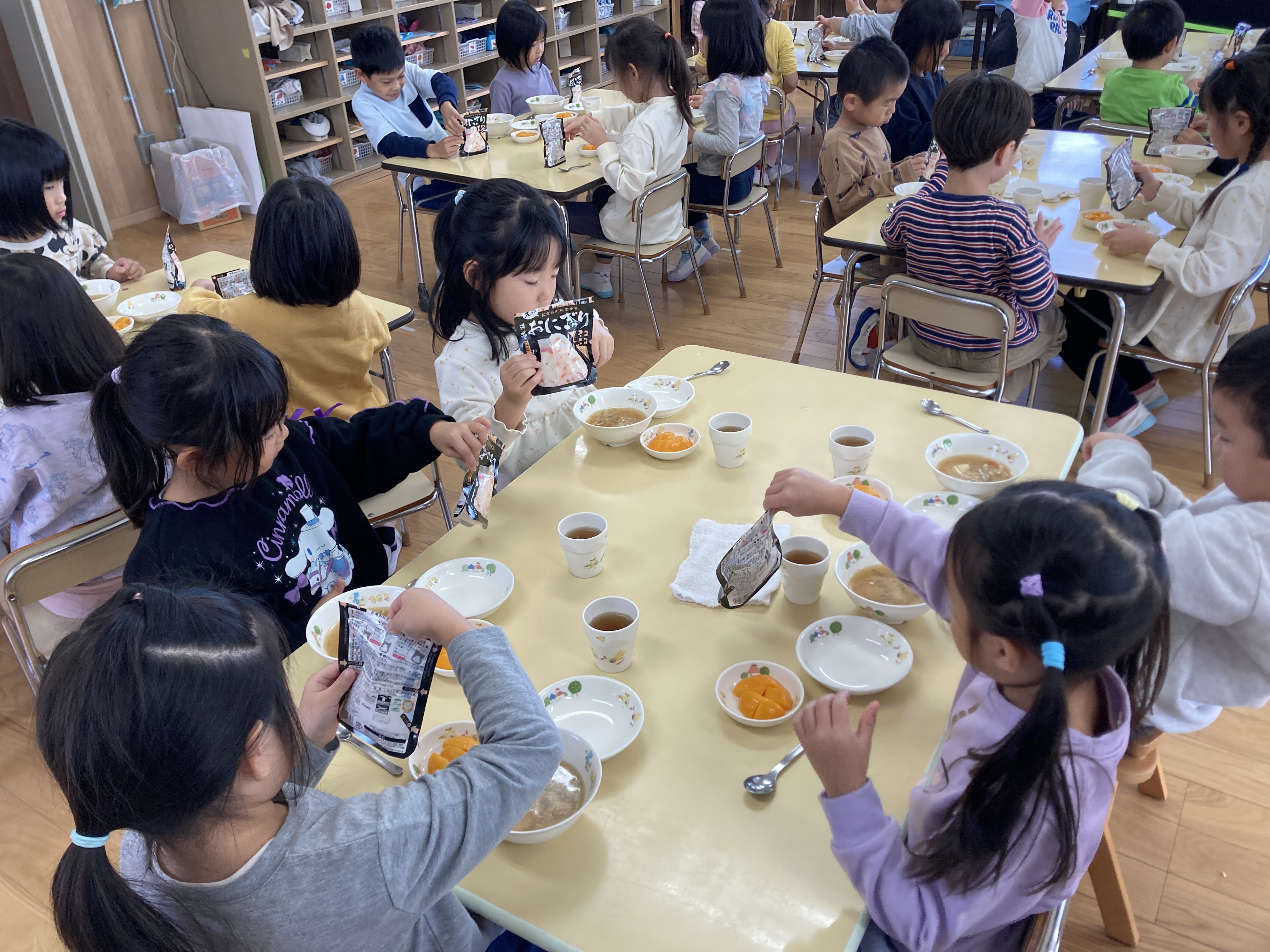 給食は、普段食べない非常食の「鮭おにぎり」でした。あまり食べ慣れない非常食に、「どんな味かな?」「三角になってるよ~」と興味を持ちながら、子ども達も食べていました。
