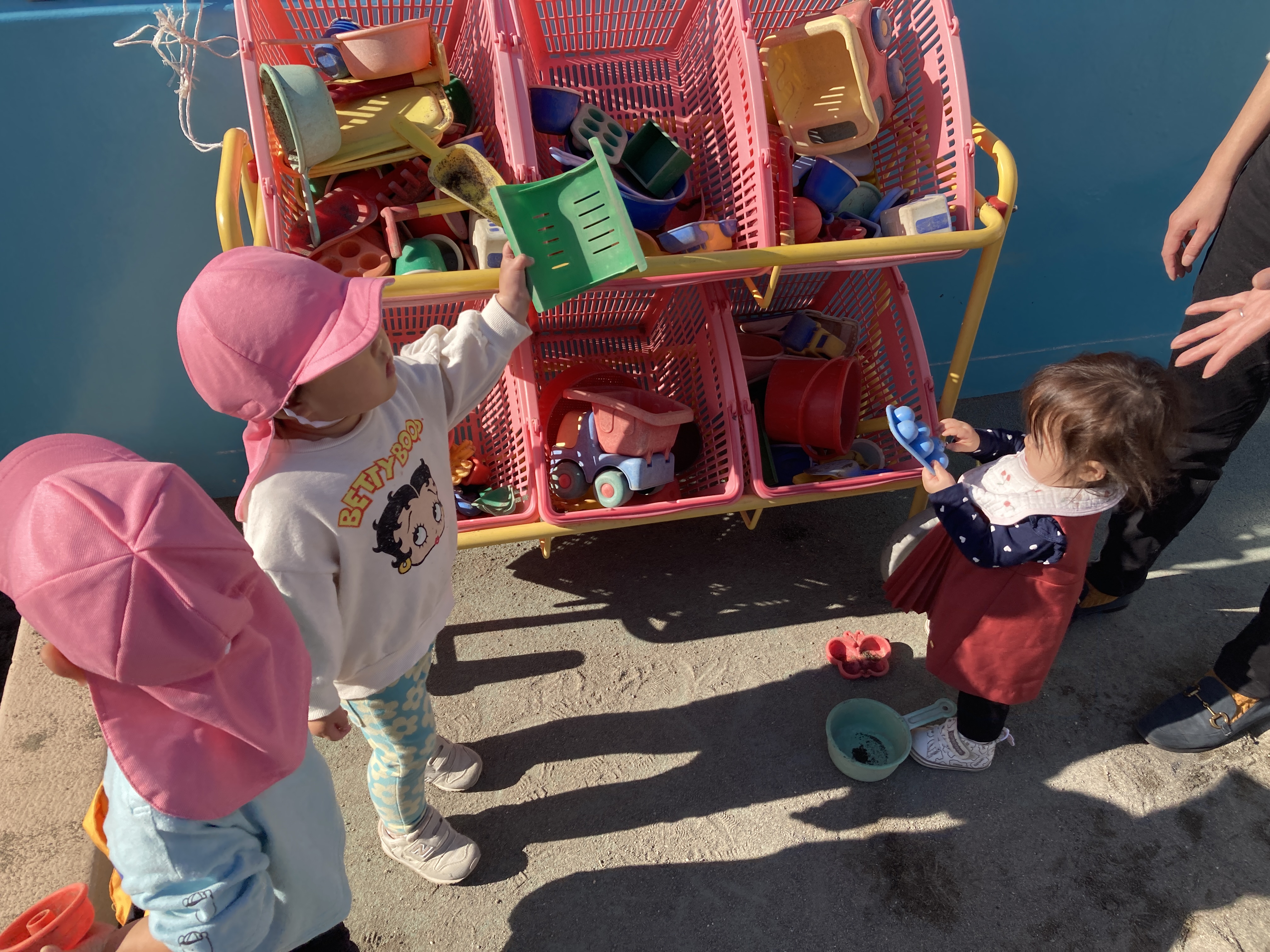 園庭では1歳児クラスのお友達から砂場のおもちゃを受け取って喜んだり、滑り台の下で待つお母さんに笑顔で手を振ったりと可愛らしかったです。