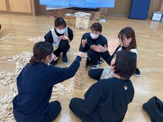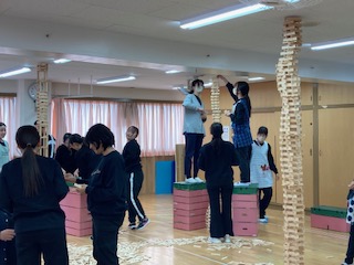 この頃には、かなり真剣になってきています。そして天井に届いた時は、グループみんなで喜びを分かち合い思わず「出来た!」「やったー!!」と大喜びしました。