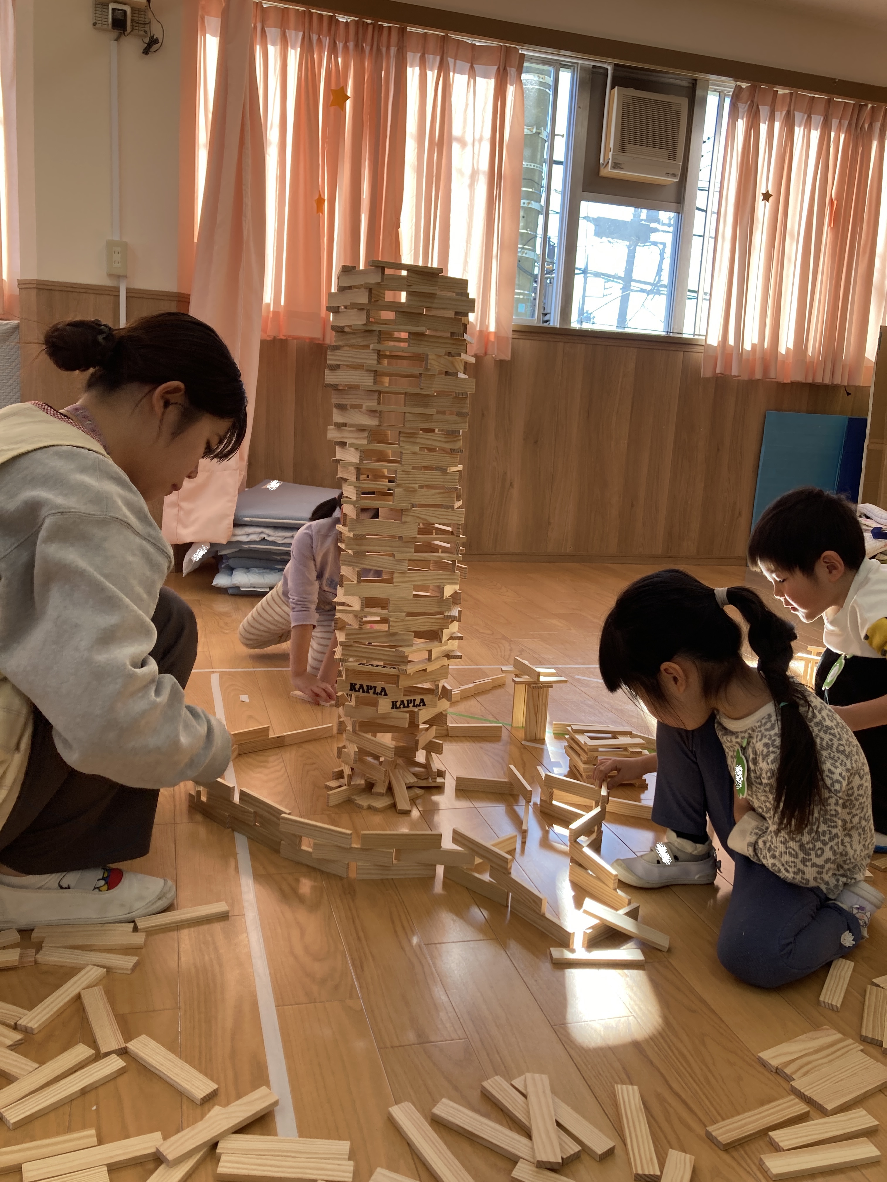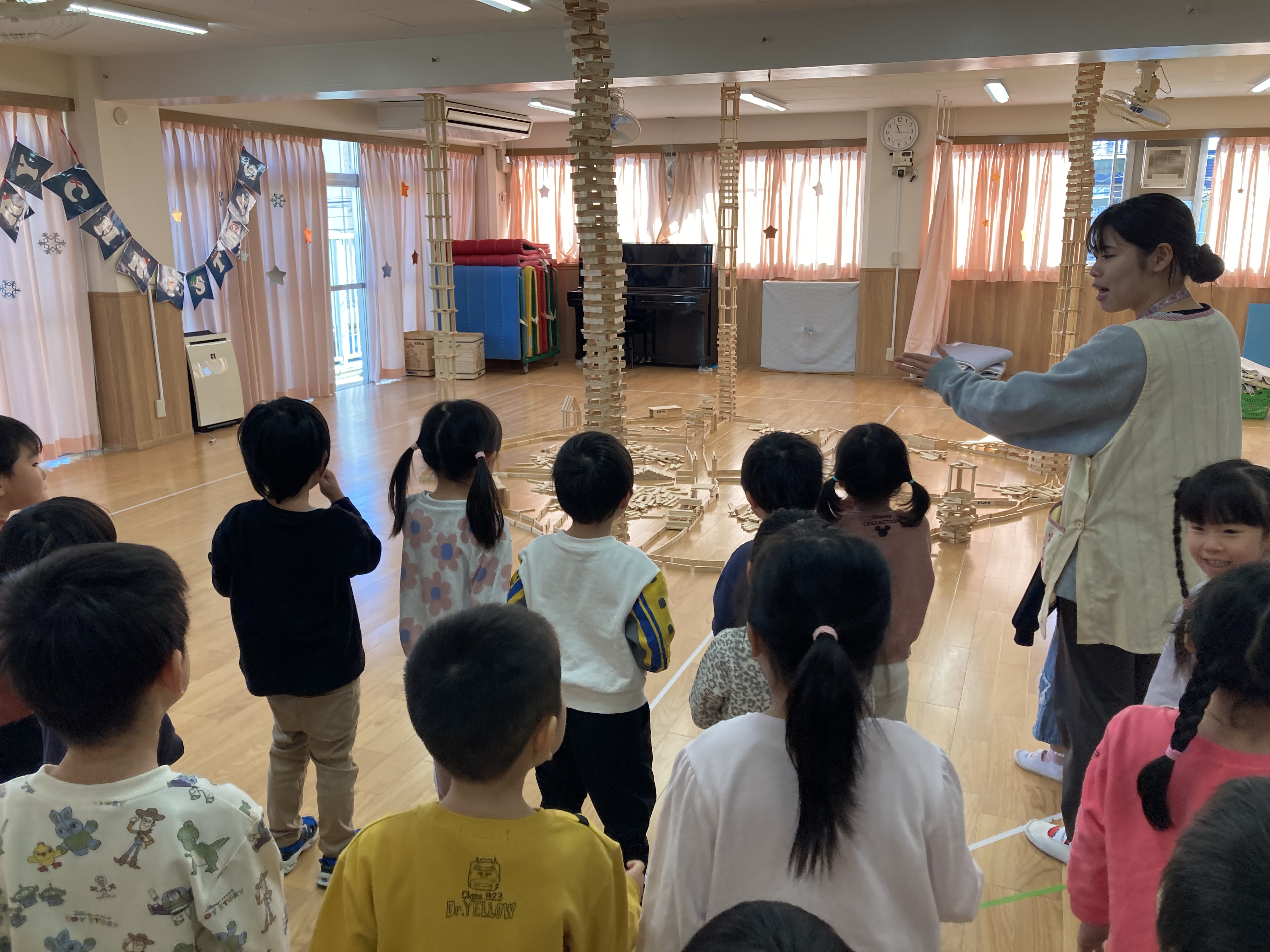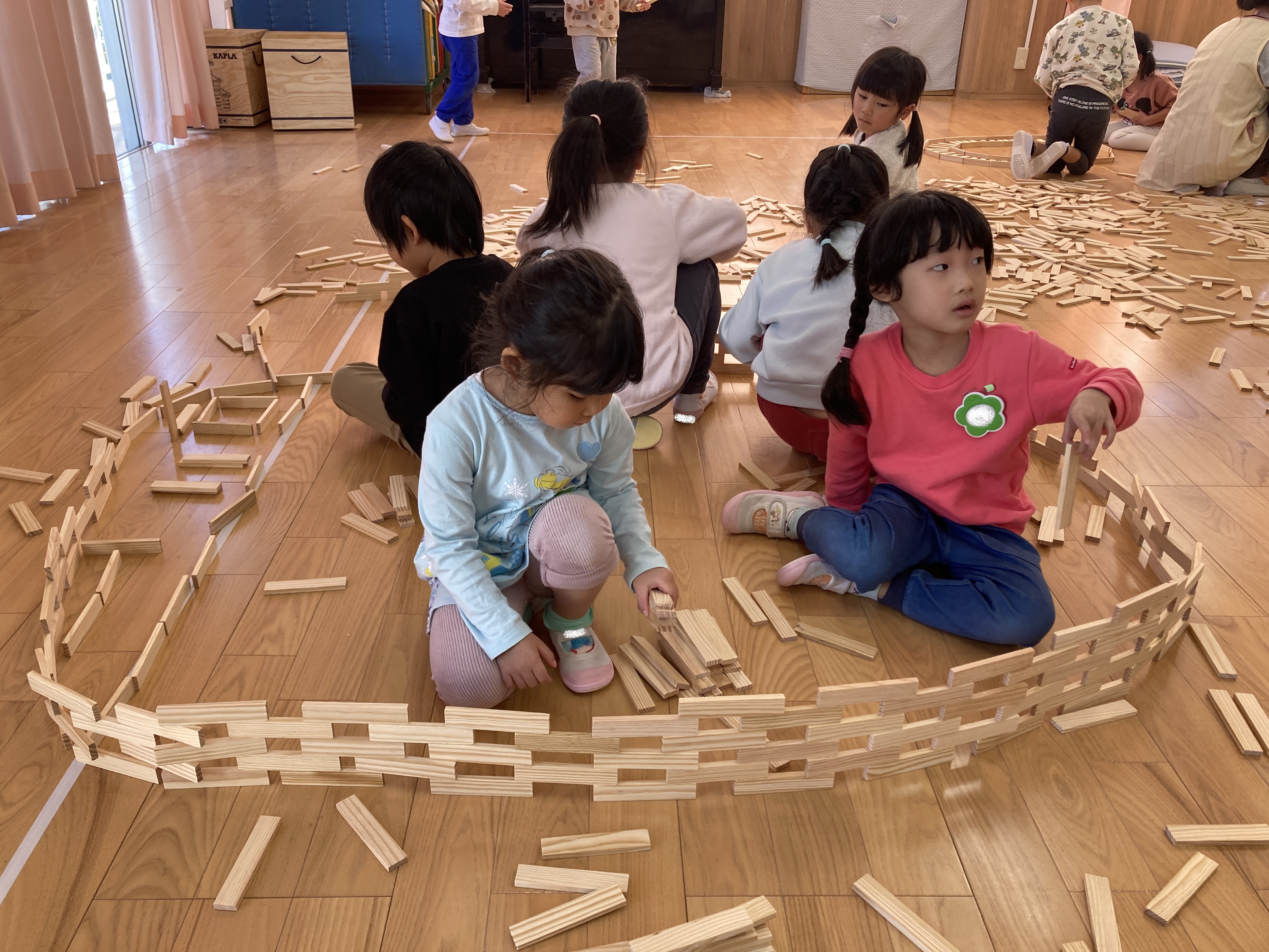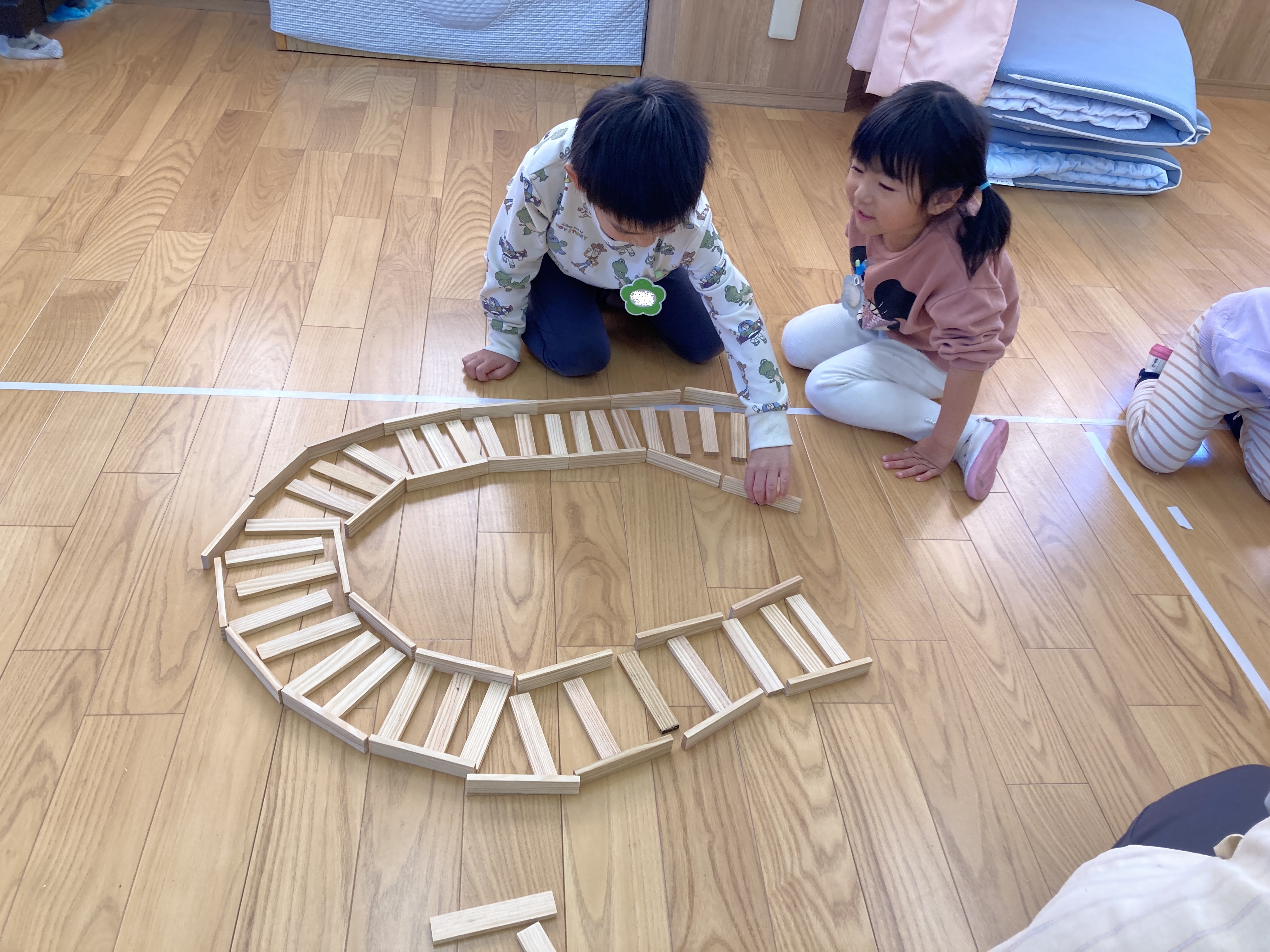 今までの積み上げることがメインだった遊び方から、先生が作ったカプラを見て刺激を受けた子どもは、いつもとは違いイメージをしたものが沢山出来上がりました!また、友達との競争ではなく、一緒に考えながらイメージを共有して作る姿も見られました。