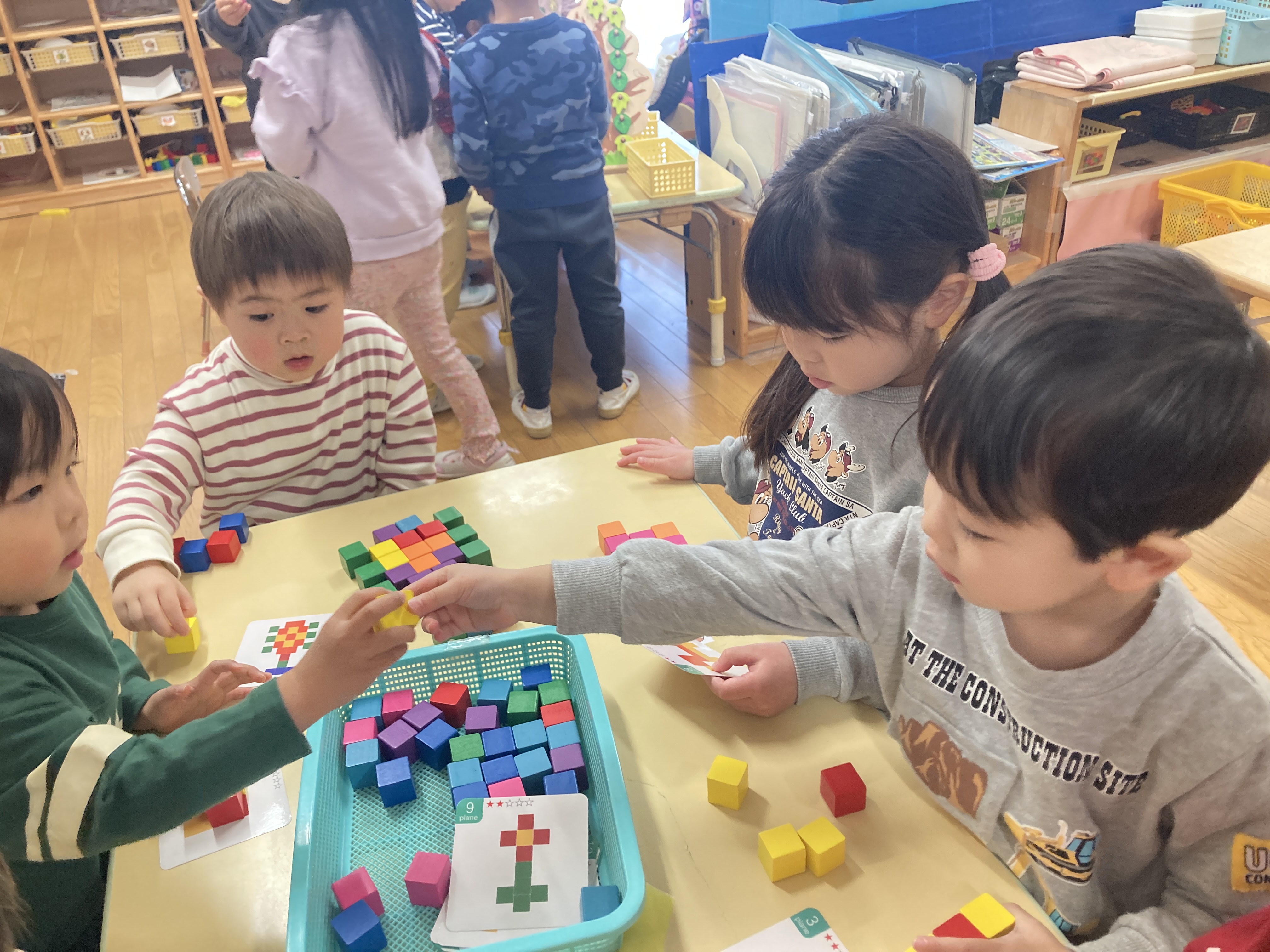 必要なブロックの色を探しながら、「貸して」「いいよ」のやり取りもみられました。