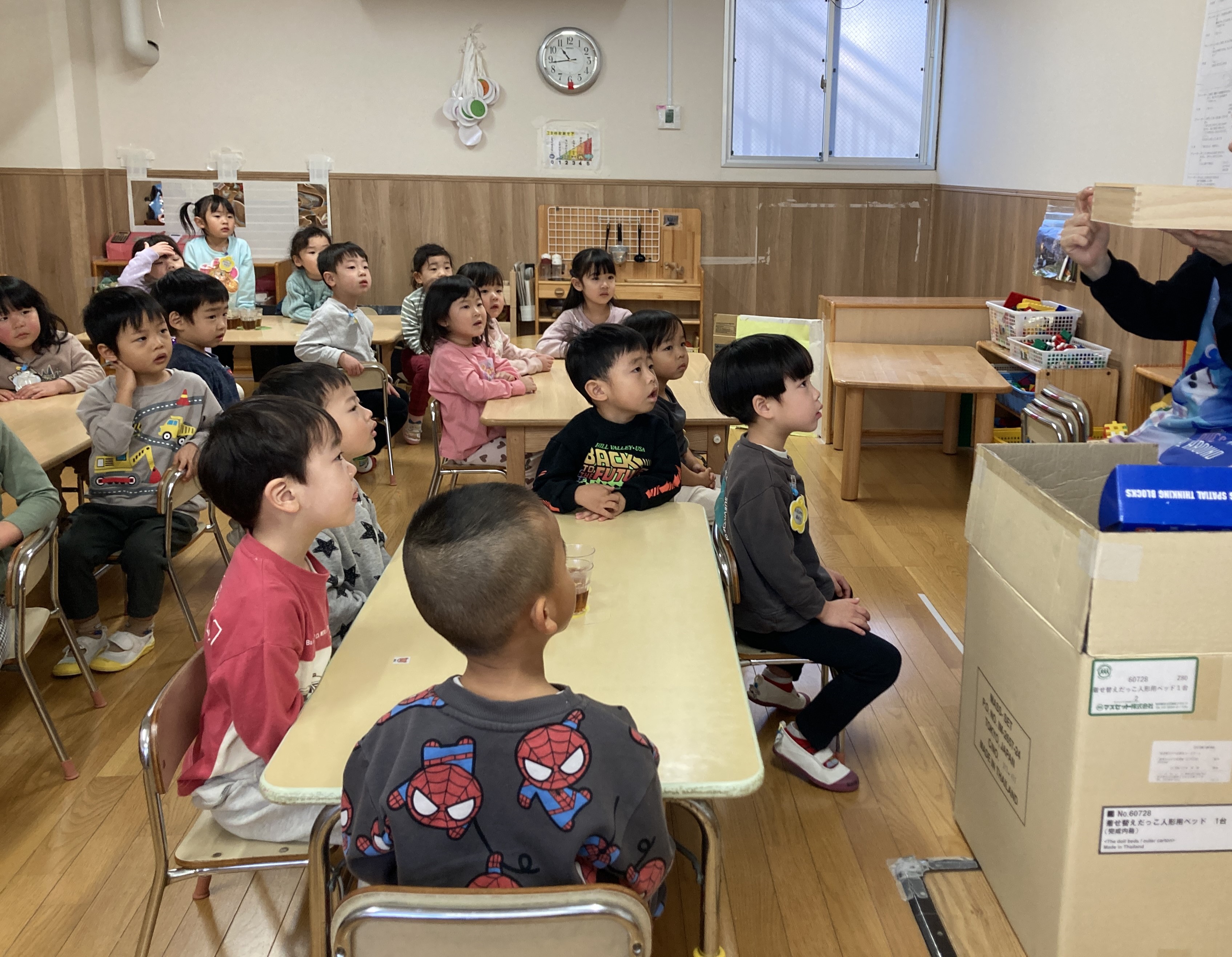 3歳児、ぱんだ組のお部屋に新しい玩具が増えたので、どんな玩具かみんなに紹介をしました。