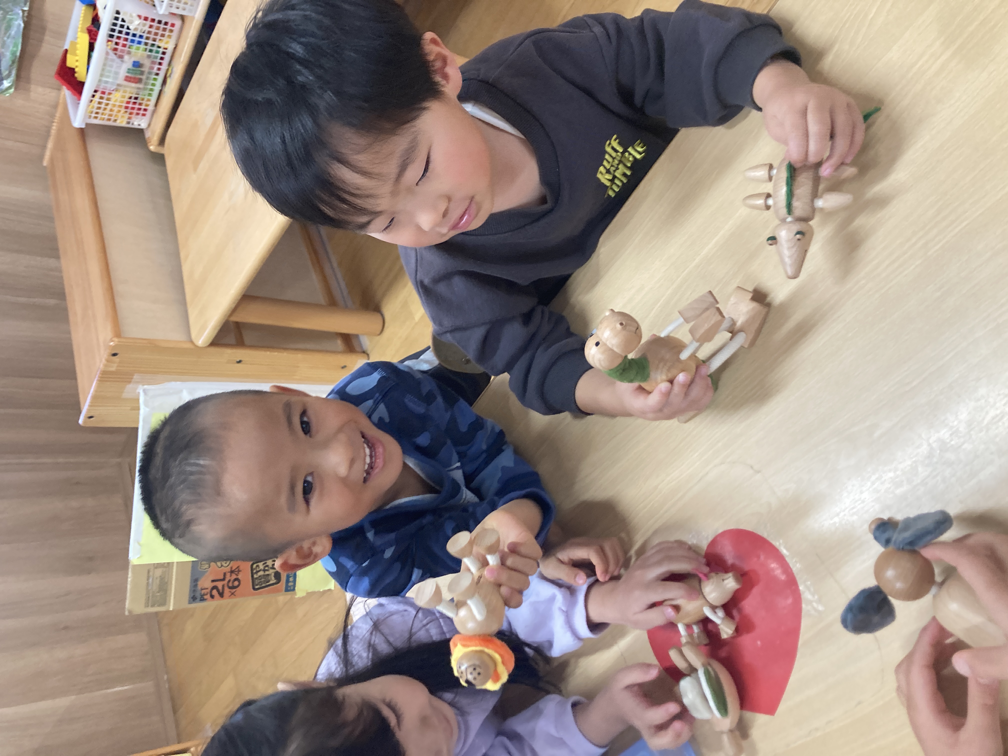 可愛らしい木の人形たちを使ってごっこ遊びを楽しんでいました。