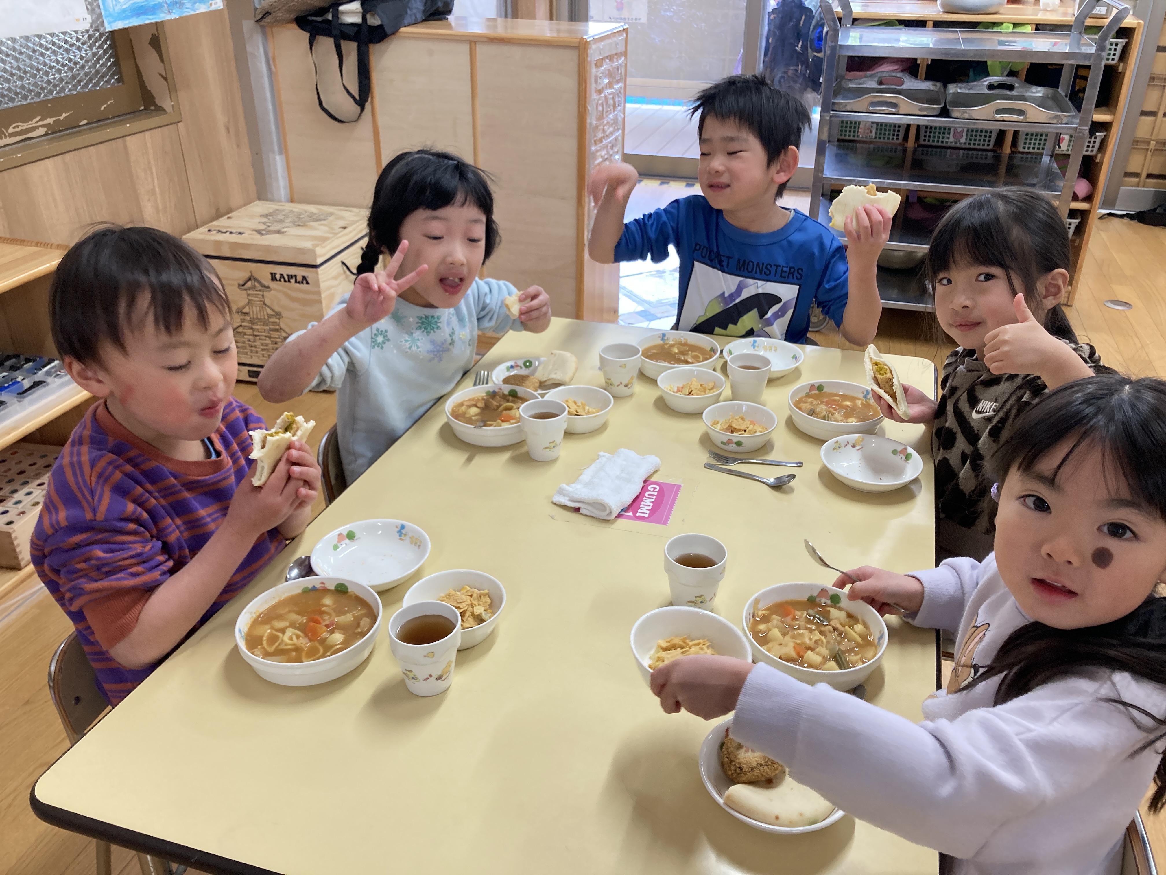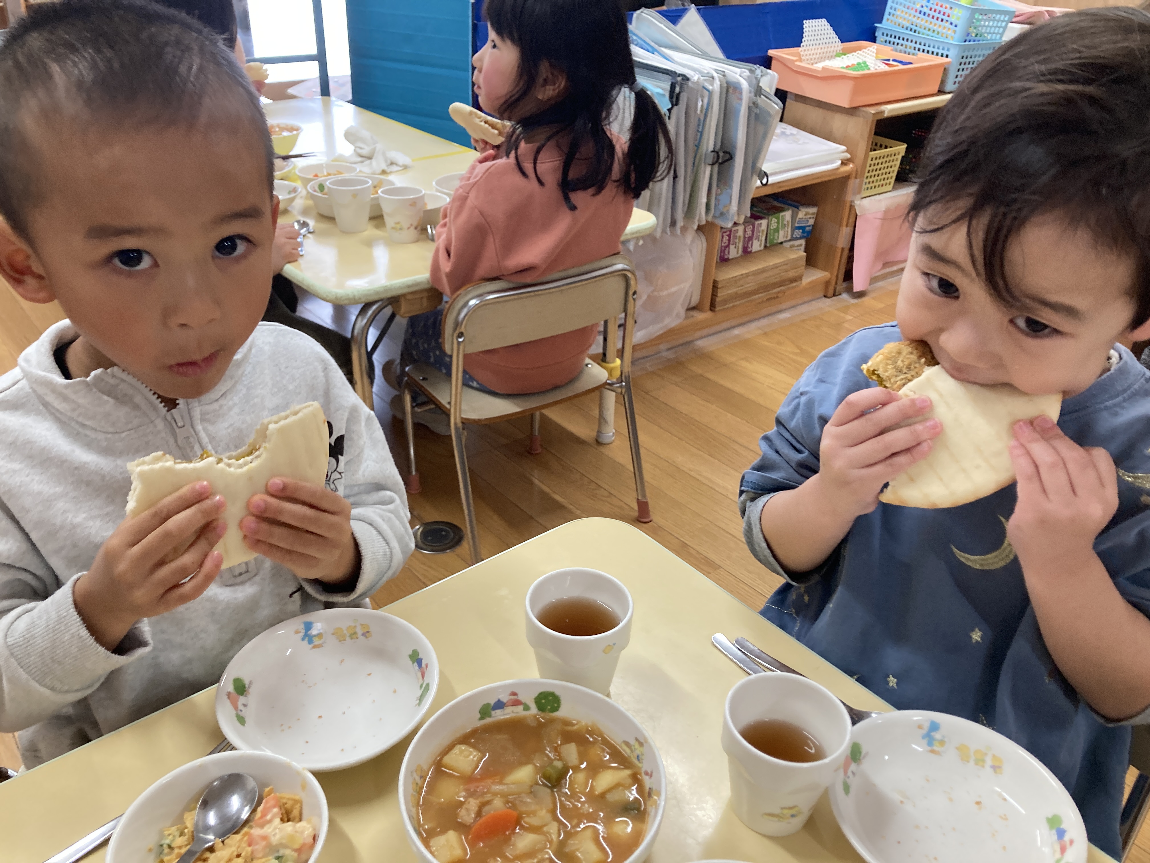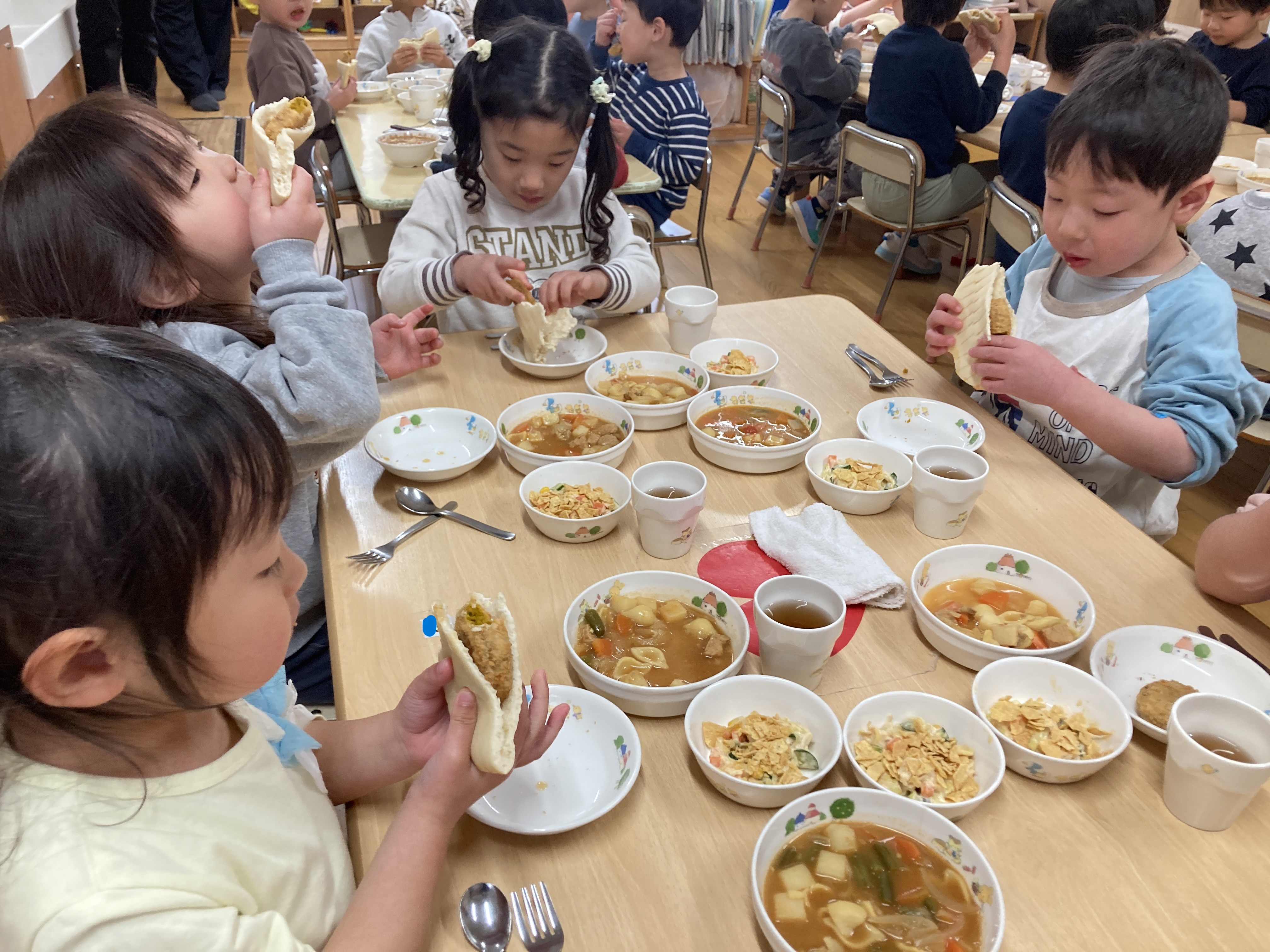 「今日はおひさまコロッケが入っているね」と嬉しそうに食べる子どもたち、「ピタパンの中にはさんでもいい?」とピタパンの中にサラダやコロッケを入れたり、ピタパンをカレーシチューにつけたりとそれぞれ自由に楽しみながら美味しく食べていました。はさむ楽しさと、はさんだ後の美味しさとわくわくでいっぱいの給食でした。