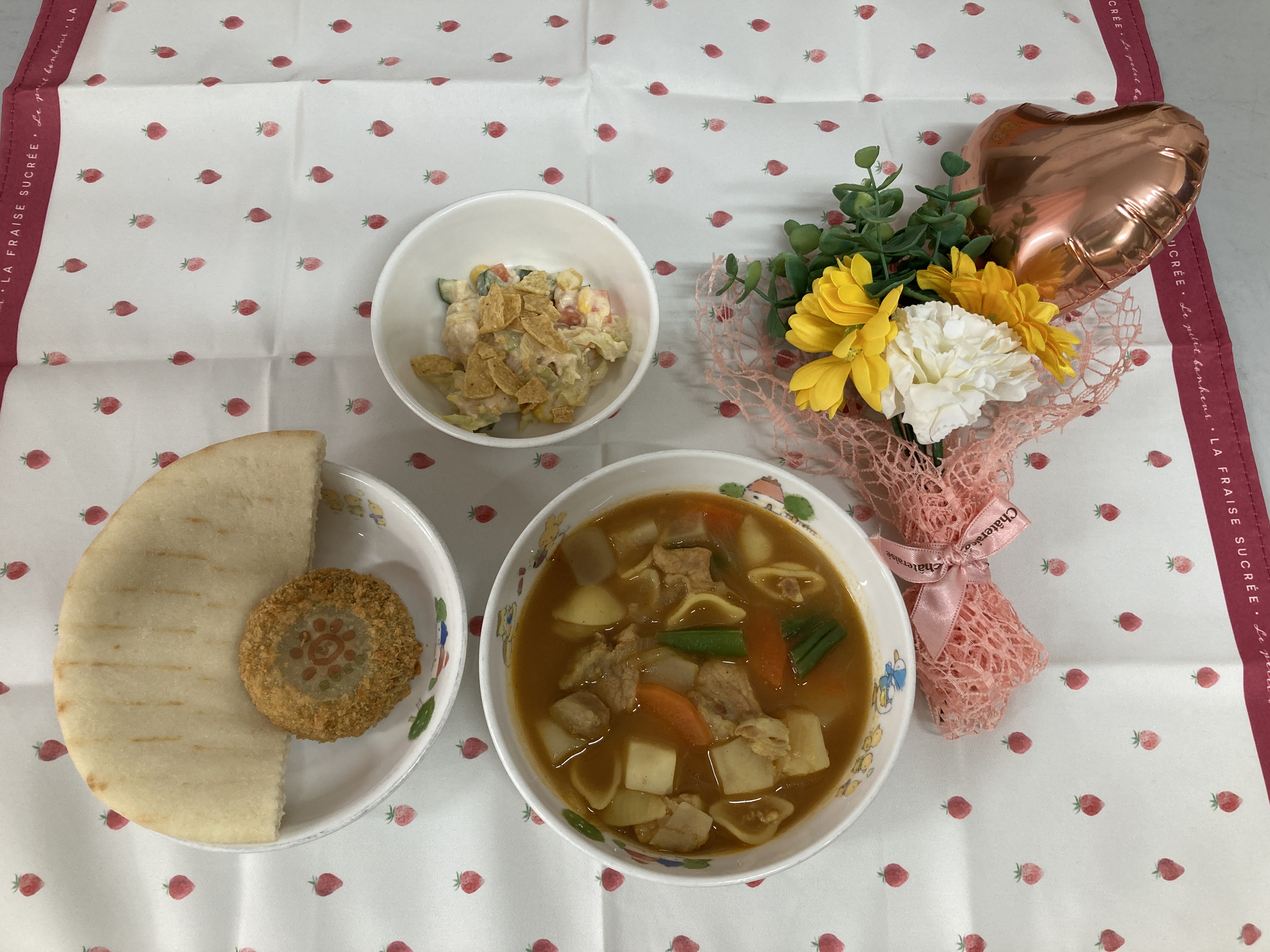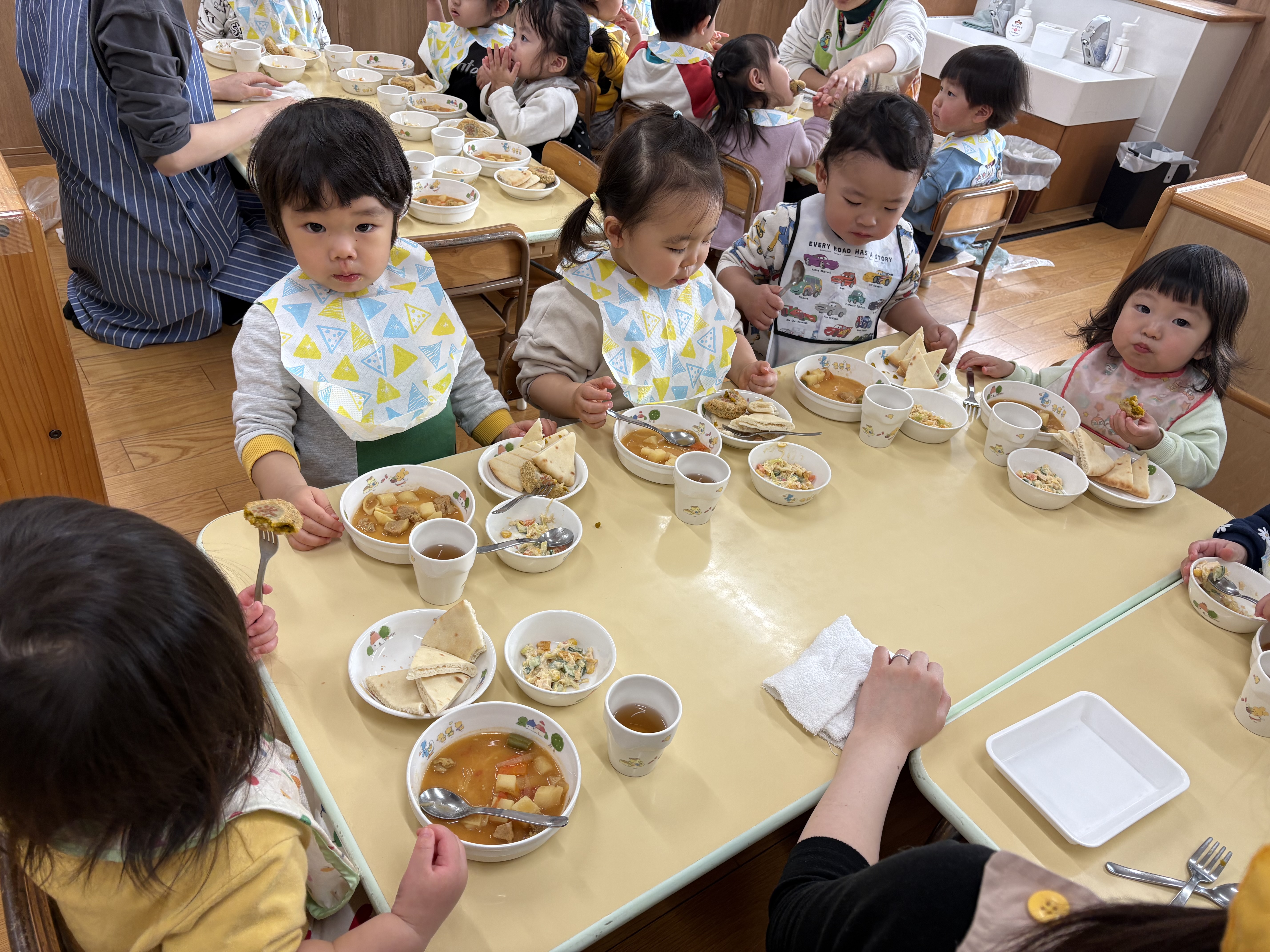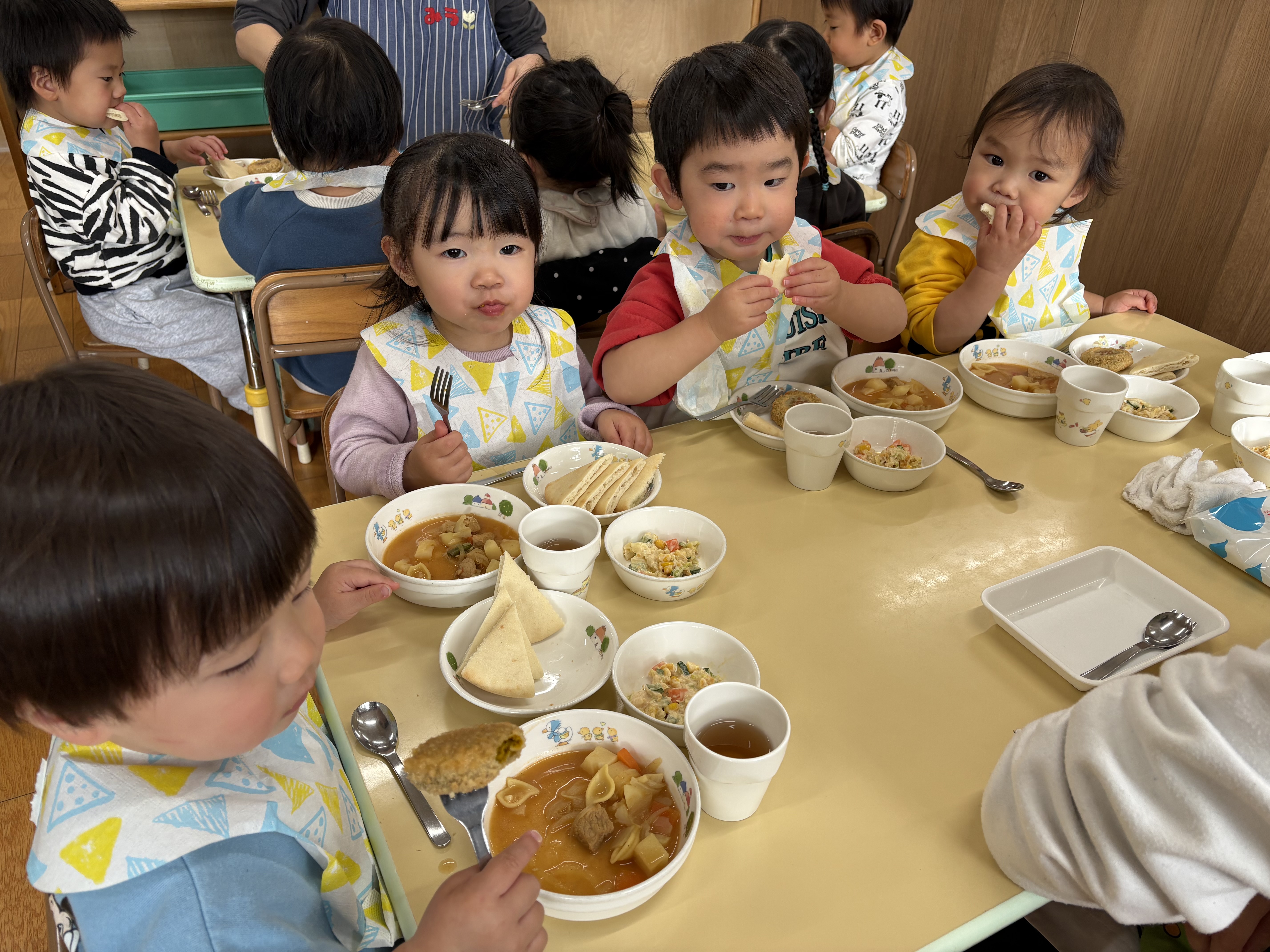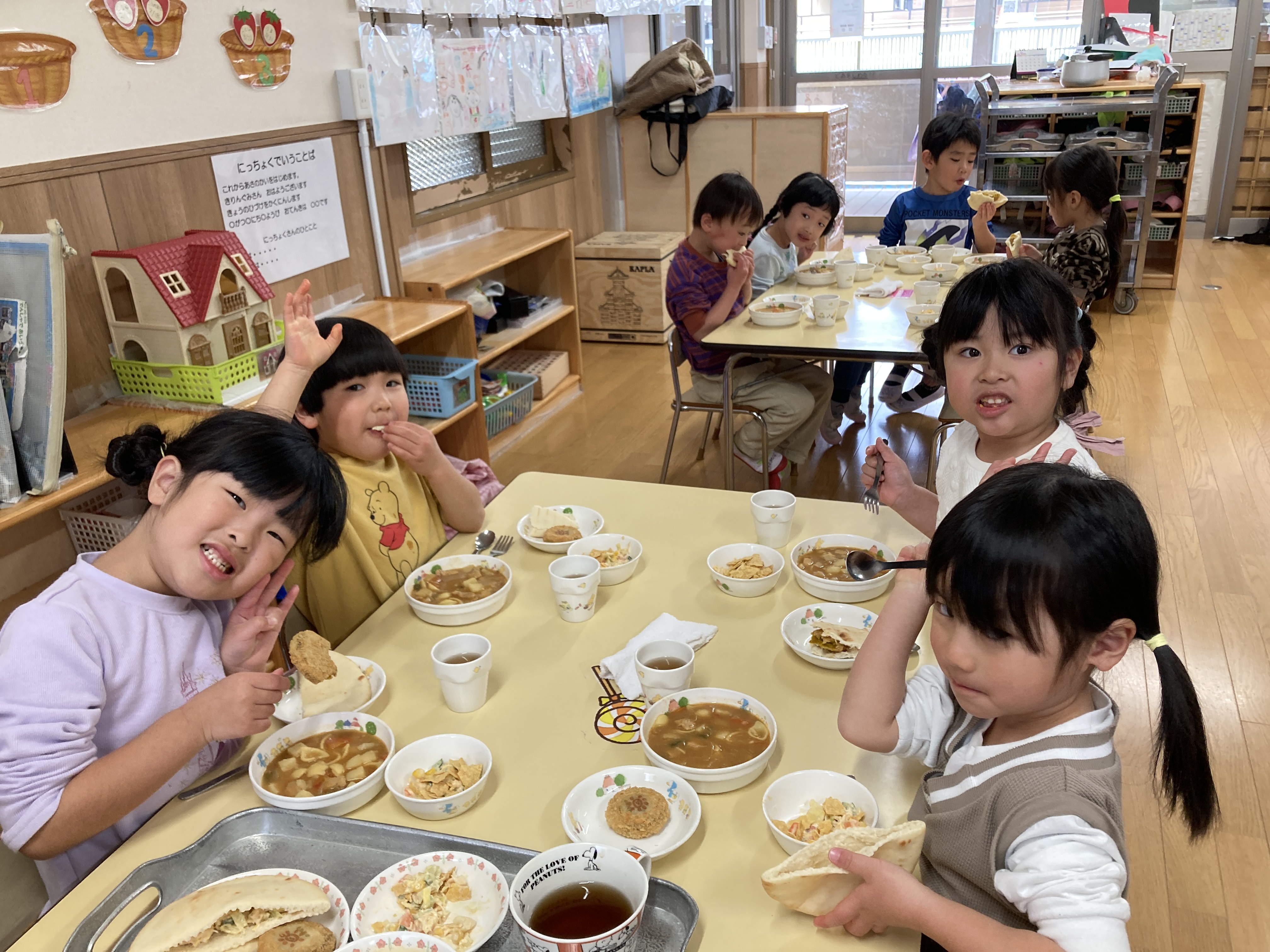 「今日はおひさまコロッケが入っているね」と嬉しそうに食べる子どもたち、「ピタパンの中にはさんでもいい?」とピタパンの中にサラダやコロッケを入れたり、ピタパンをカレーシチューにつけたりとそれぞれ自由に楽しみながら美味しく食べていました。はさむ楽しさと、はさんだ後の美味しさとわくわくでいっぱいの給食でした。