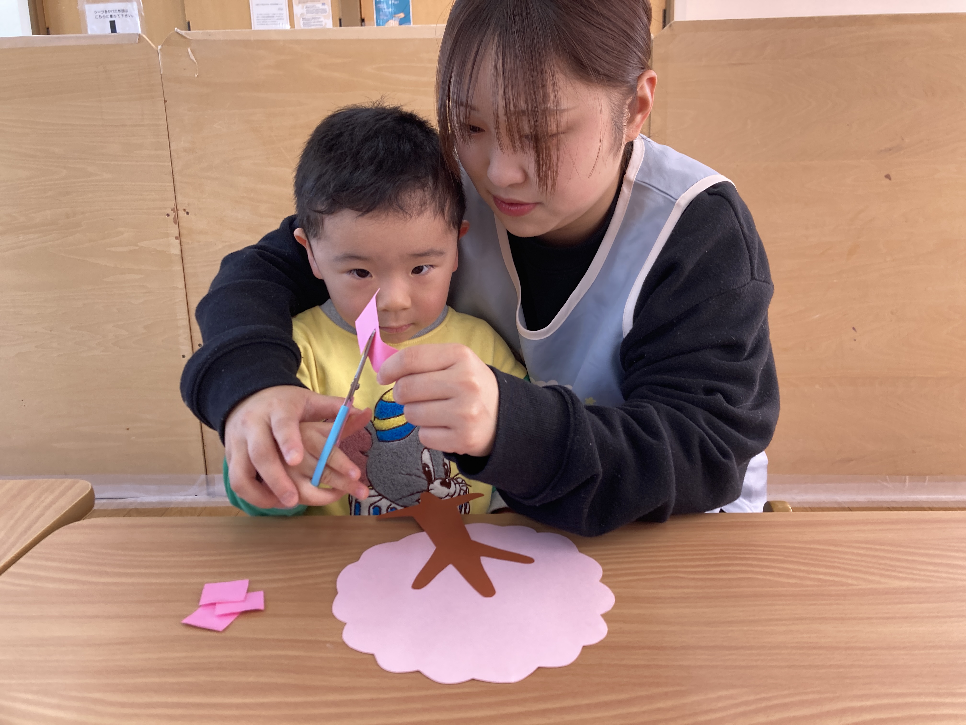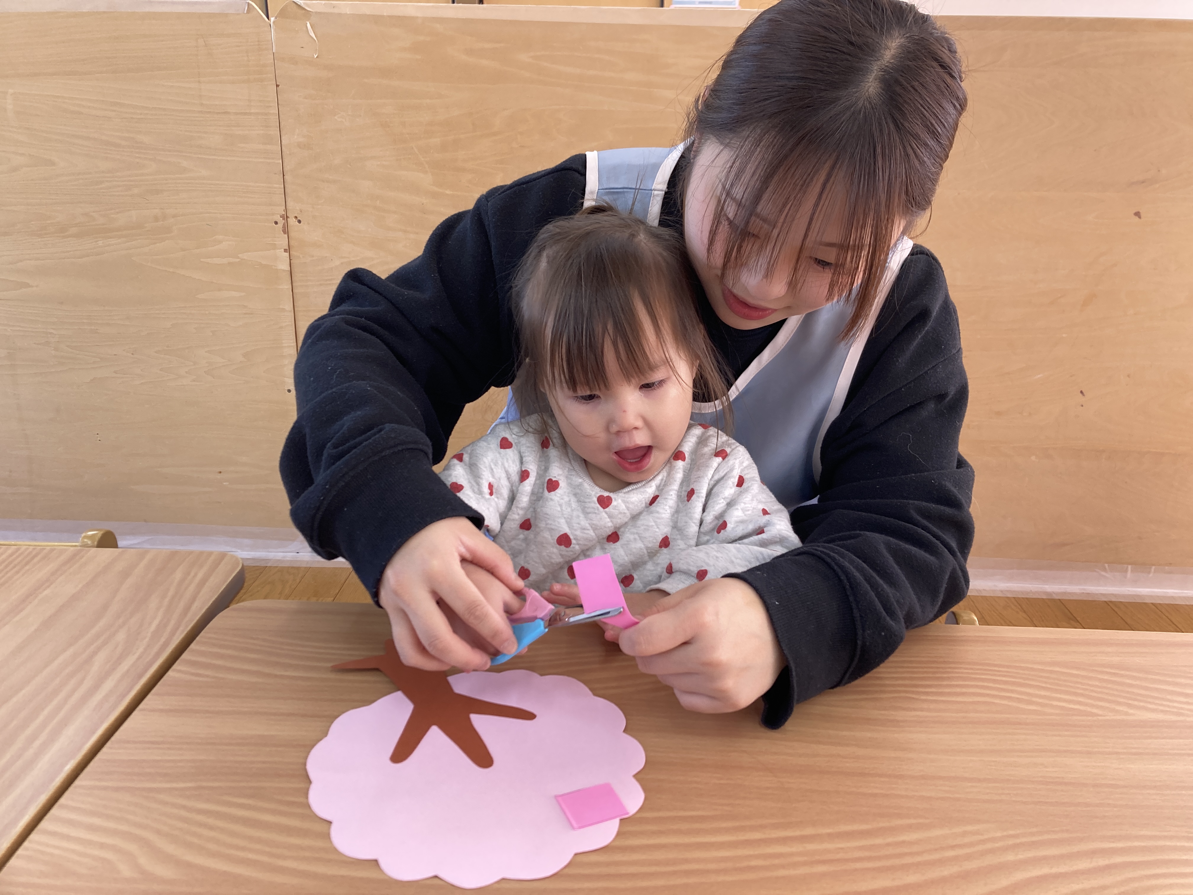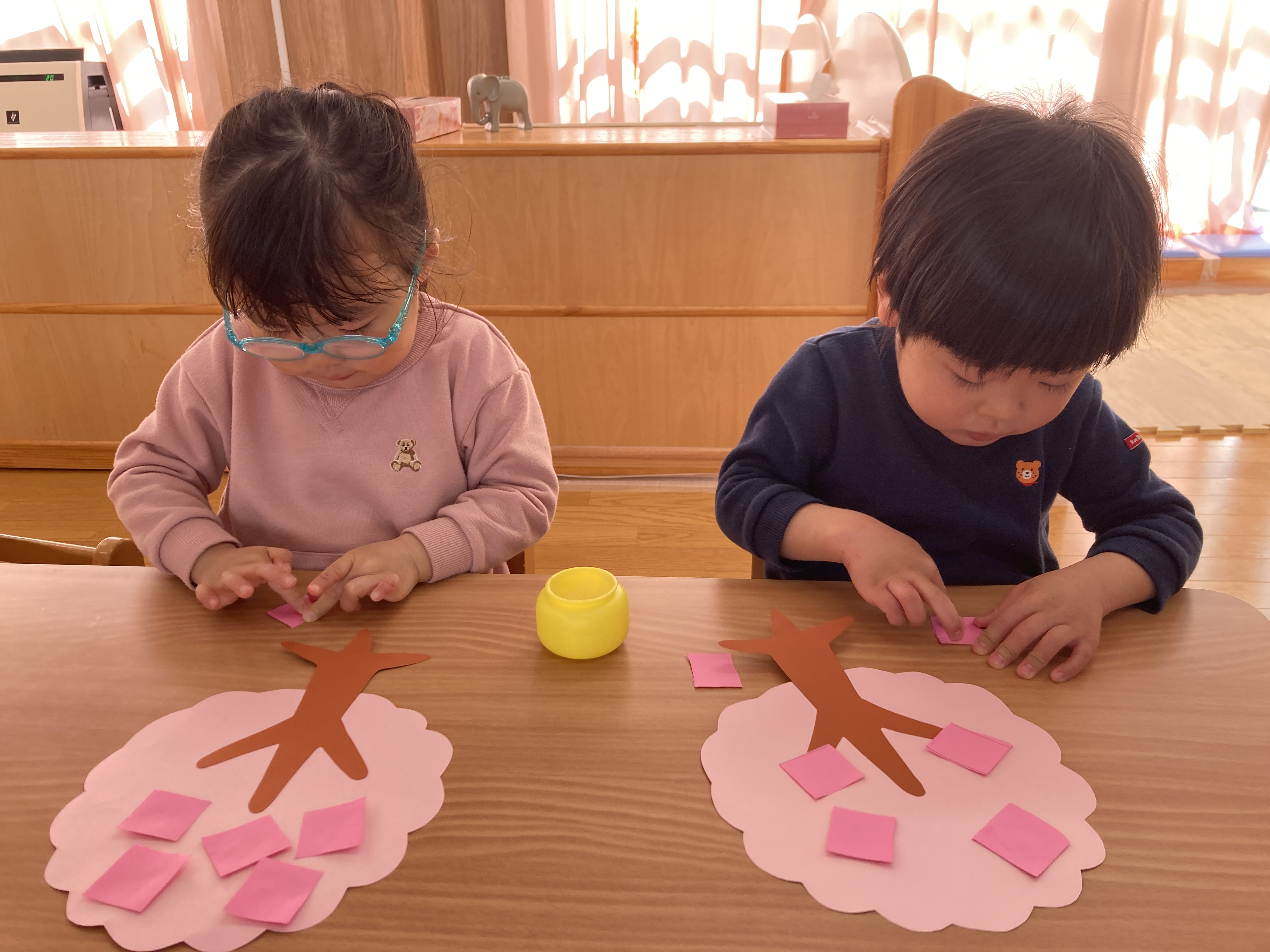 完成した桜を見ると「桜かわいいね」「桜見るの楽しみだね」と桜の開花を楽しみにしていた子ども達です。