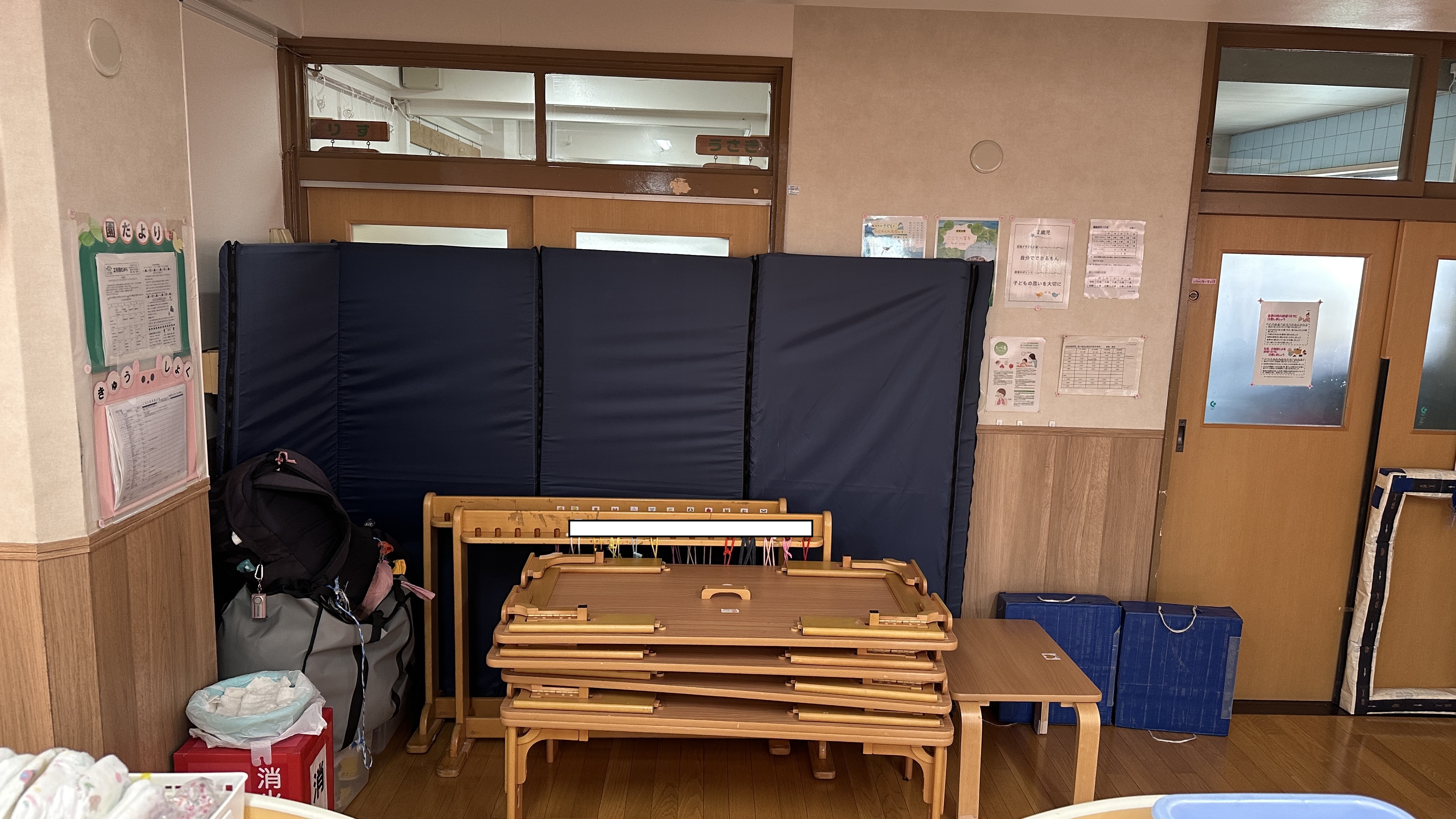 不審者からの侵入を防げるように、避難したお部屋とホールでは、バリケードを作って待機していました。