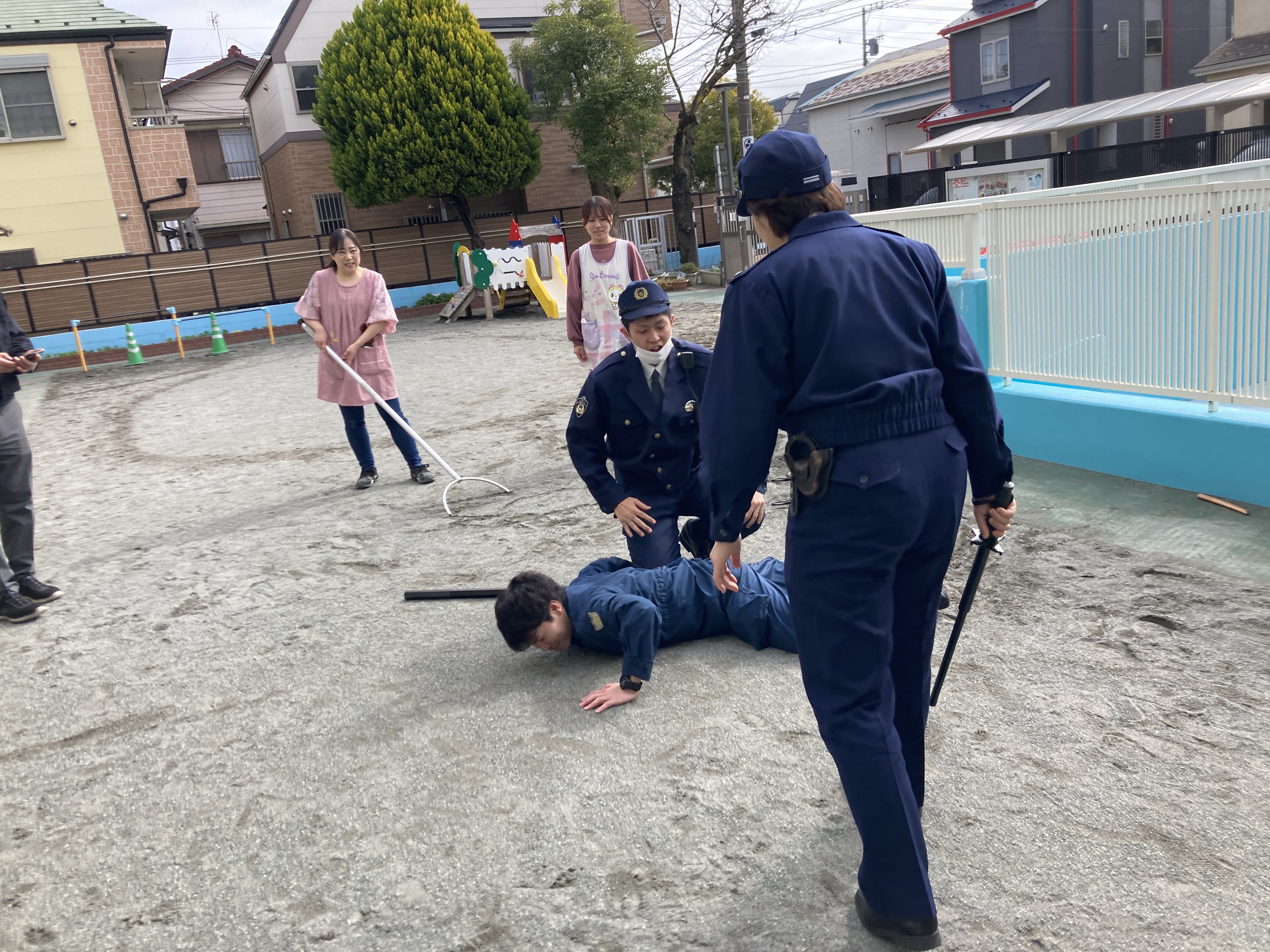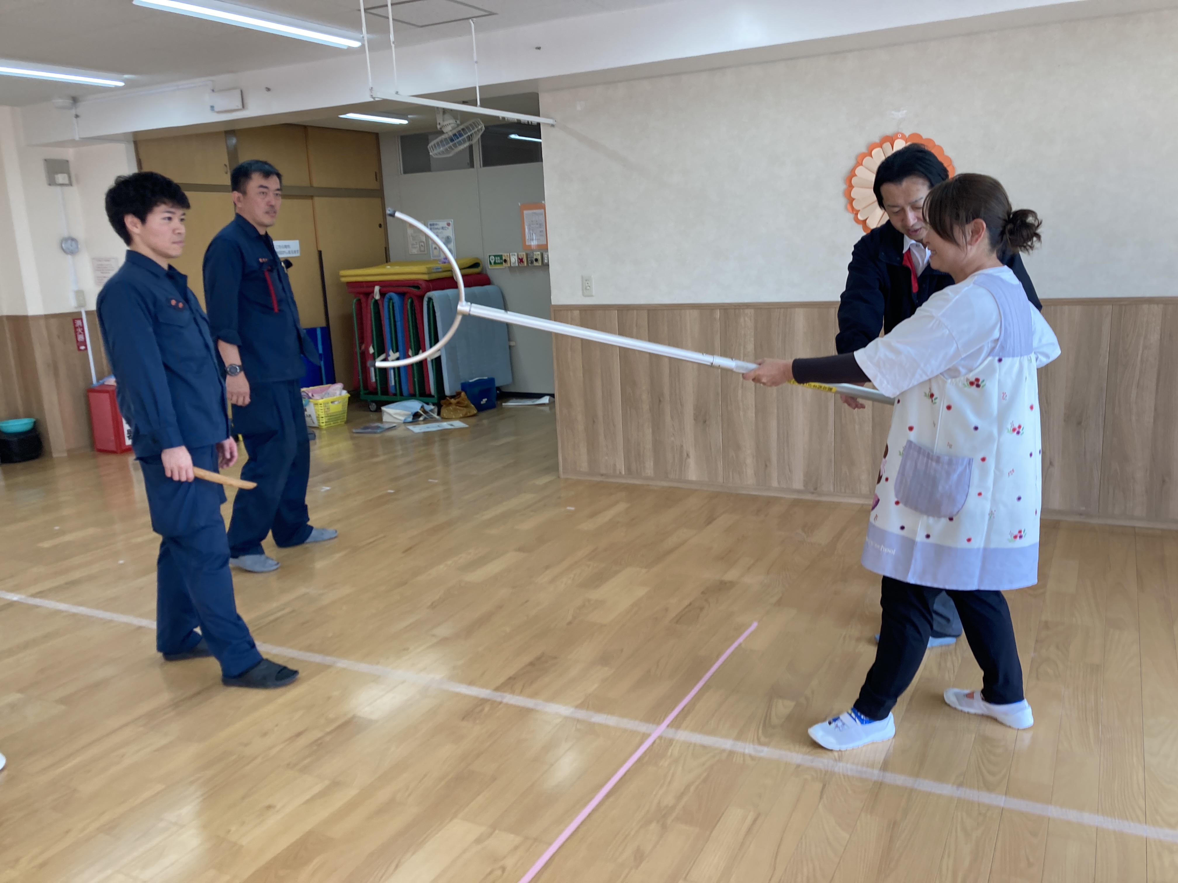 職員に向けて、さすまたの使い方や不審者への対応等をご指導いただきました。