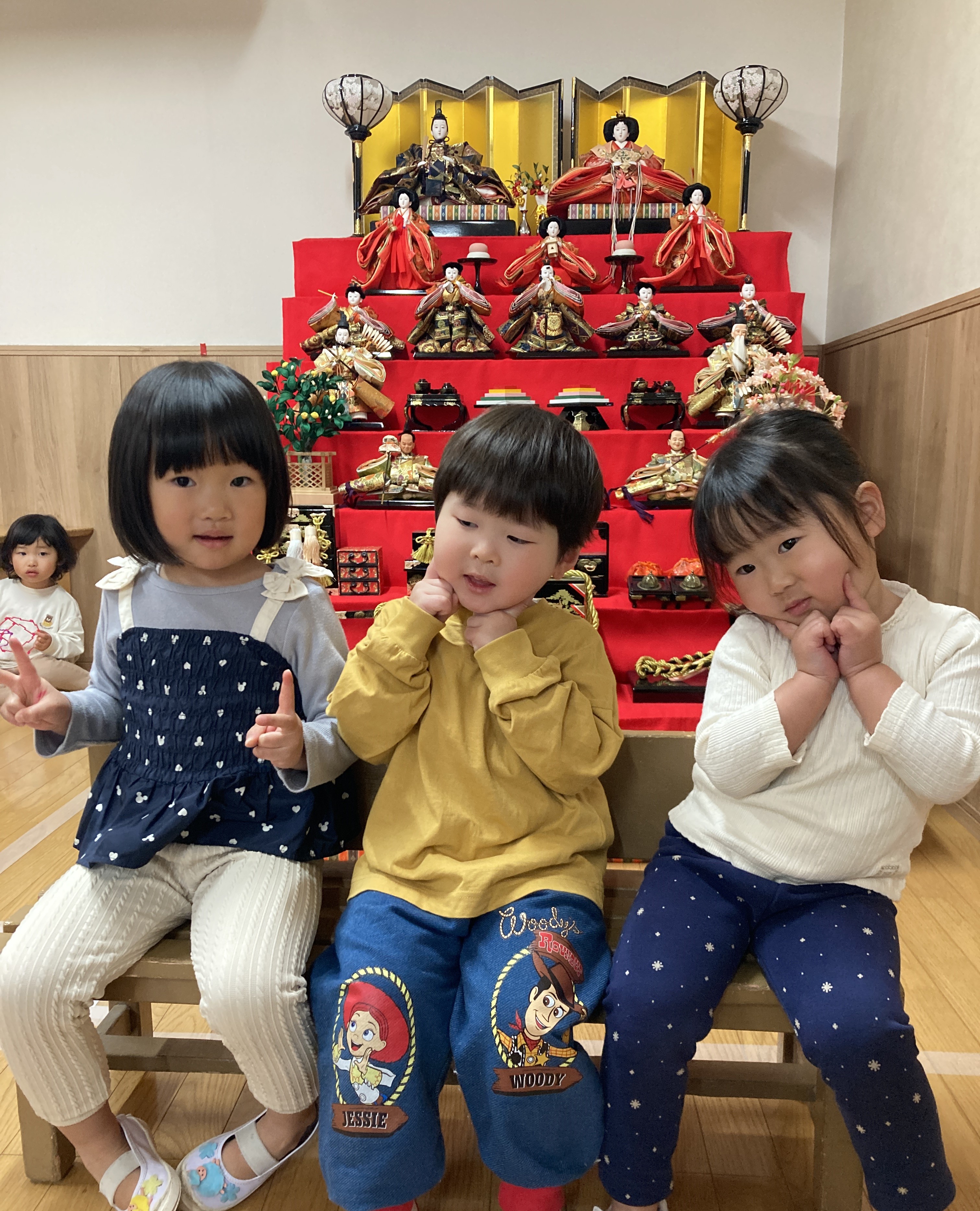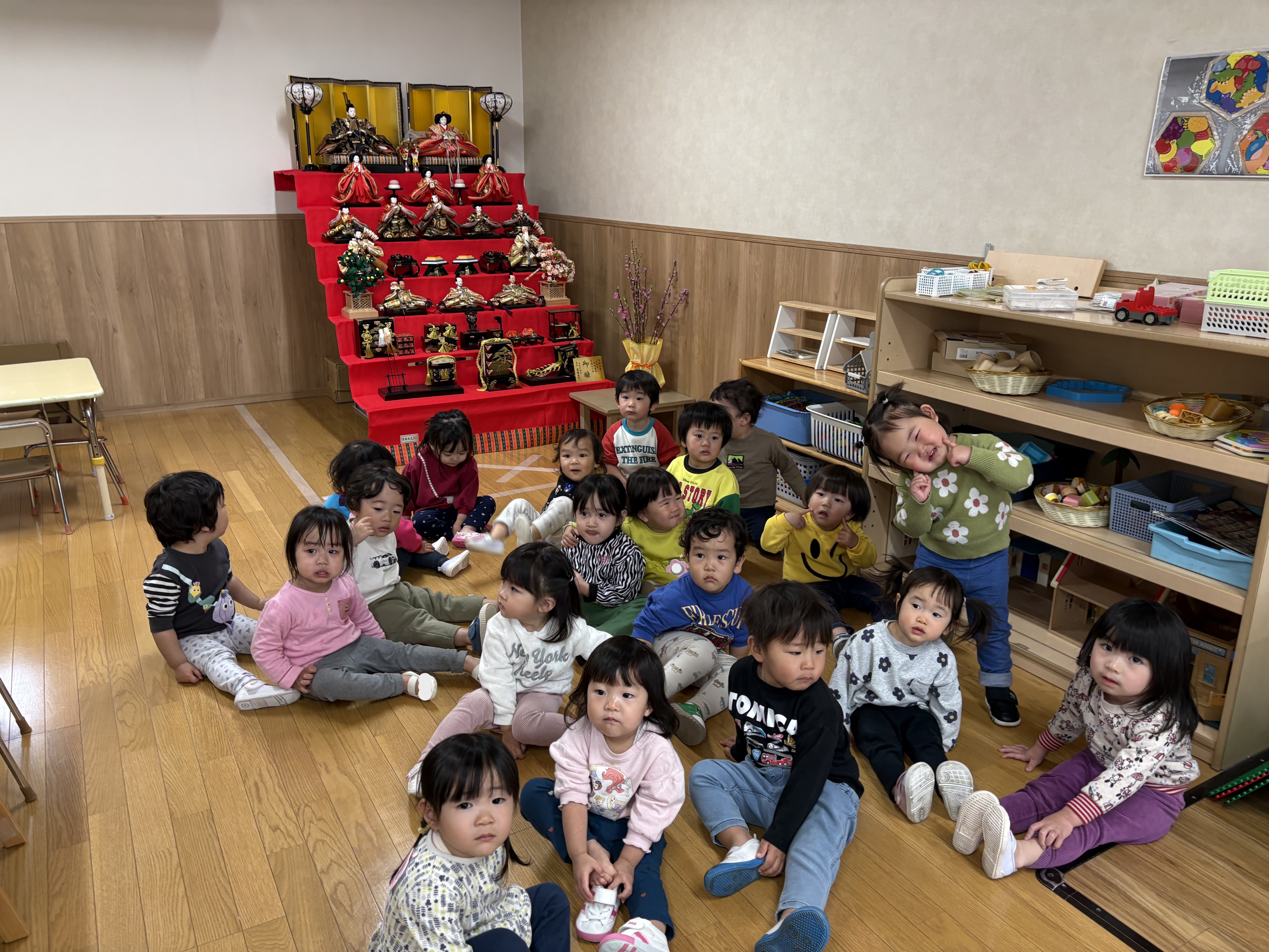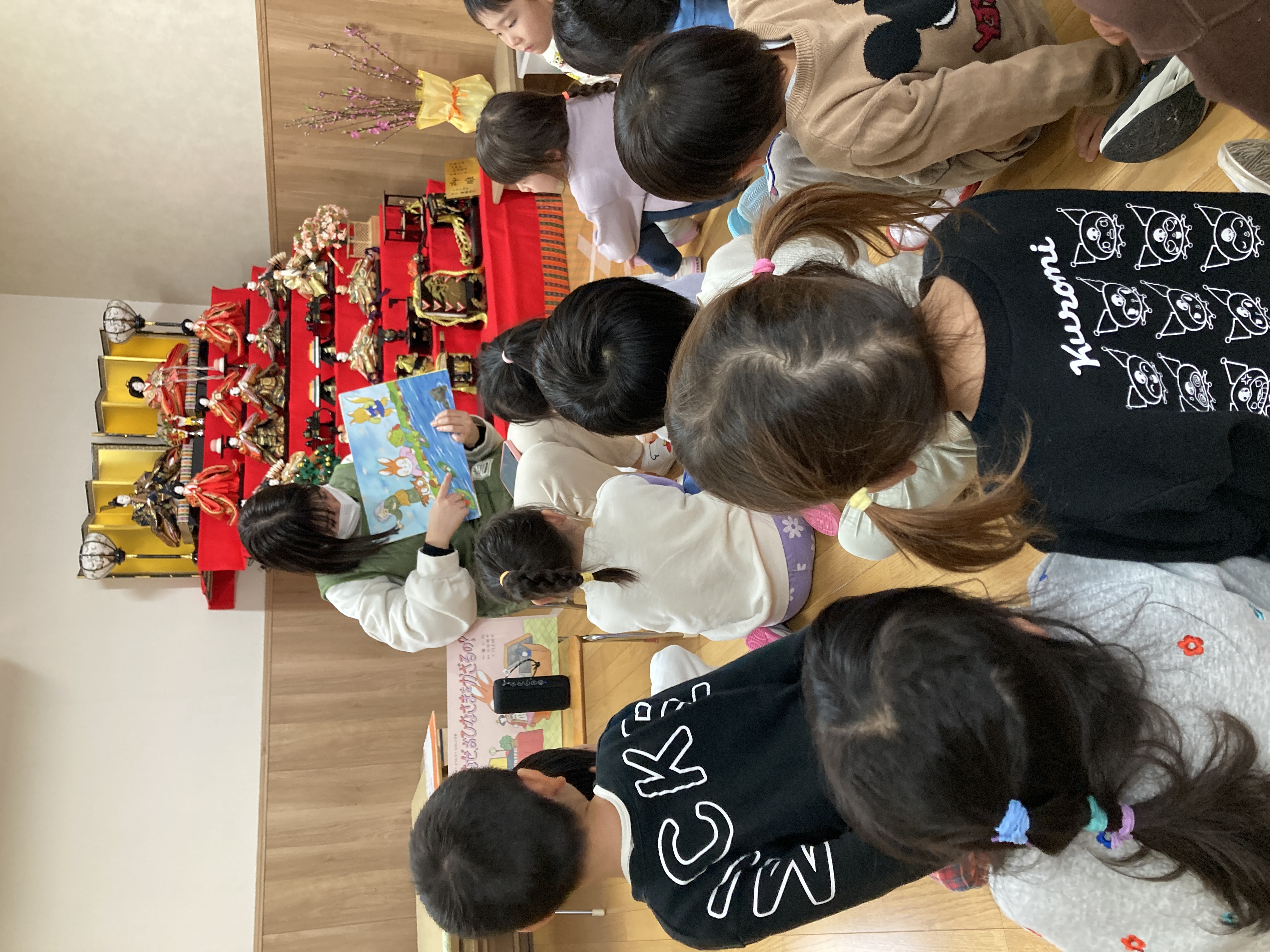 保育園でも大きな雛人形を飾り、各クラスでひな祭りにちなんだ絵本や紙芝居を見て、伝統や由来について知ったり、製作を楽しみました。