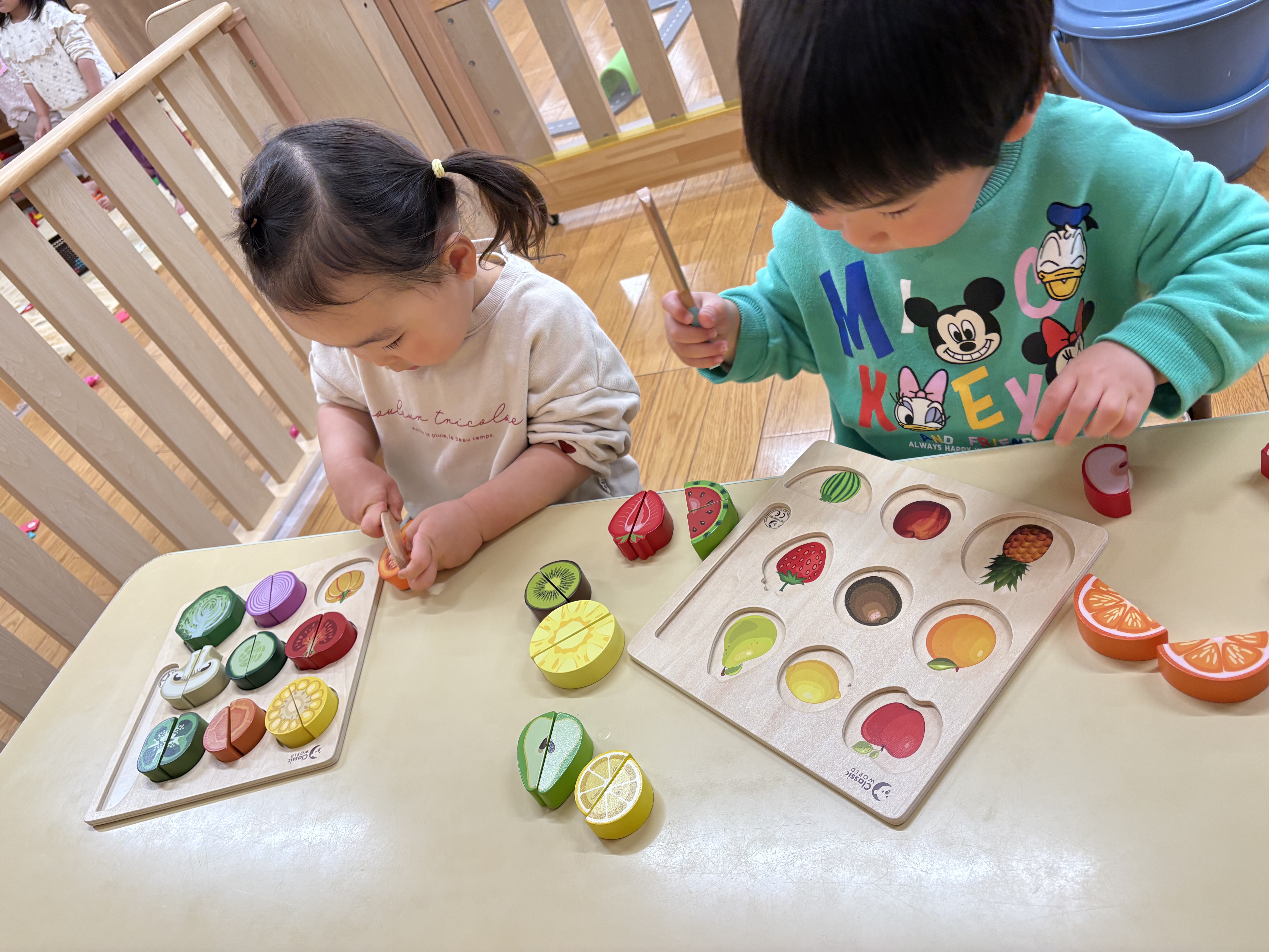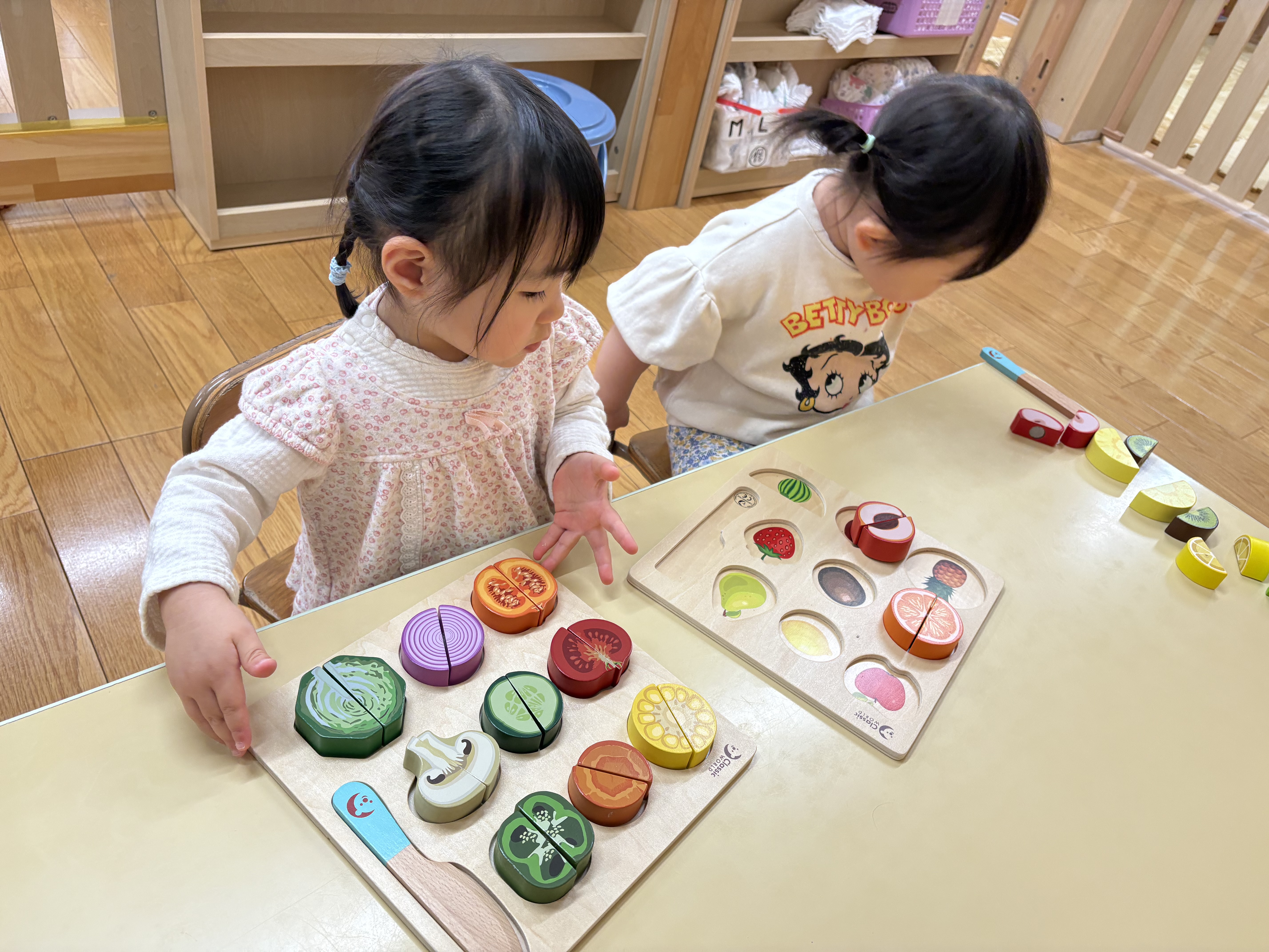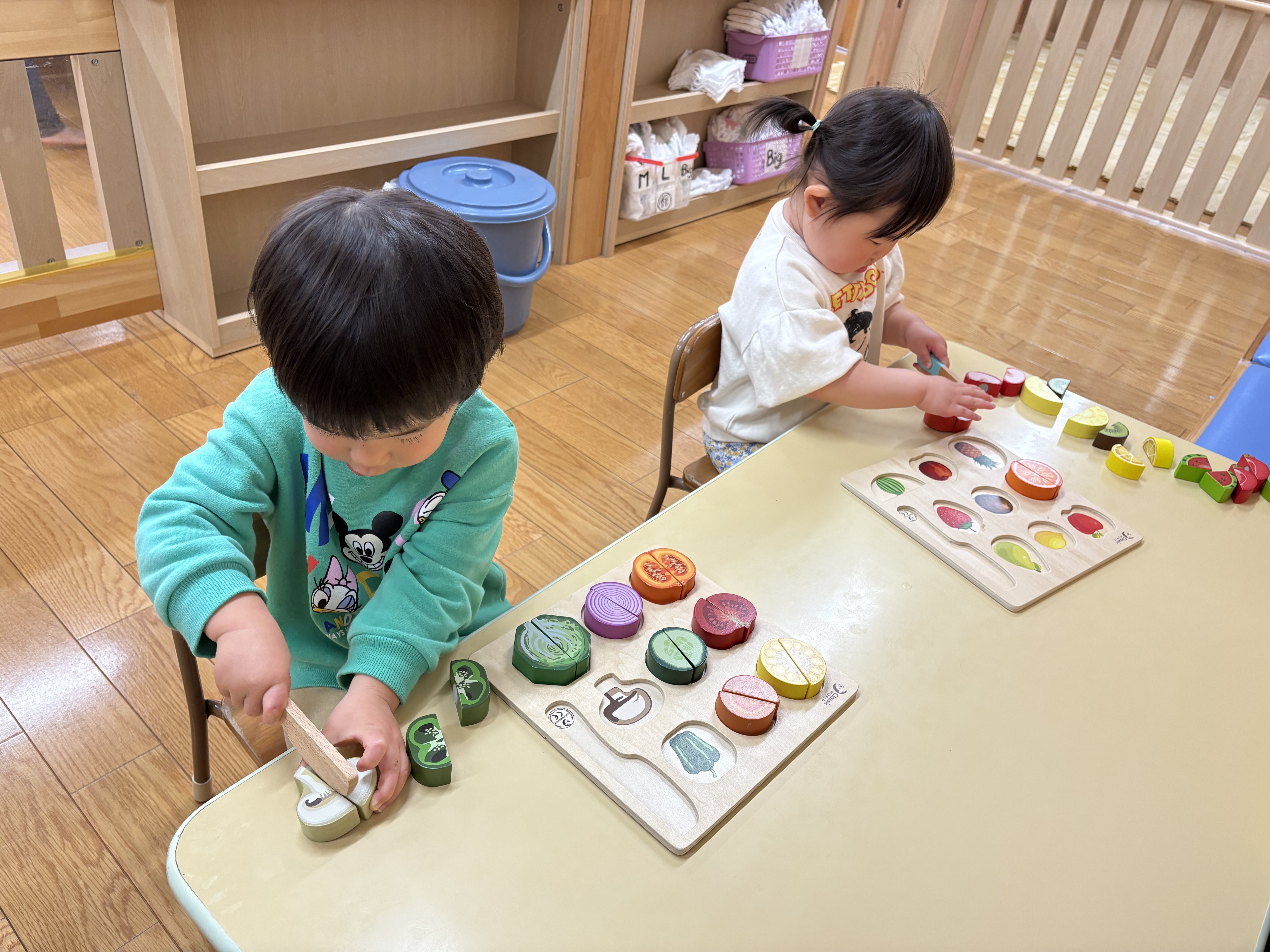 1歳児クラスではパズルの楽しさが分かるようになり、木のパズルで遊ぶ姿が見られるようになりました。果物や野菜を絵の所にはめるだけではなく、付属の包丁でちょきん!切る事も楽しめるパズルで夢中になって遊んでいます。
