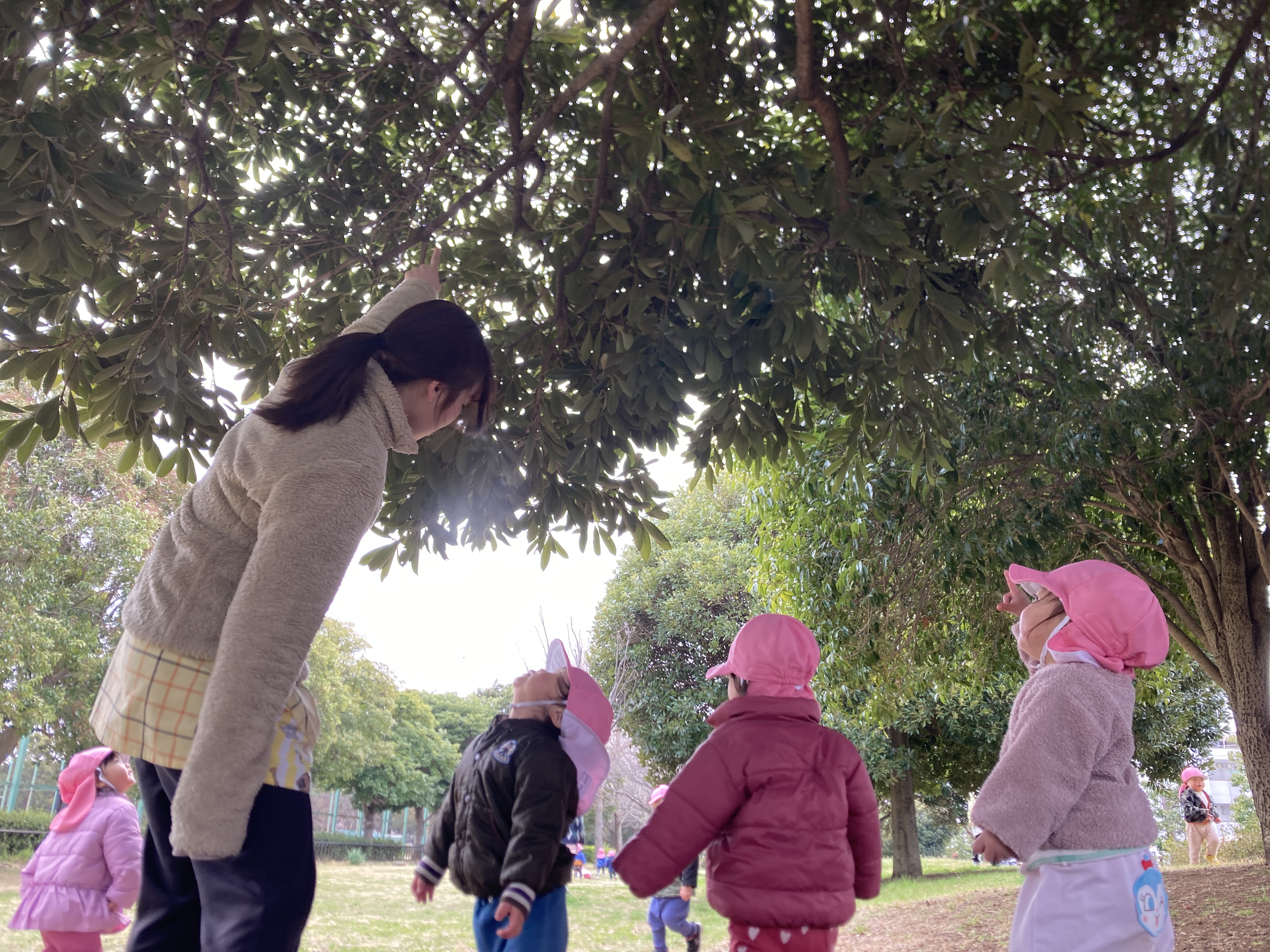 葉っぱの隙間から覗く光を見て、「葉っぱに穴があいてる!」との言葉が子ども達から聞こえてきて、葉っぱの間から空が見えているんだよと伝えると「そら?あっちの空と一緒?」と木がない所へ行って空を指さす姿も見られていました。