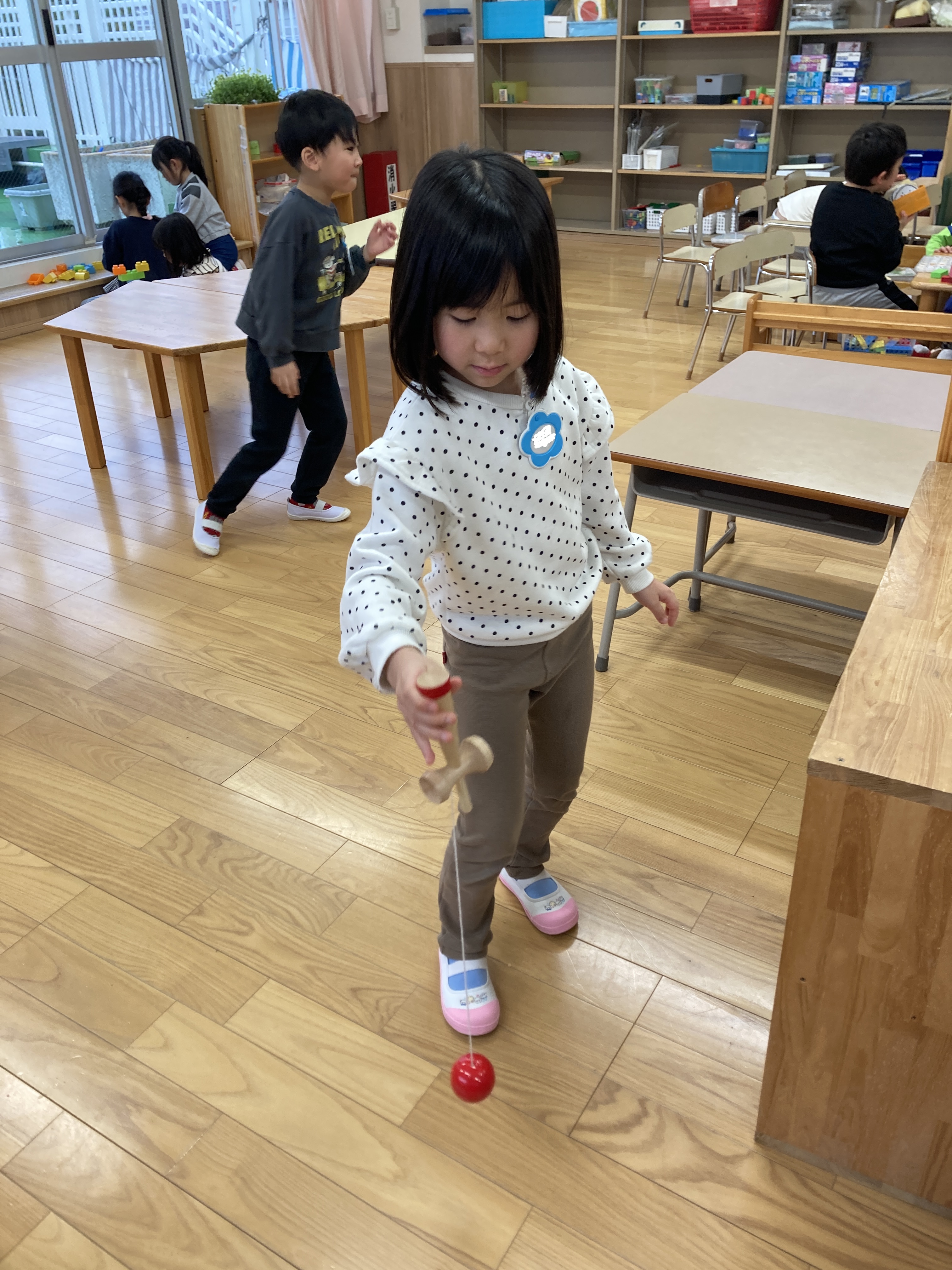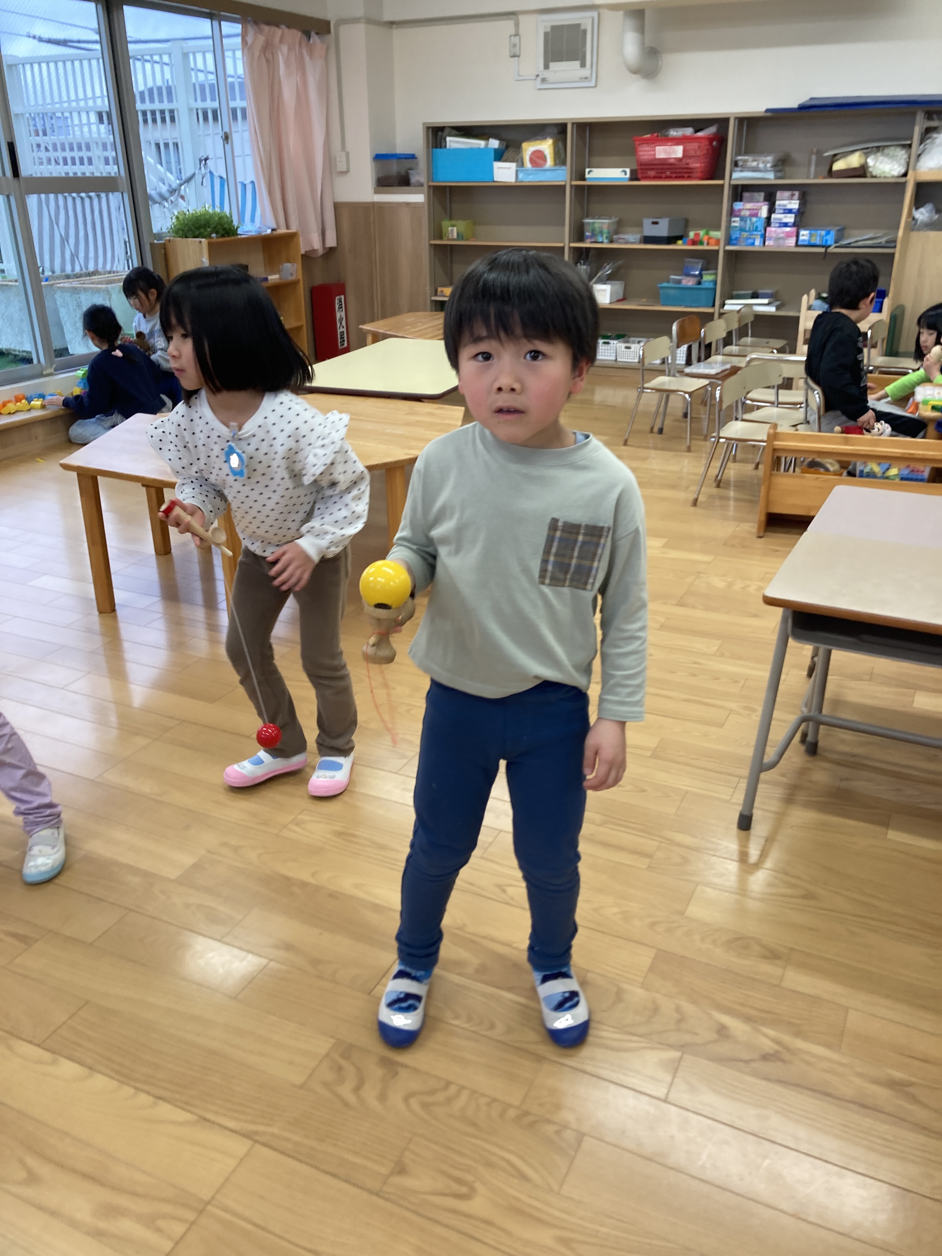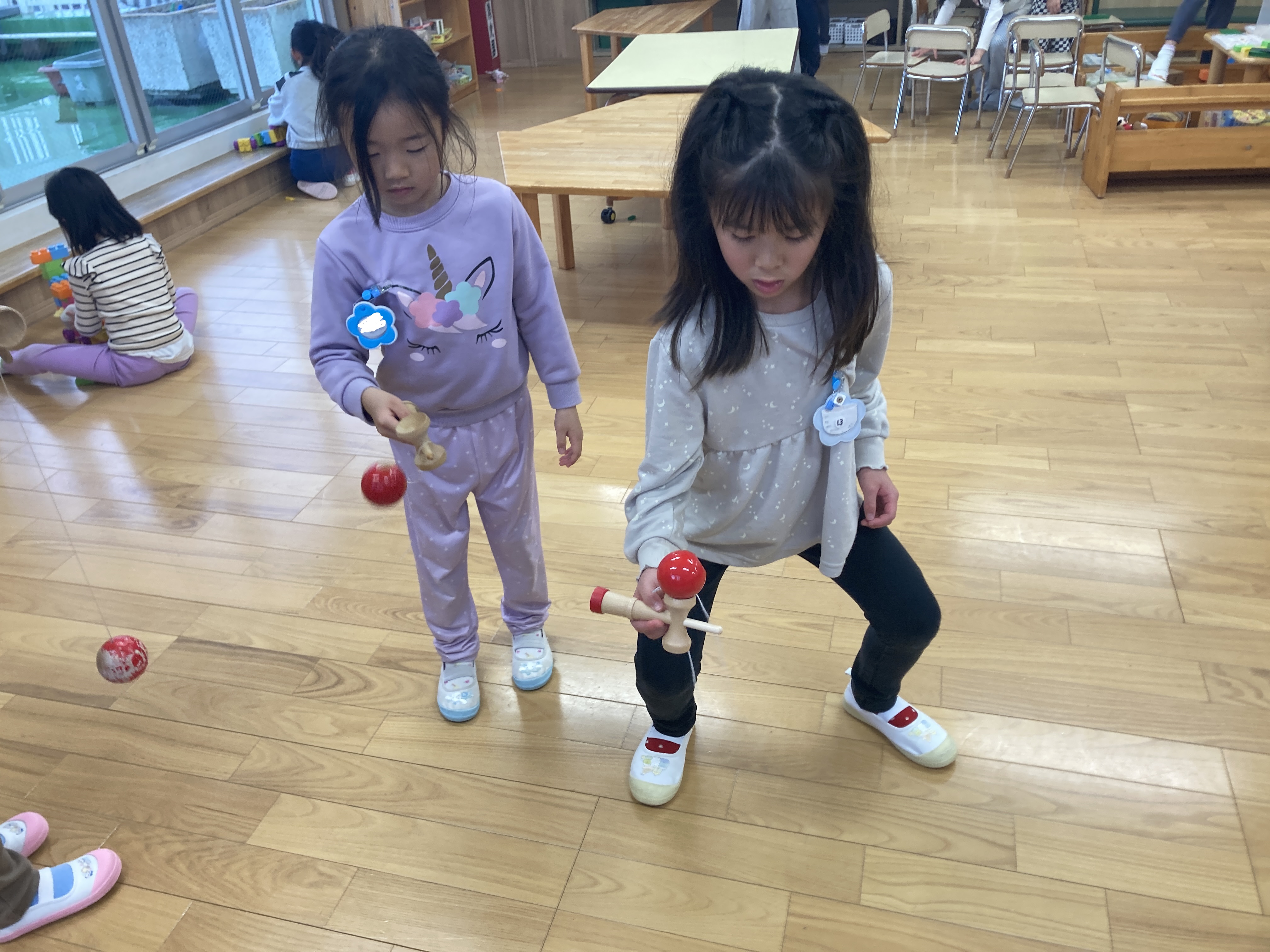 けん玉に触れたことがある子は、お友達に持ち方を教える姿がありました。
