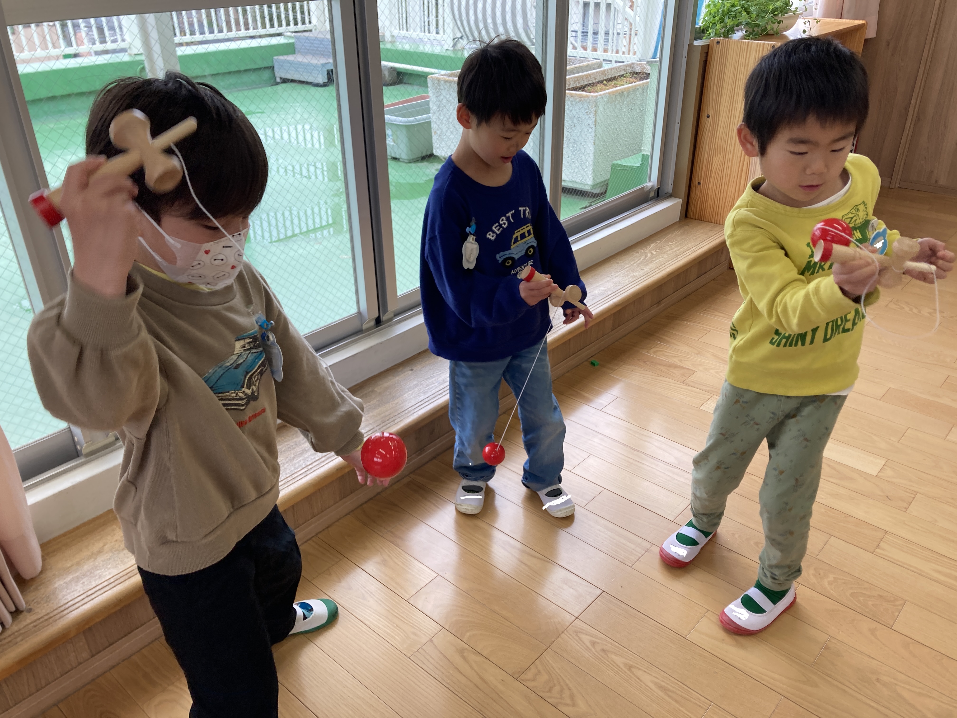 これまで様々な木の玩具で遊んできましたが、今回5歳クラスはけん玉に挑戦。