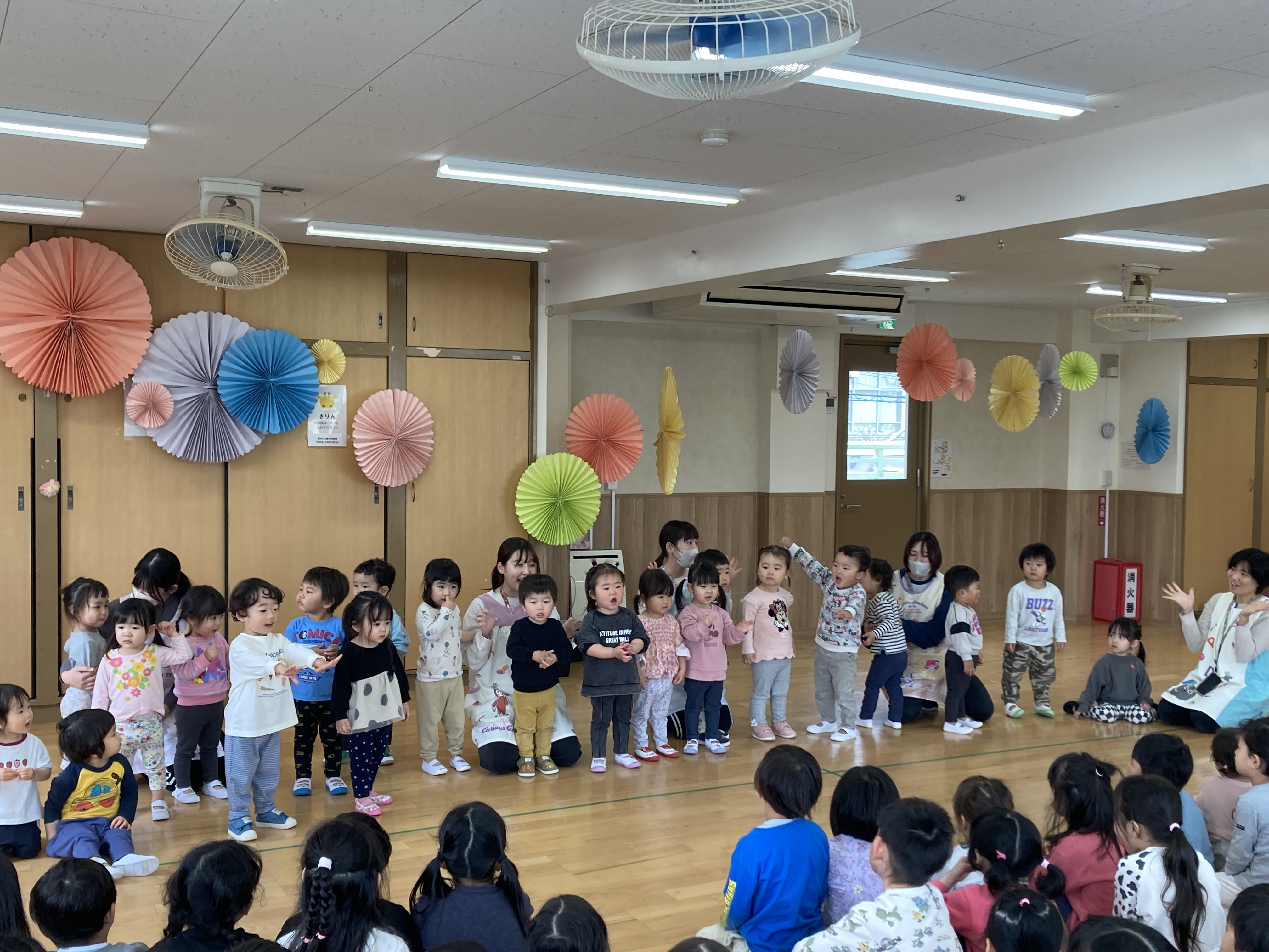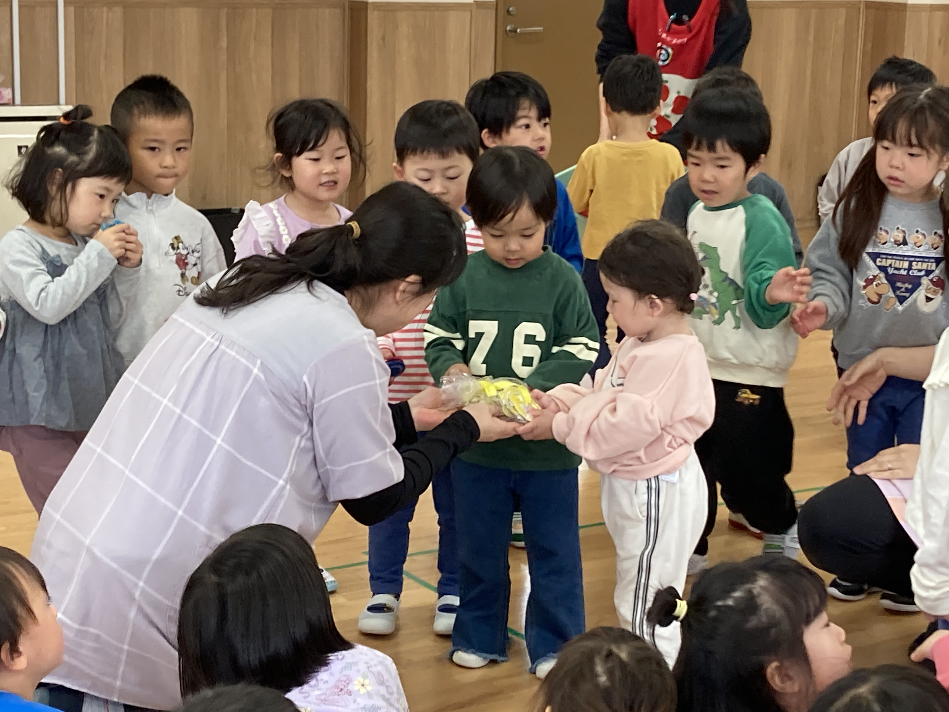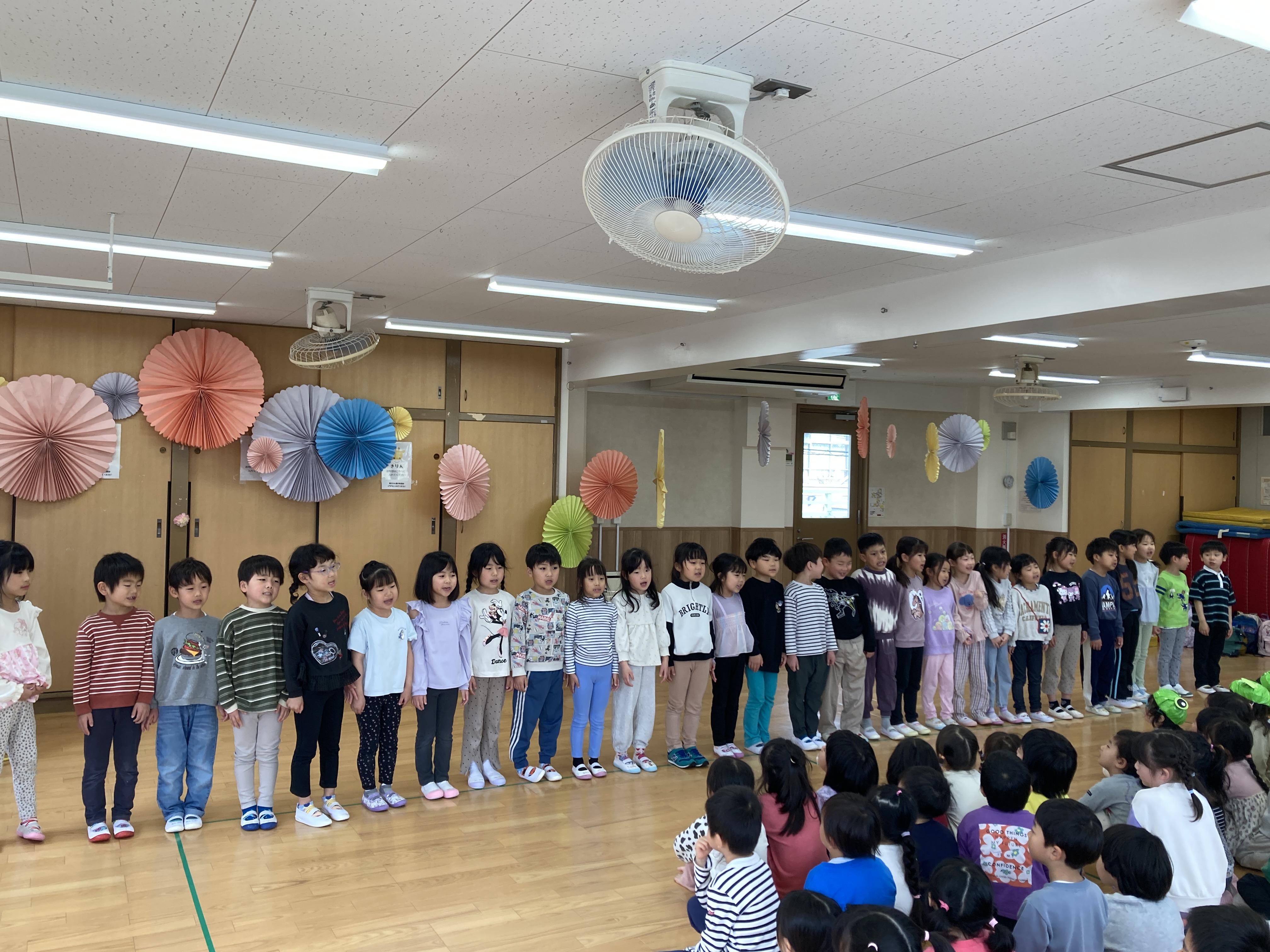 各クラス、出来るようになった歌や手遊び、体操等を披露し園長先生から新しい名札を貰いました。