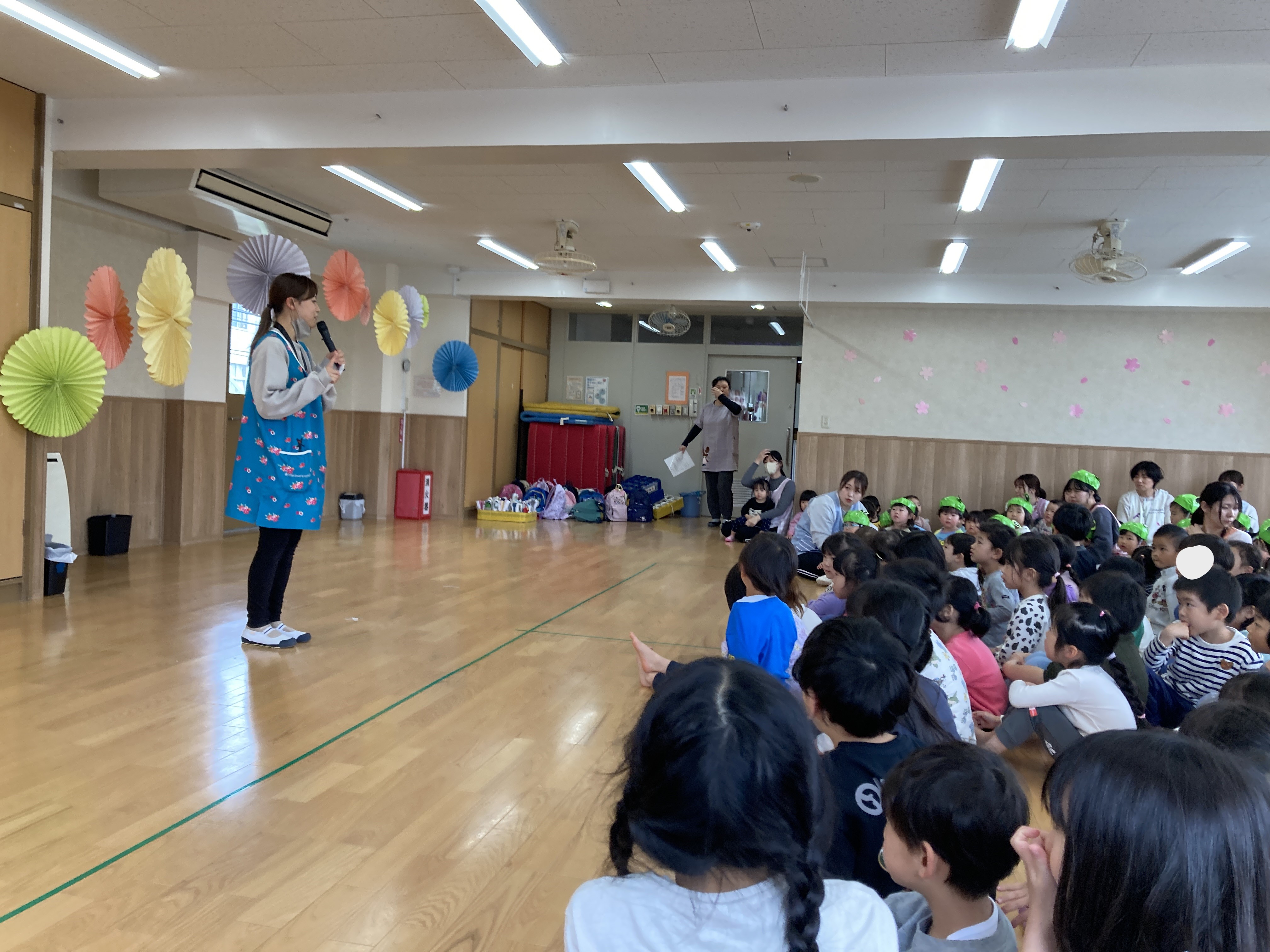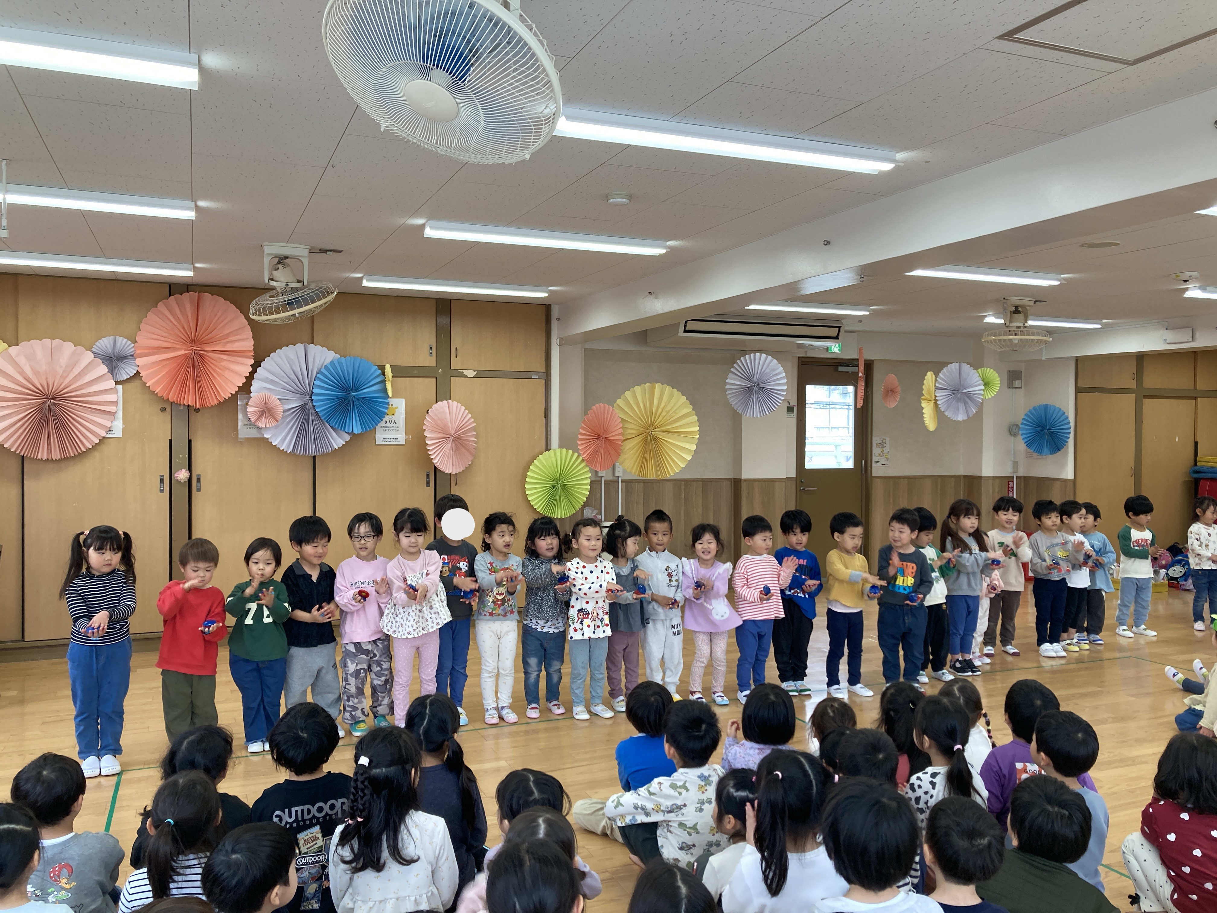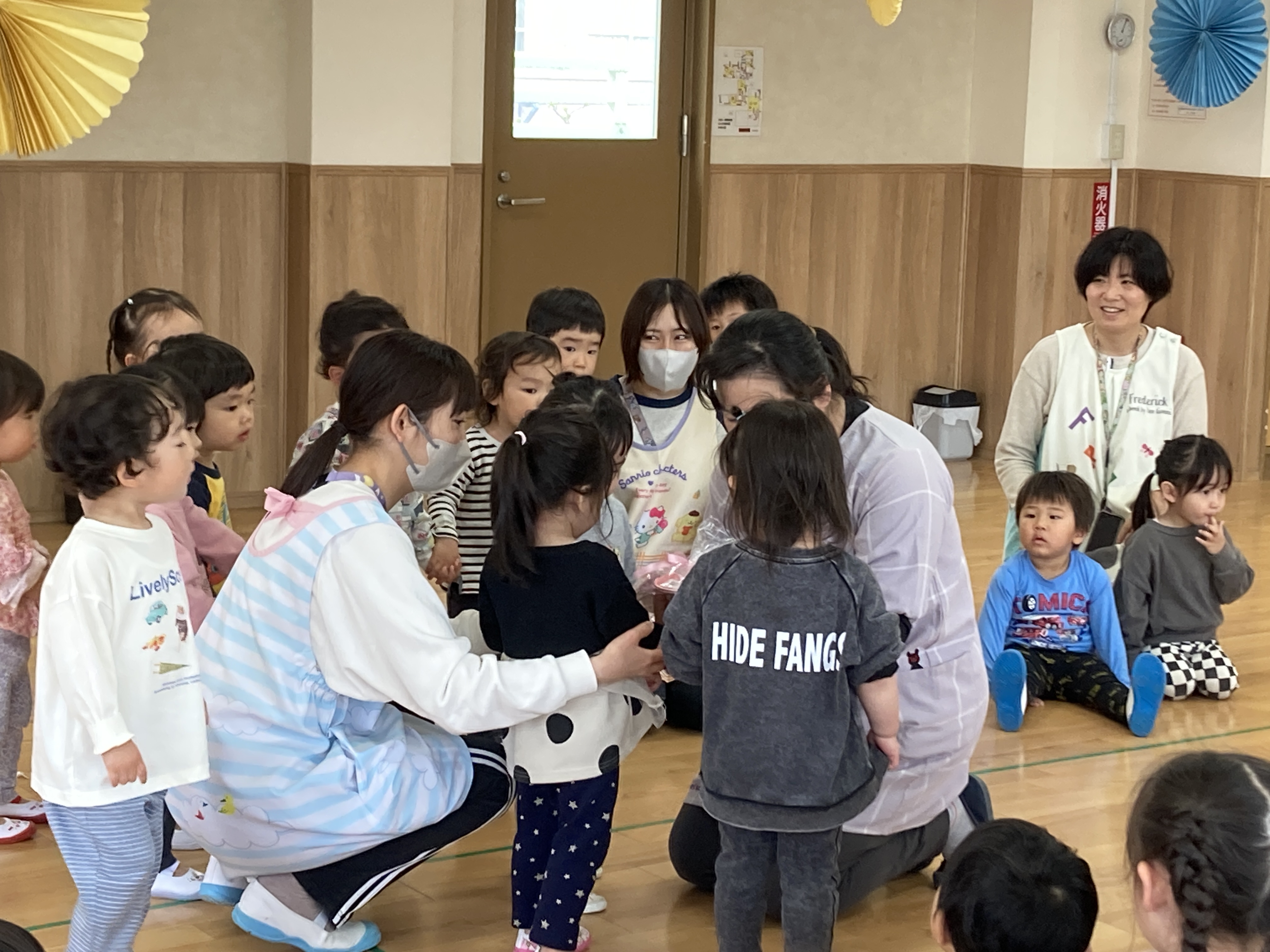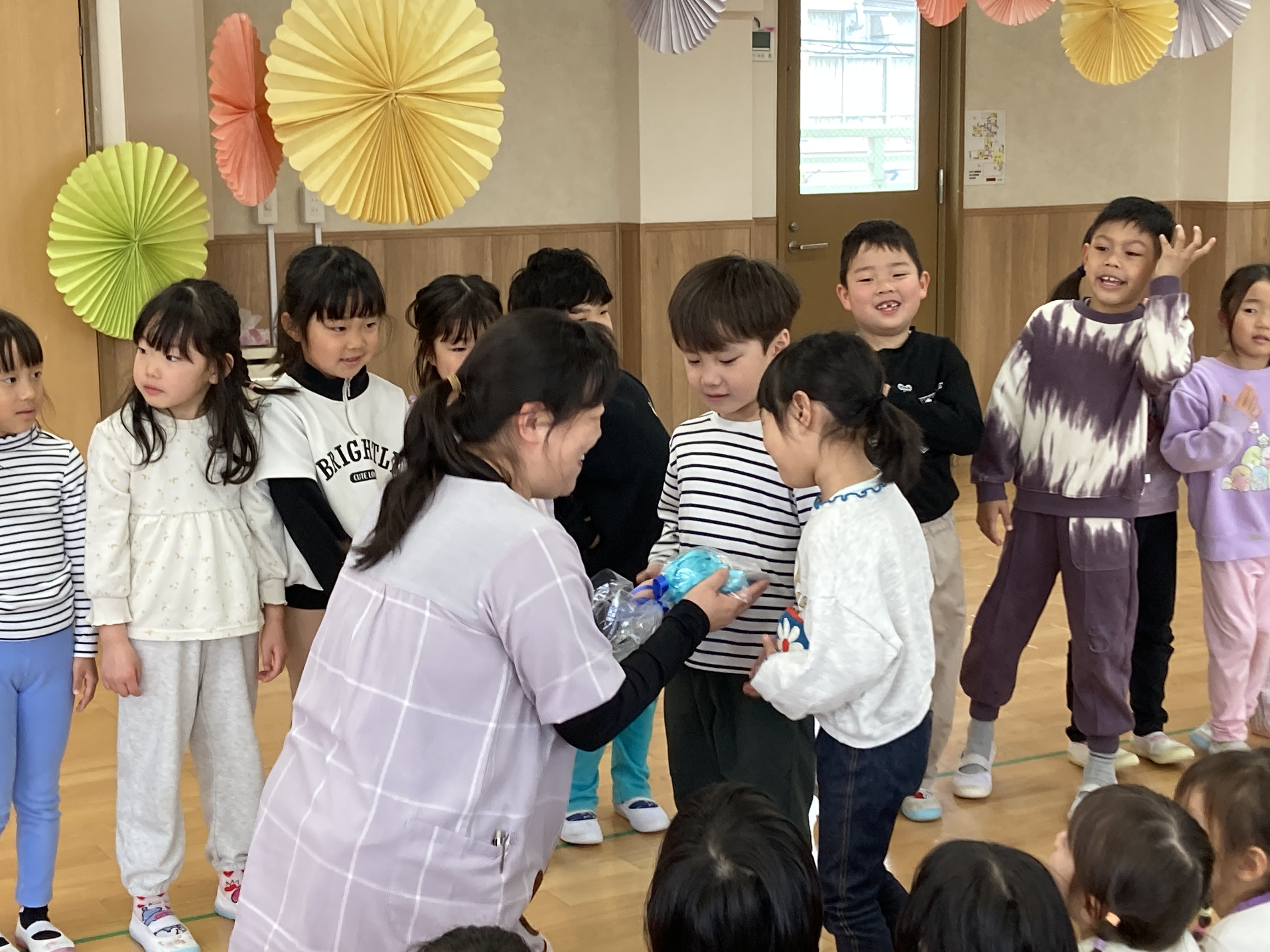 各クラス、出来るようになった歌や手遊び、体操等を披露し園長先生から新しい名札を貰いました。