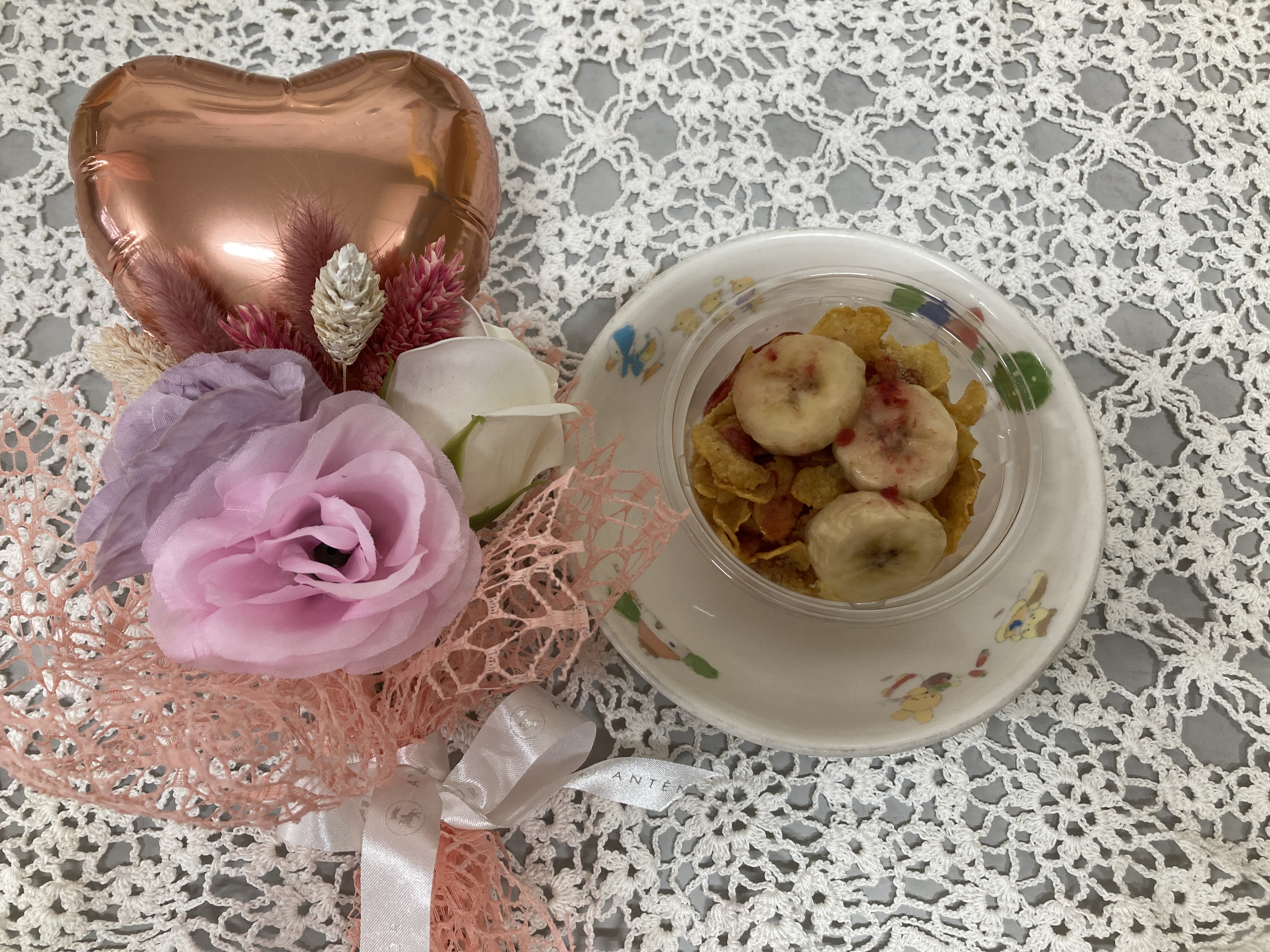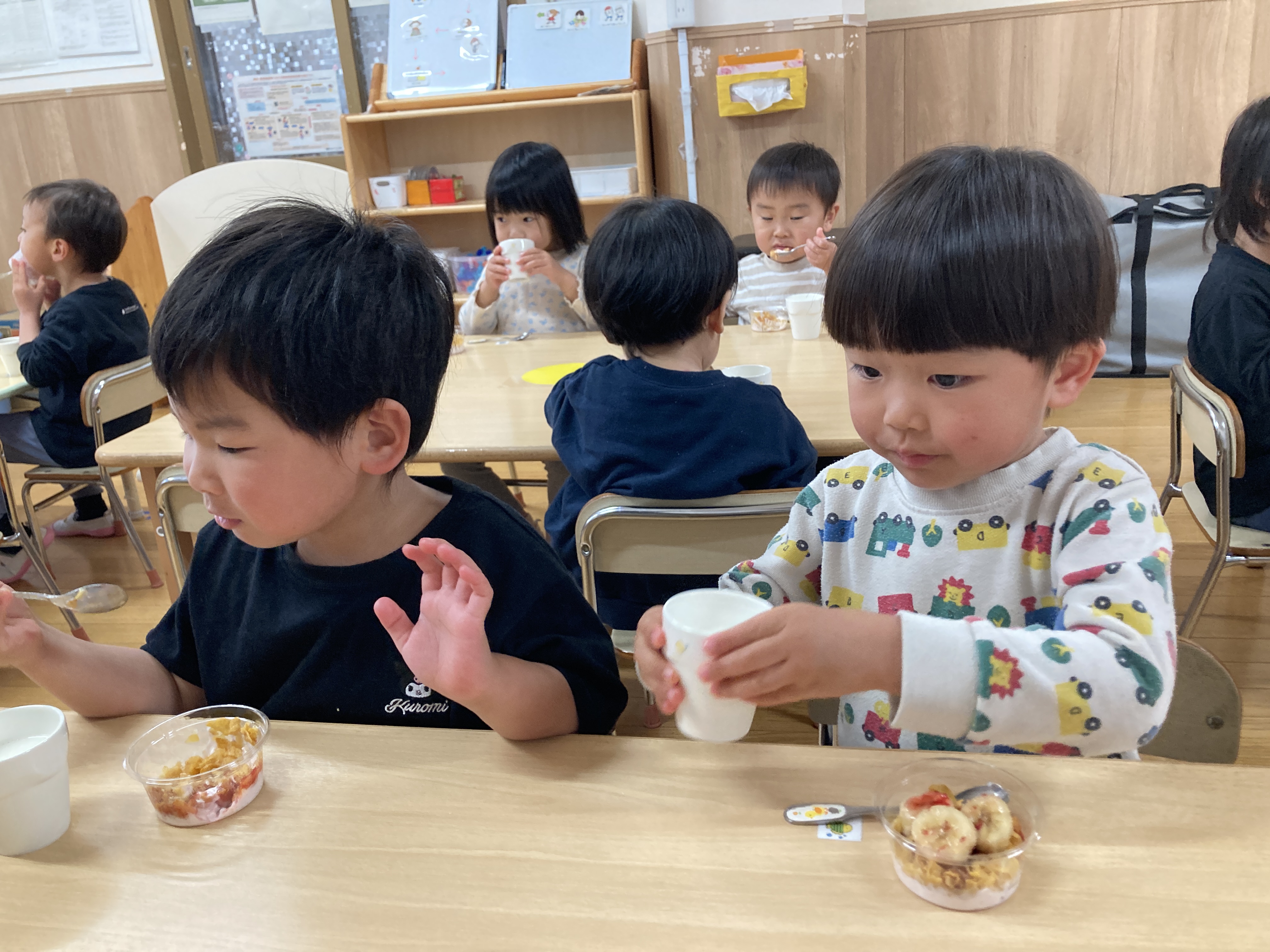 バナナにコーンフレークに盛沢山なパフェに子ども達も目を輝かせながら、「どこから食べようかな~」と迷っていました。