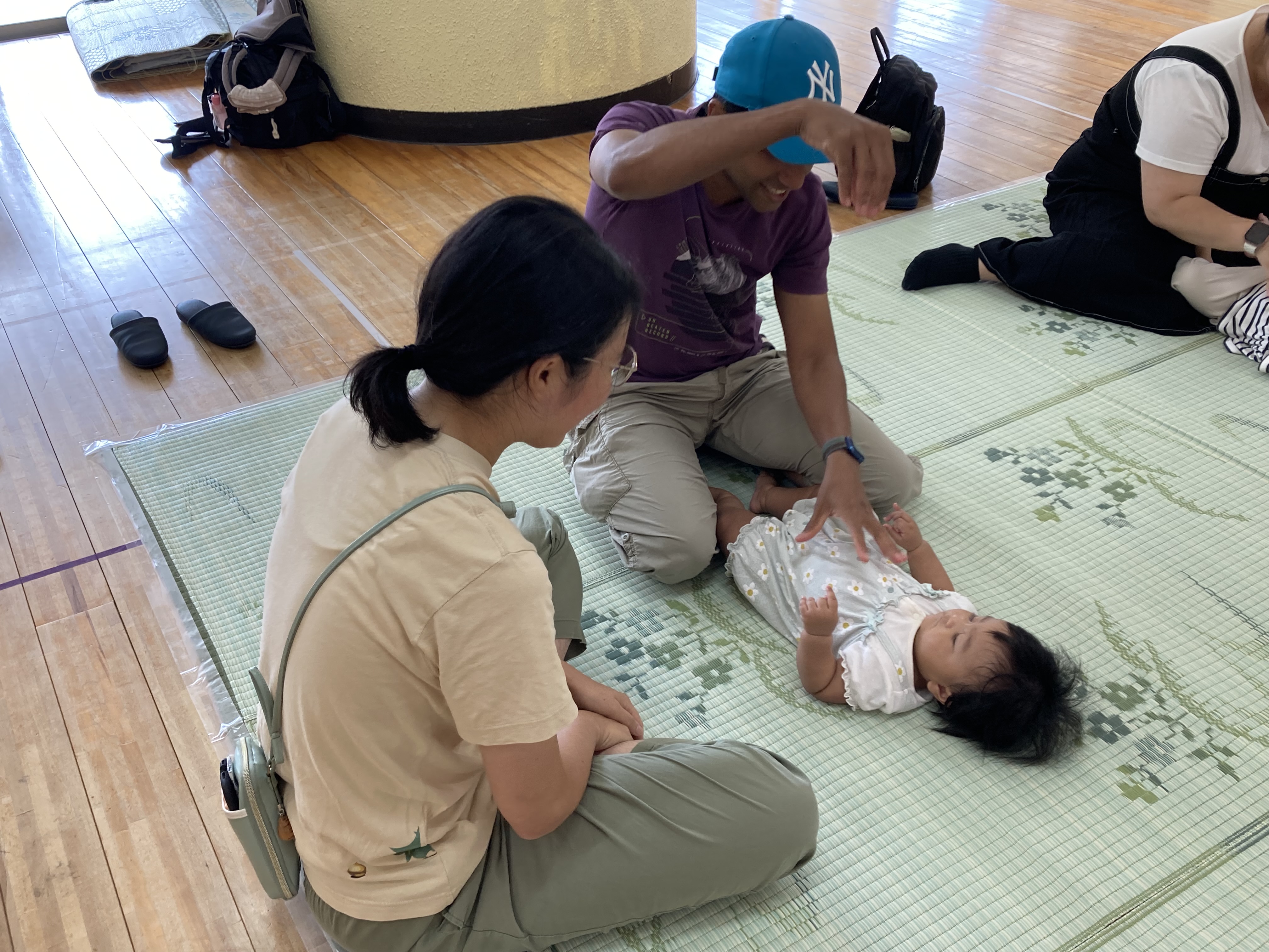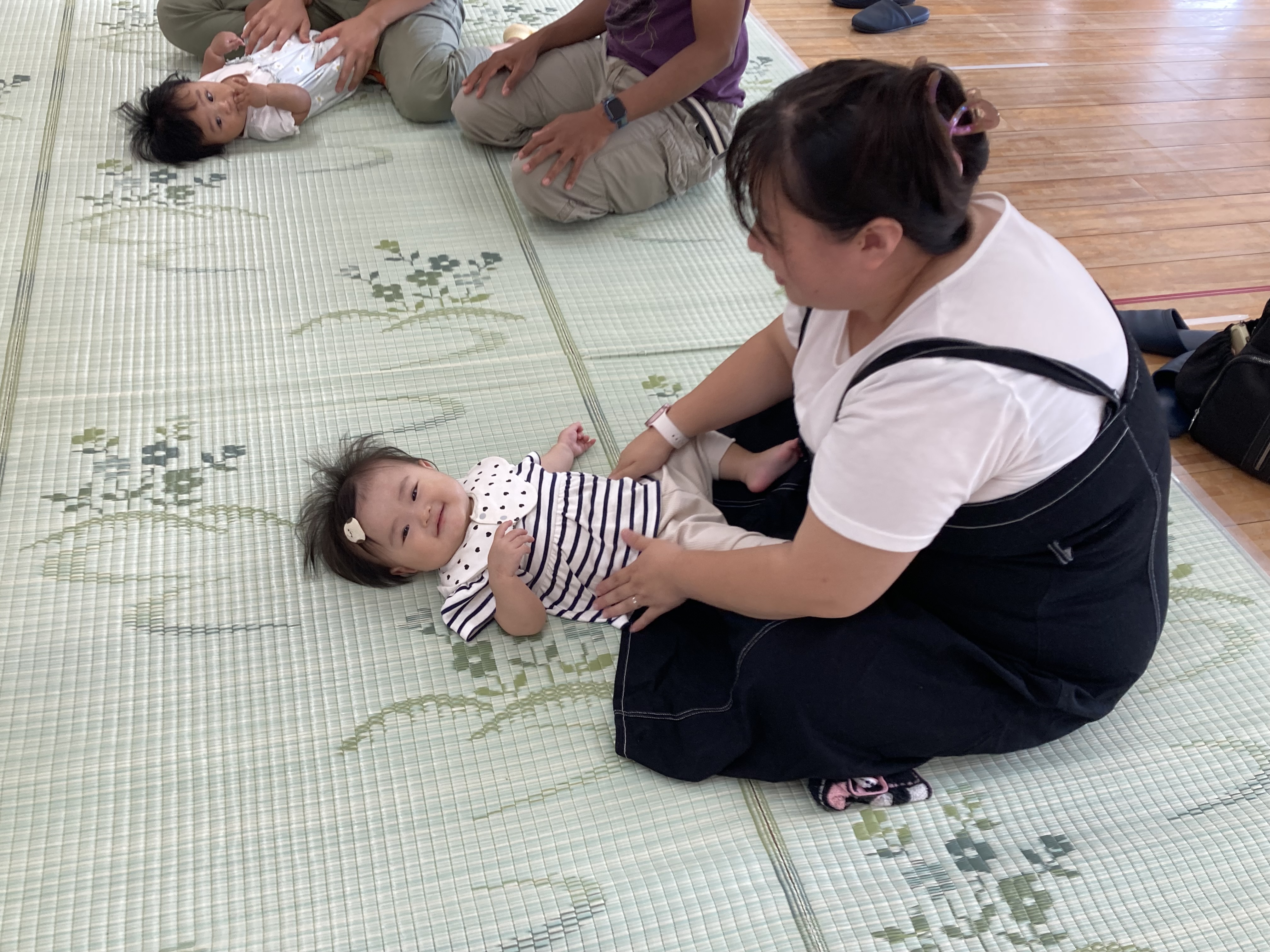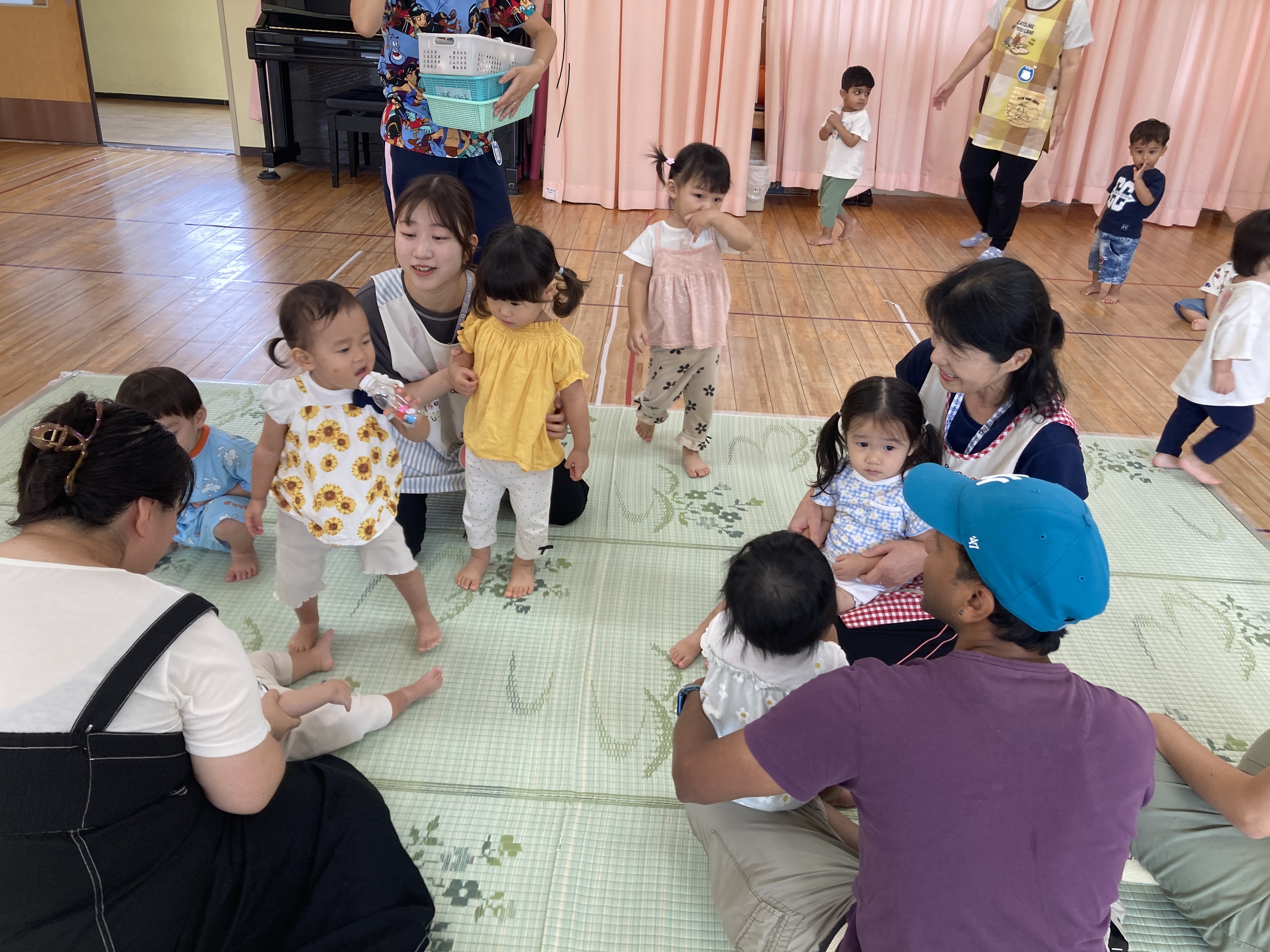 その後はお母さんやお父さんと一緒に「せんたく」「きゅうりができた」「ららら大根」「フランスパン」等のふれあい遊びを楽しみました。