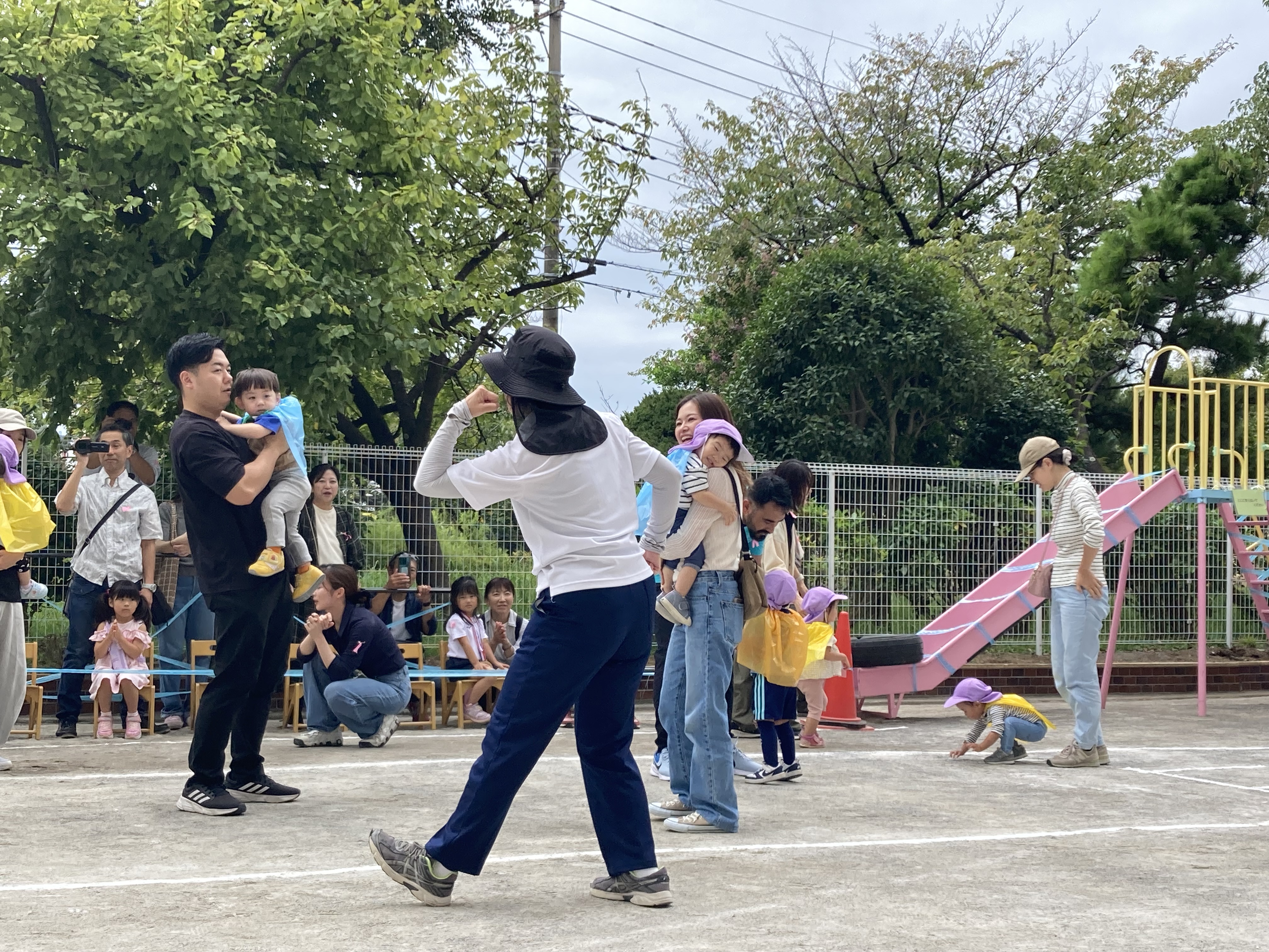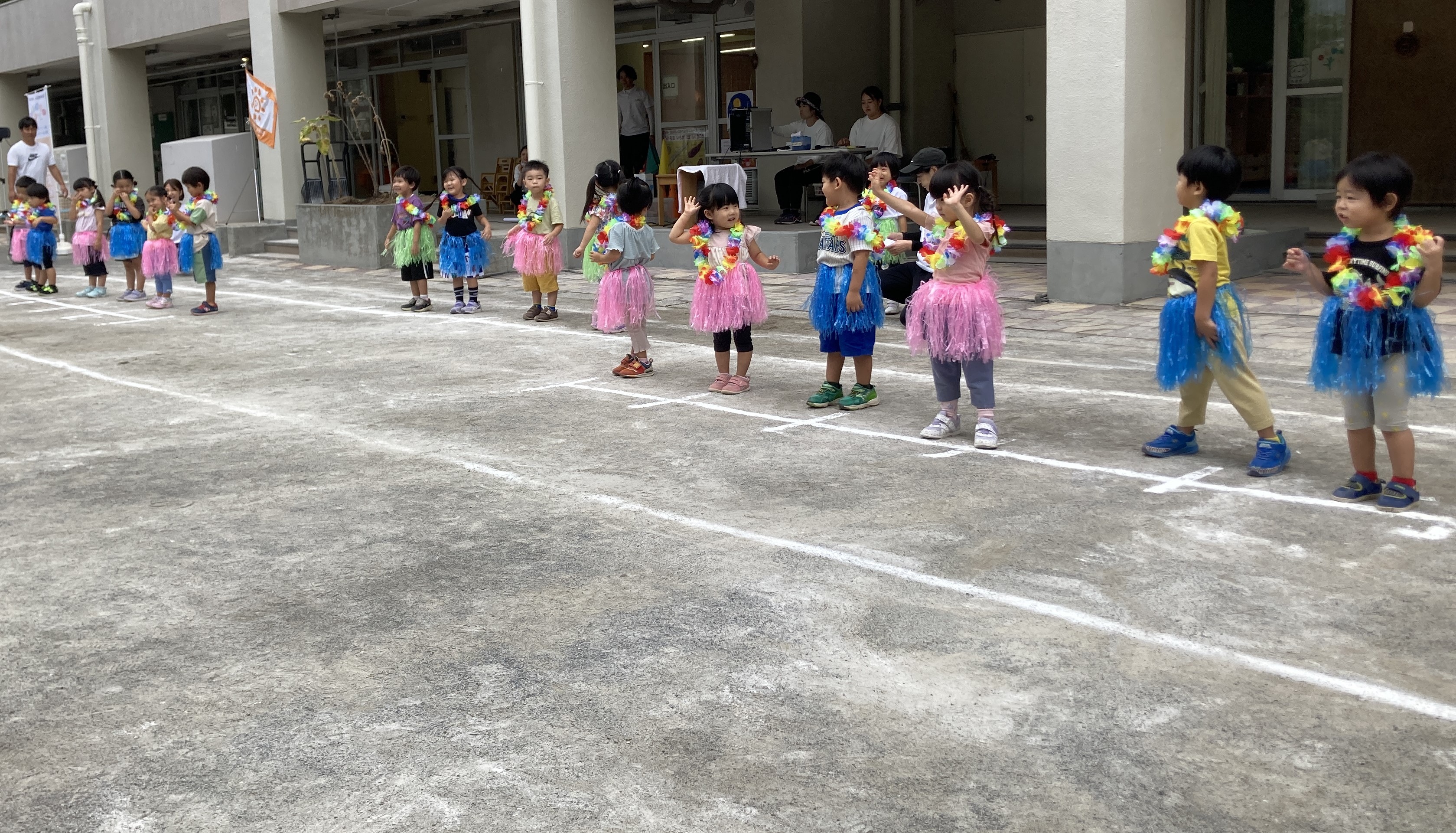 開始前に雨が降りだしてしまい、園庭での開催が難しくなったため、ホールにて