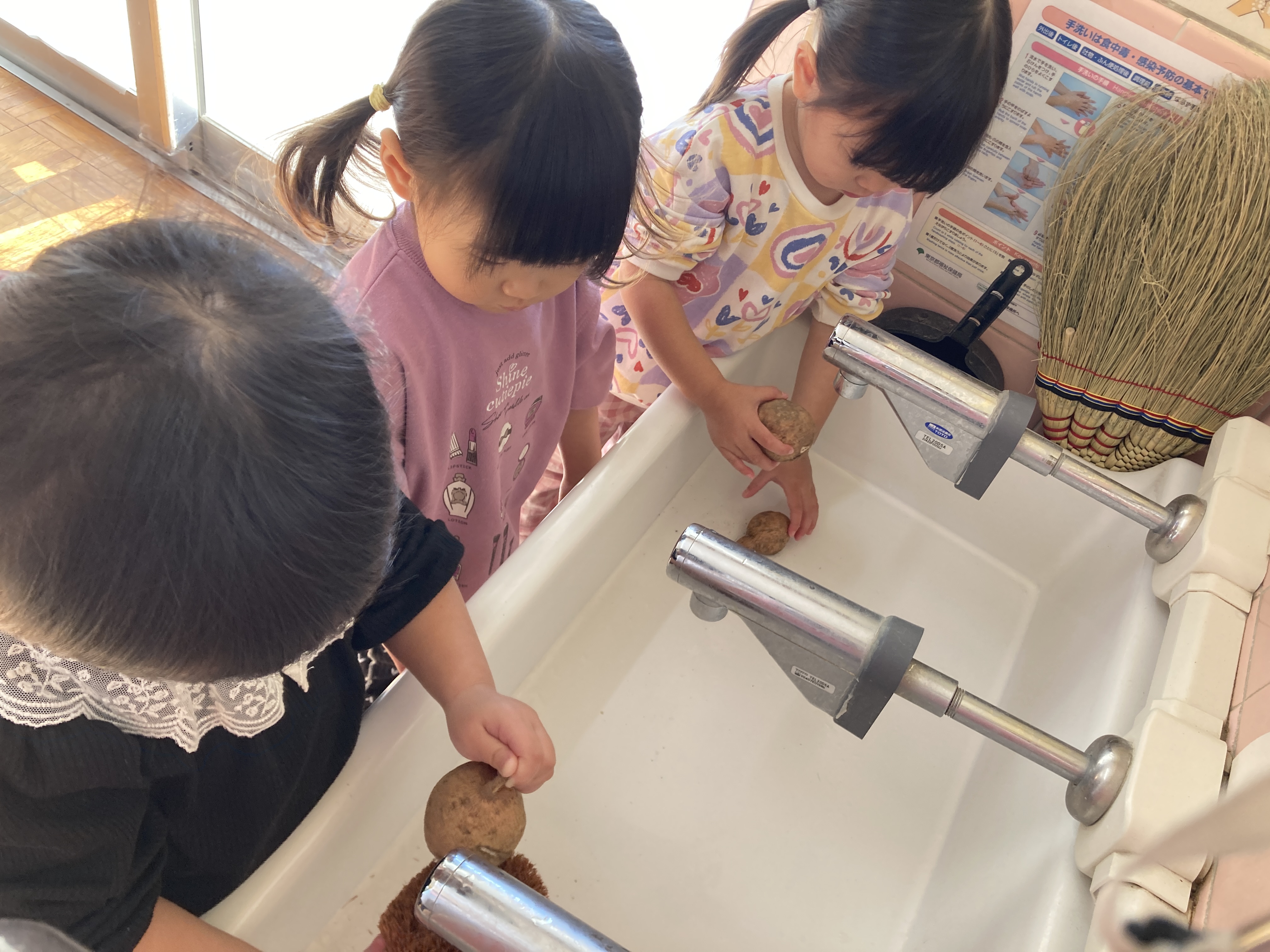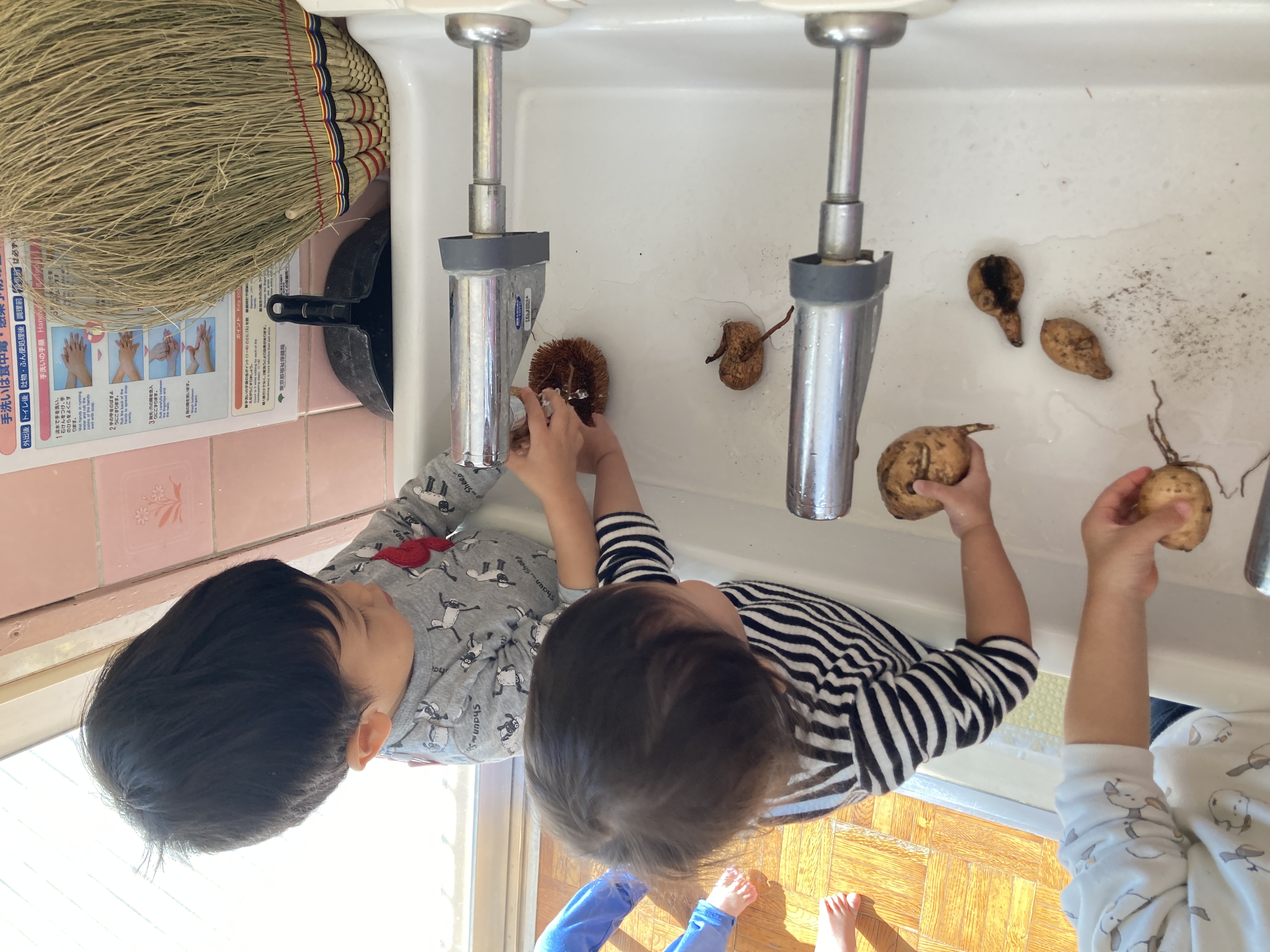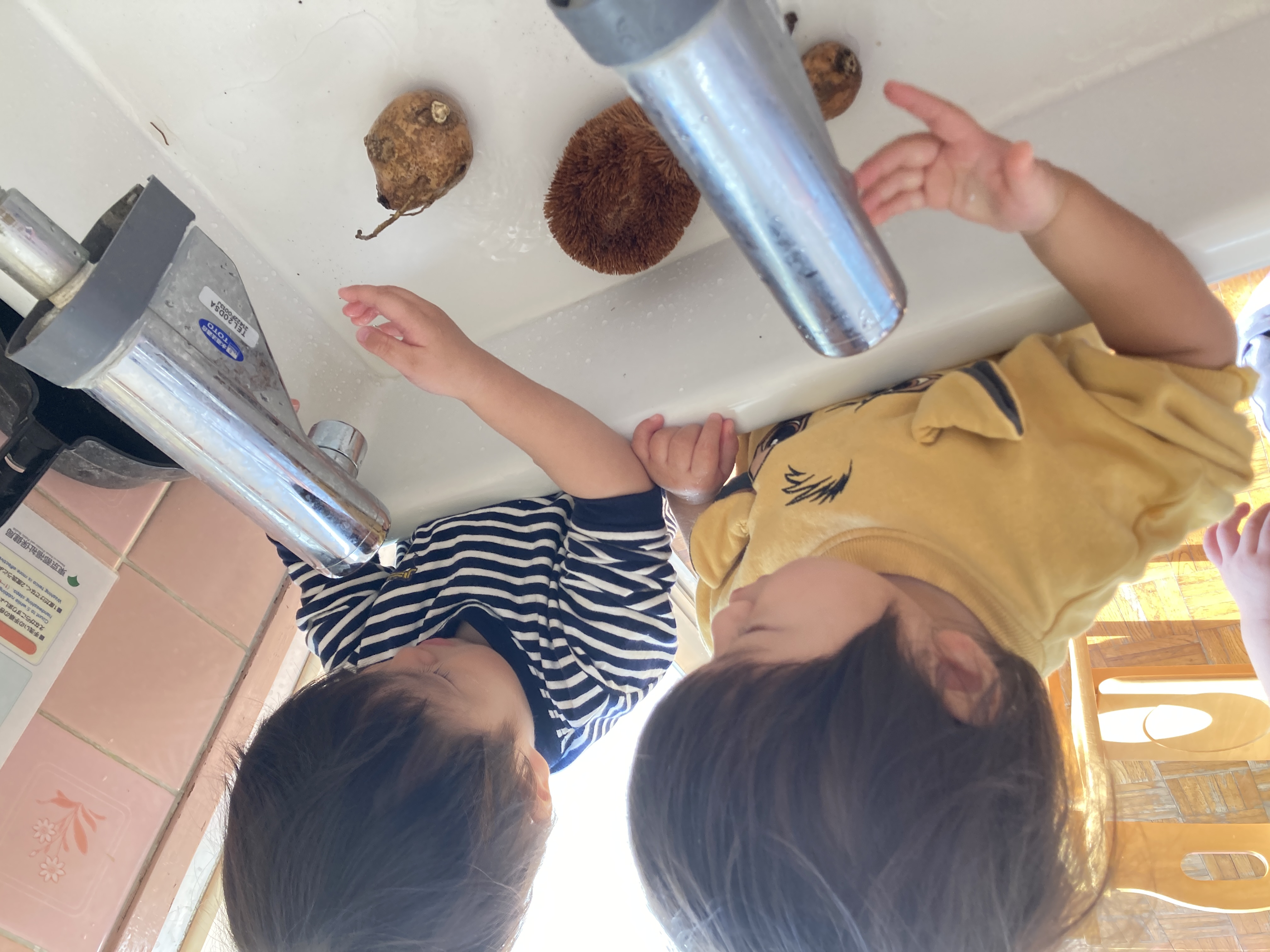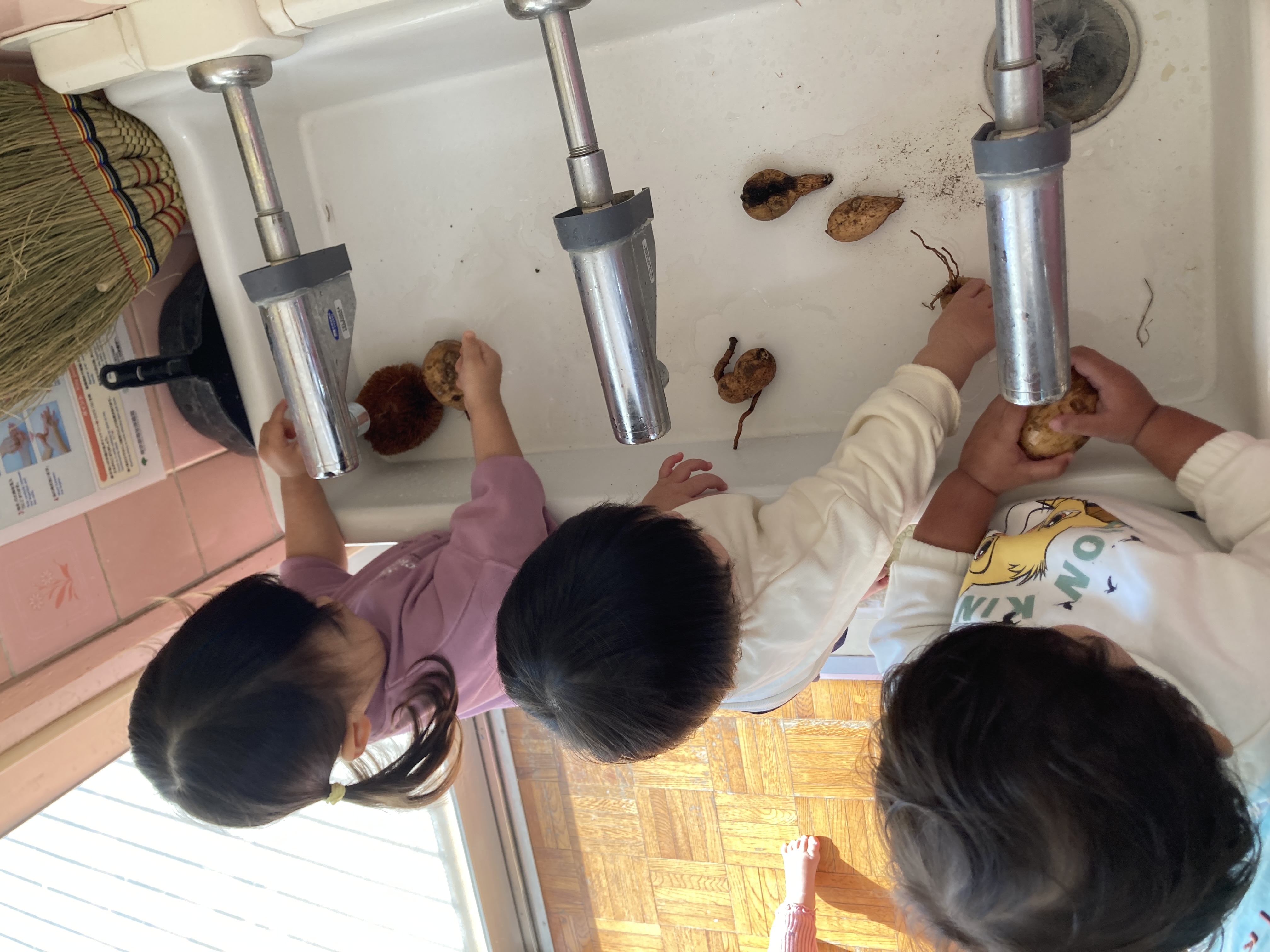「やってみようかな…」とお友達が集まってきてサツマイモを洗ってくれました。