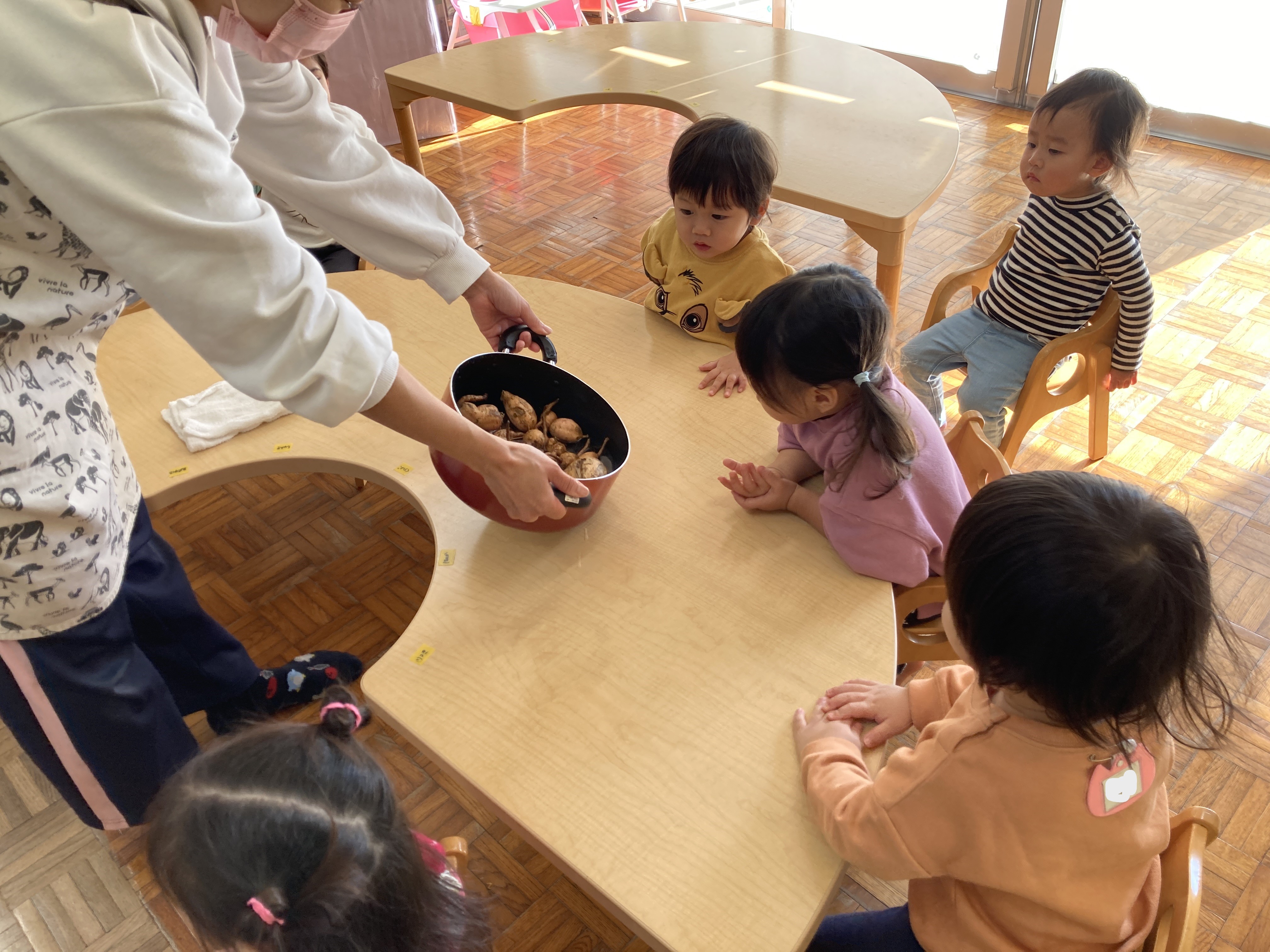 蒸したサツマイモを観察すると「いい匂い」「美味しそう」と待ち遠しそう。