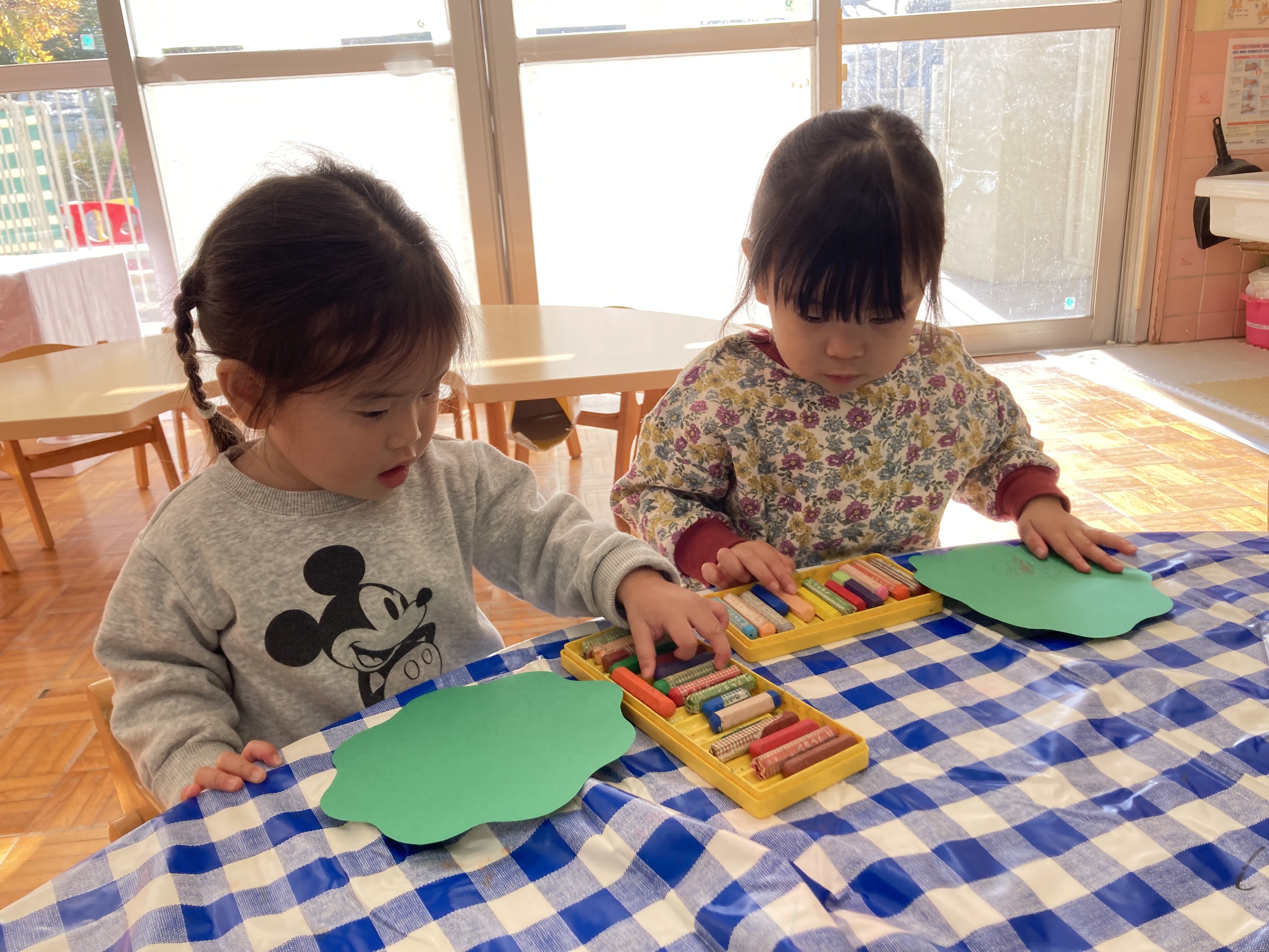 台紙にクレヨンで模様を描き、シールで仕上げると、