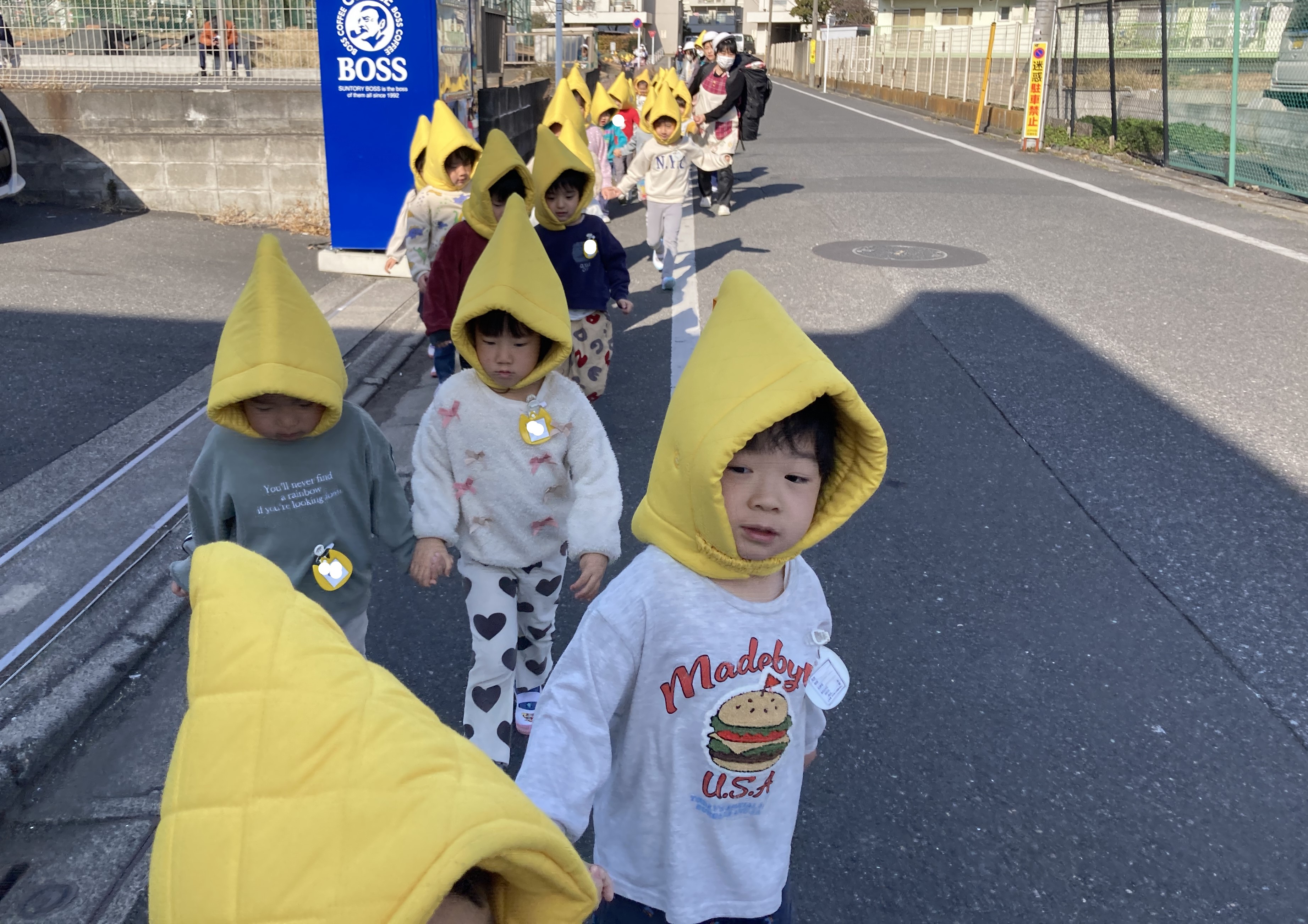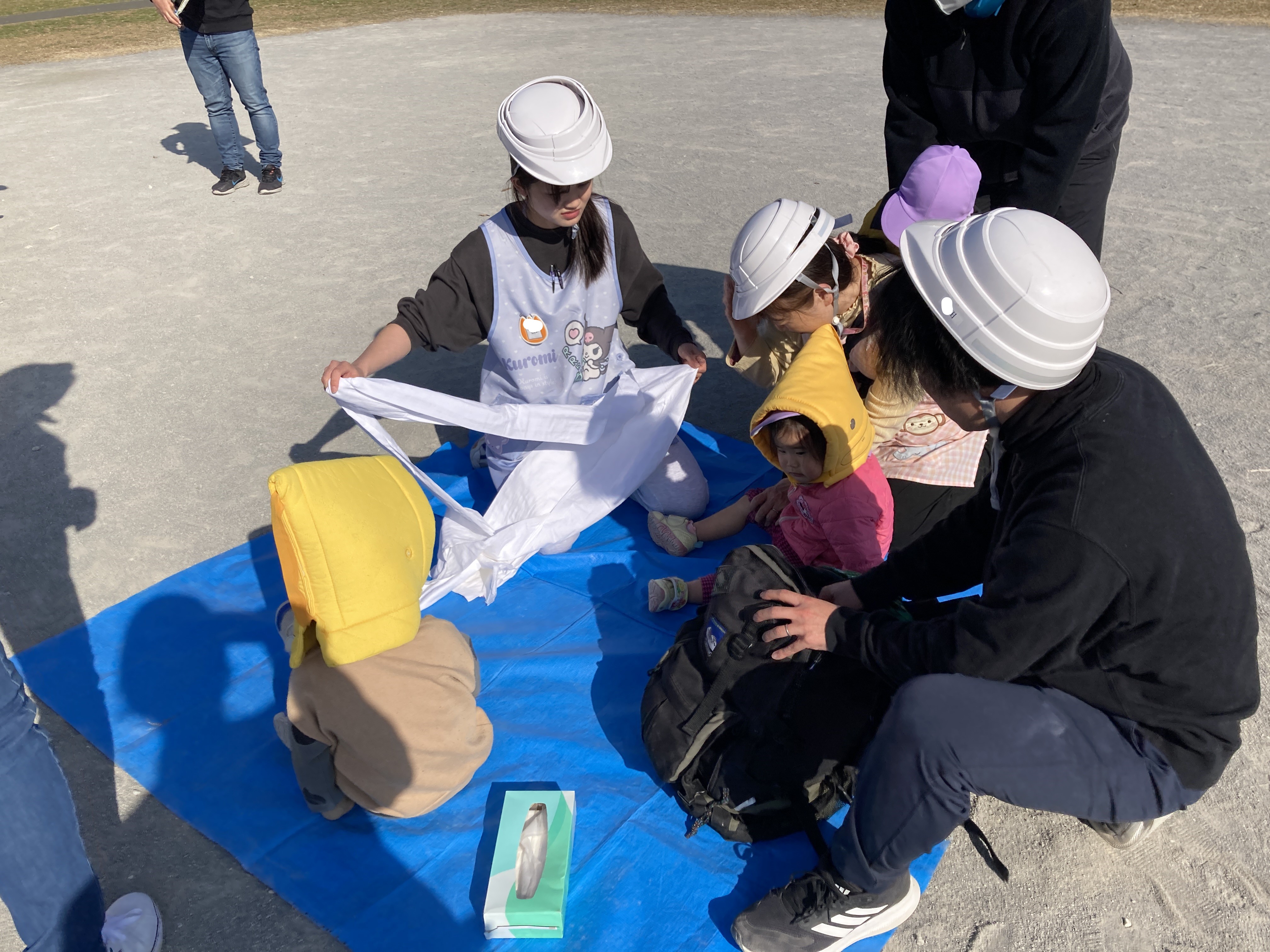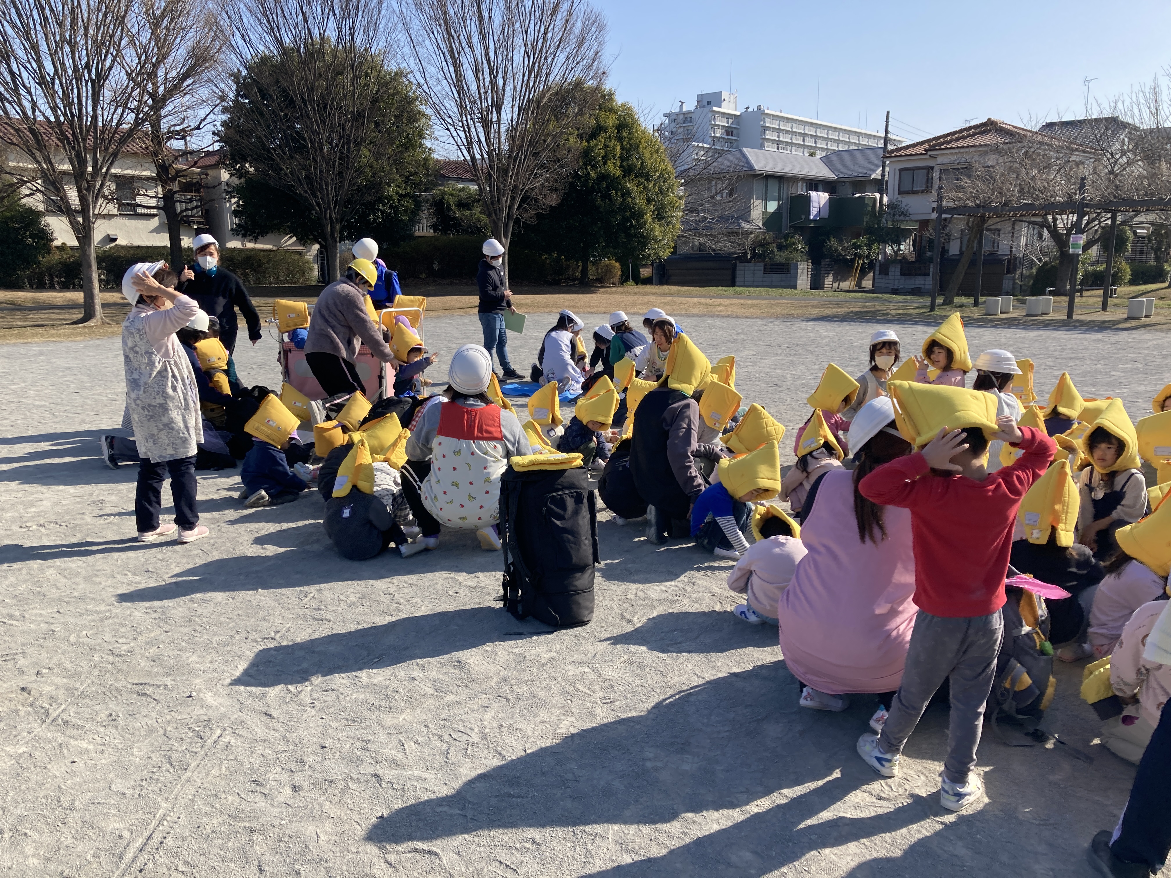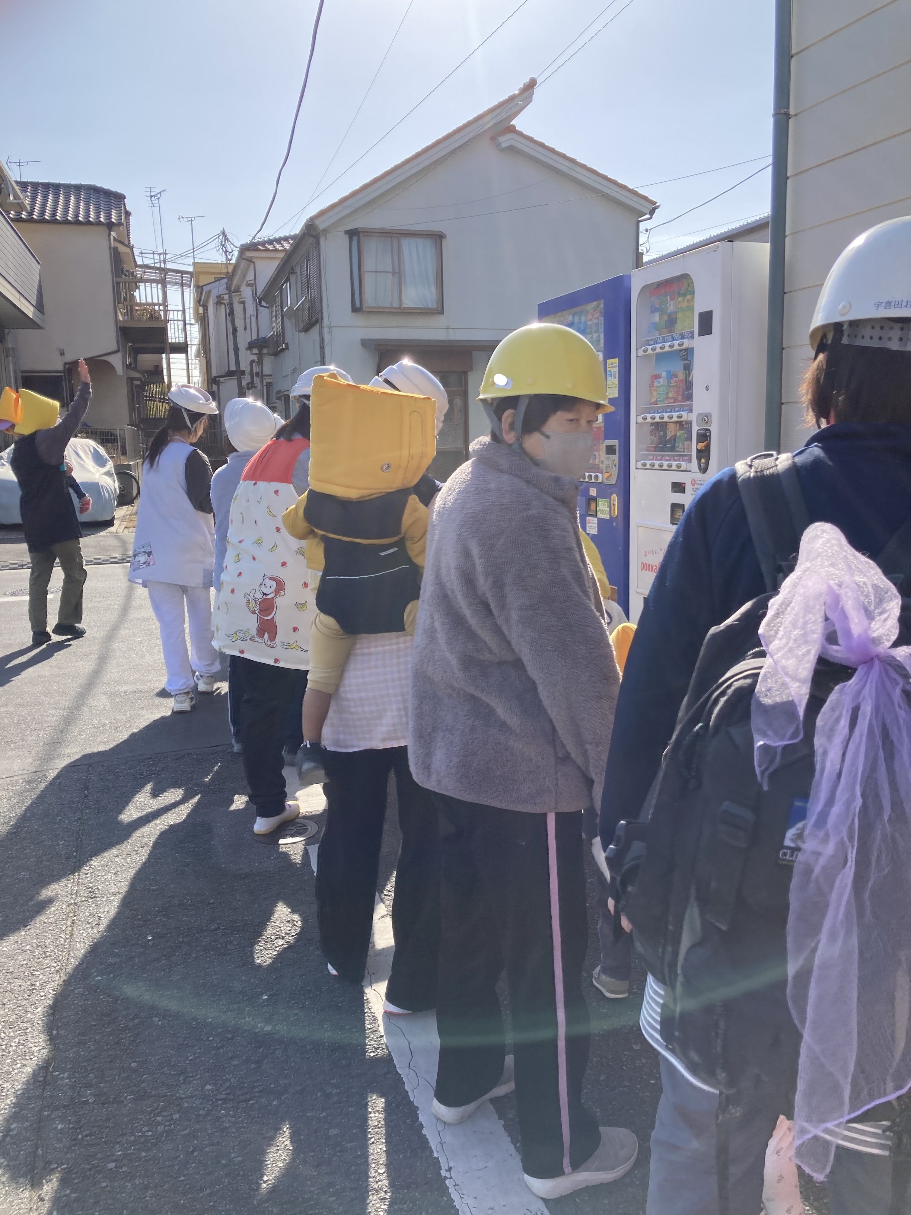子どもたちは防災頭巾を被り、避難車やおんぶ紐も使って迅速に避難します。