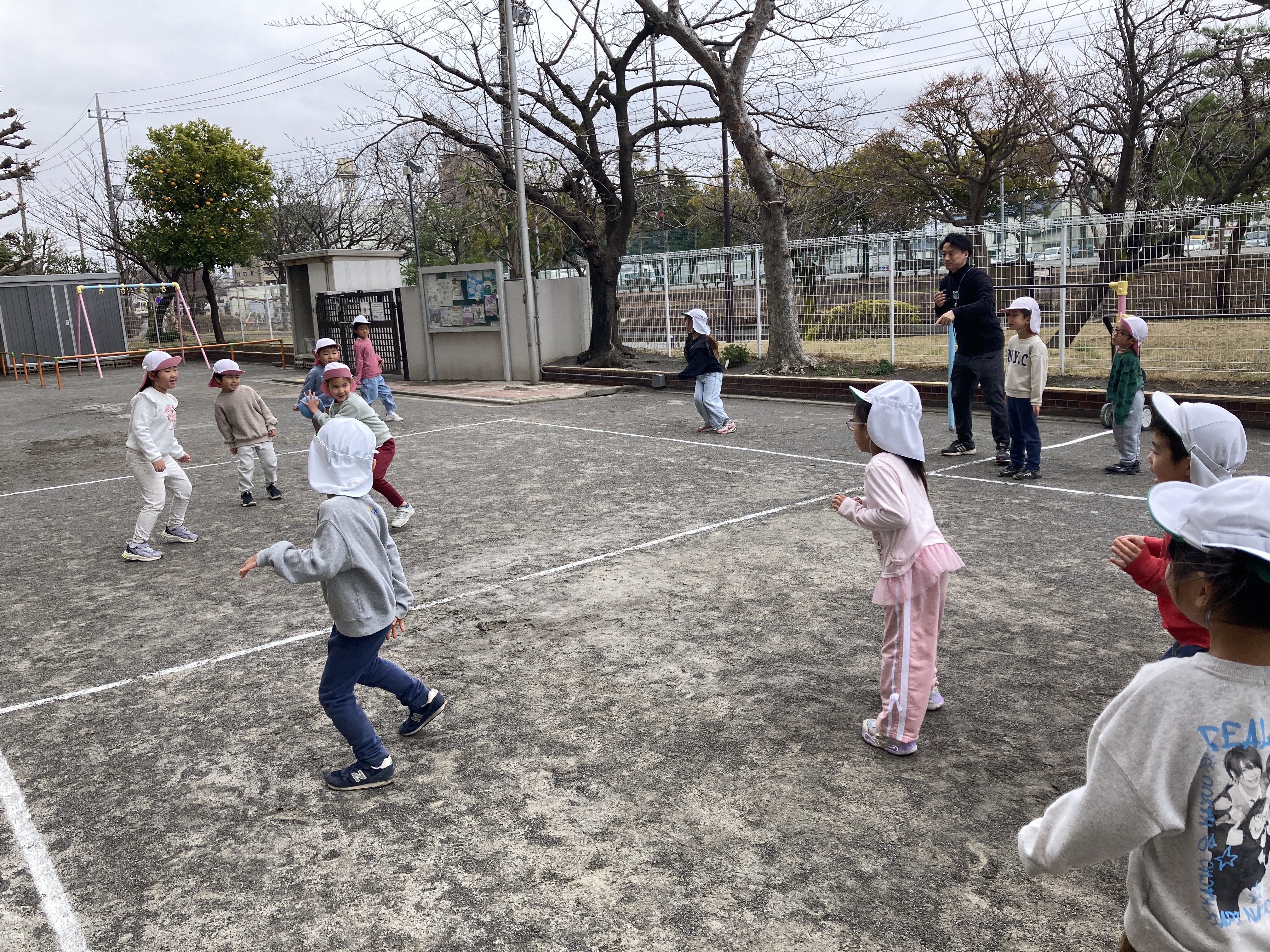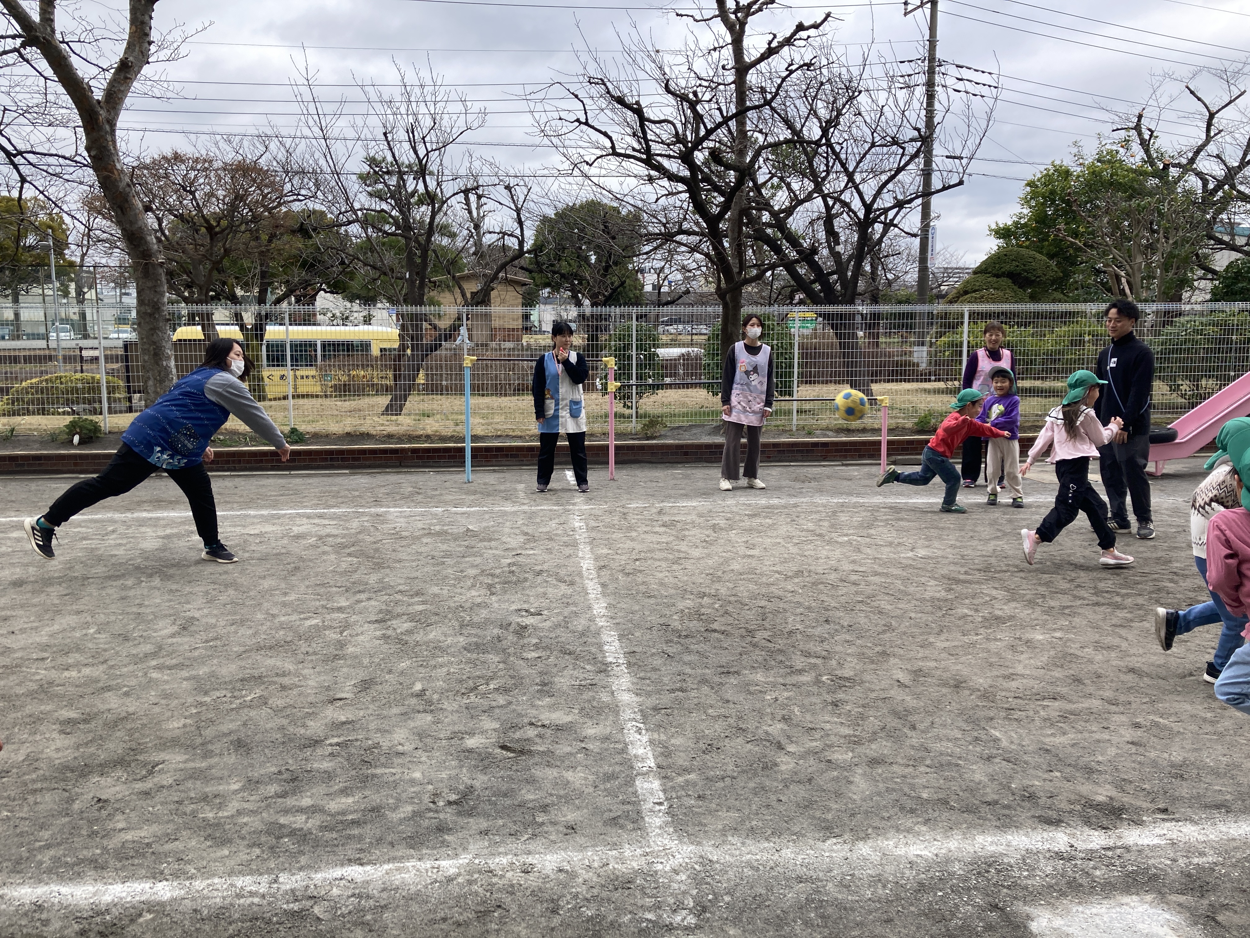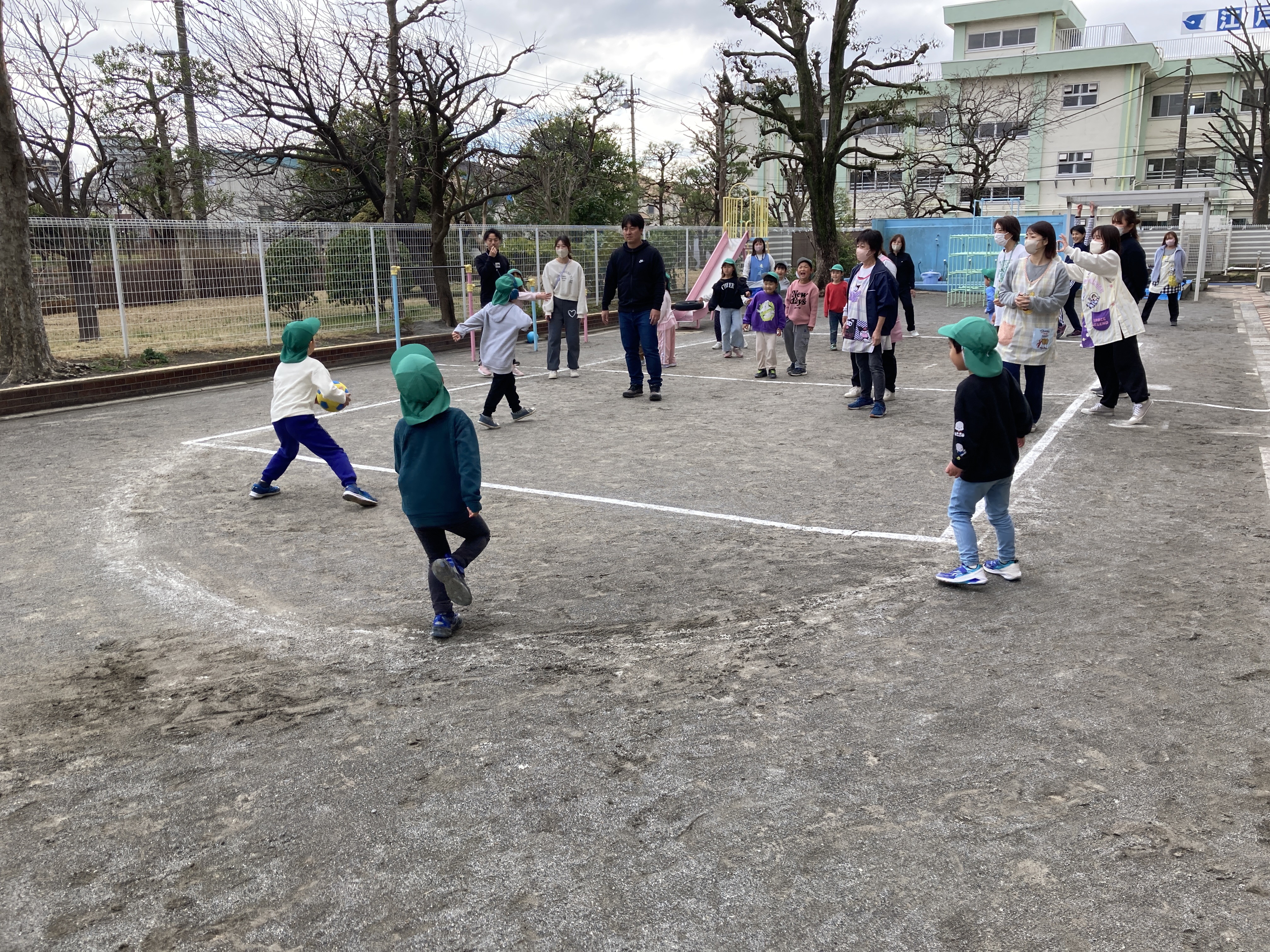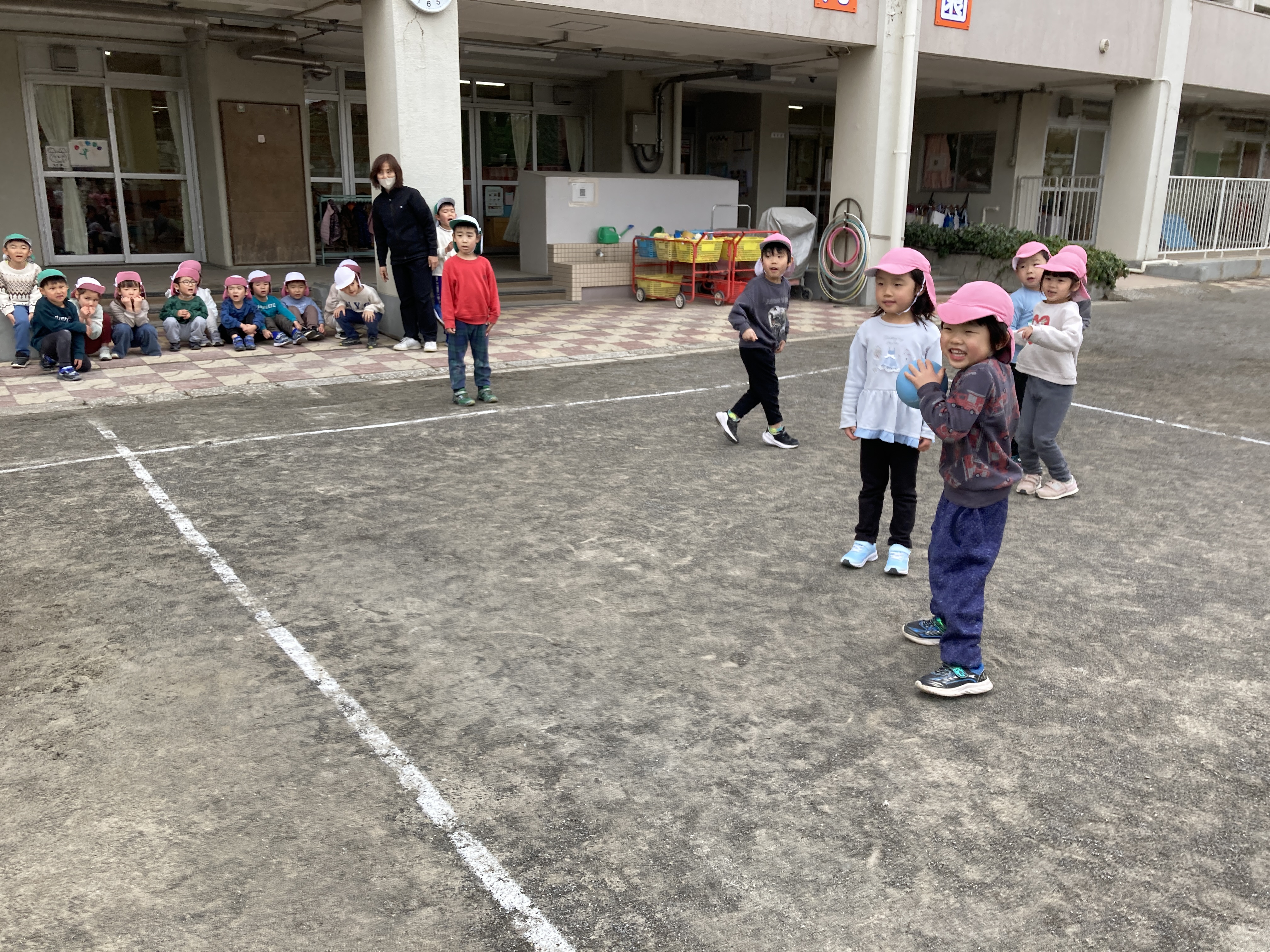 お腹いっぱいになった後は園庭でらいおん組vs職員のドッジボール対決!