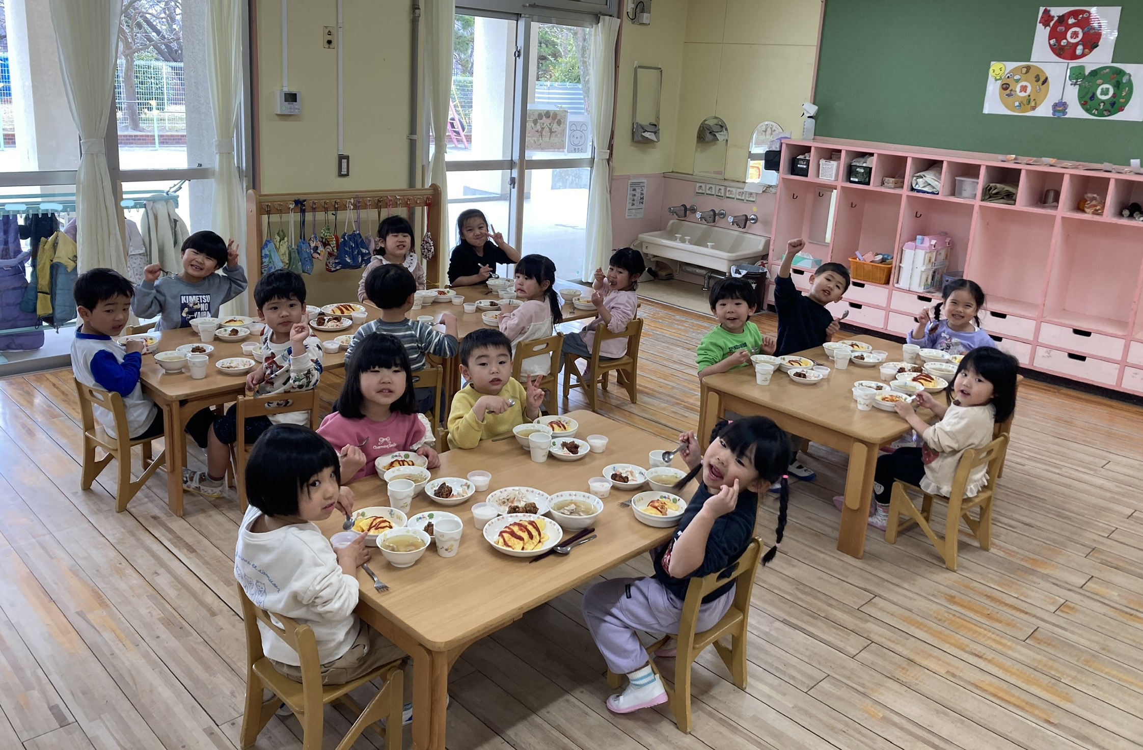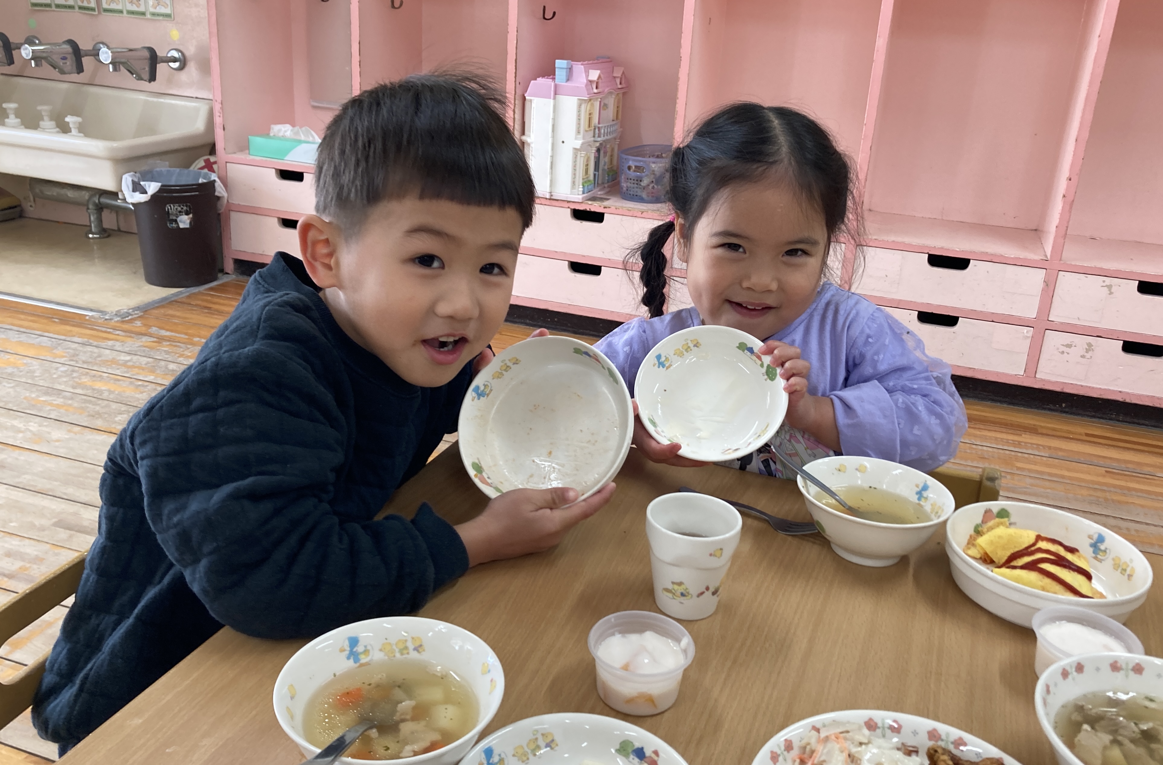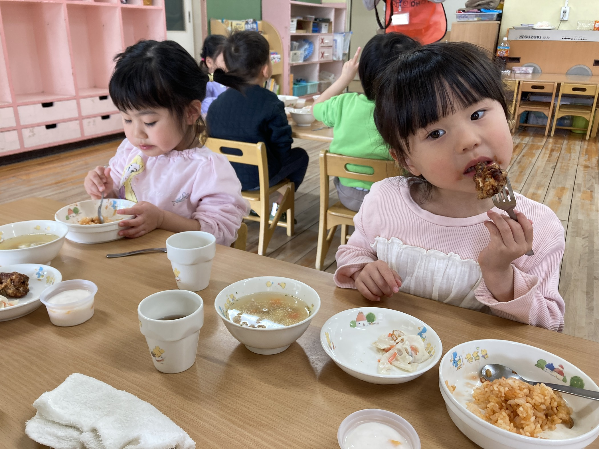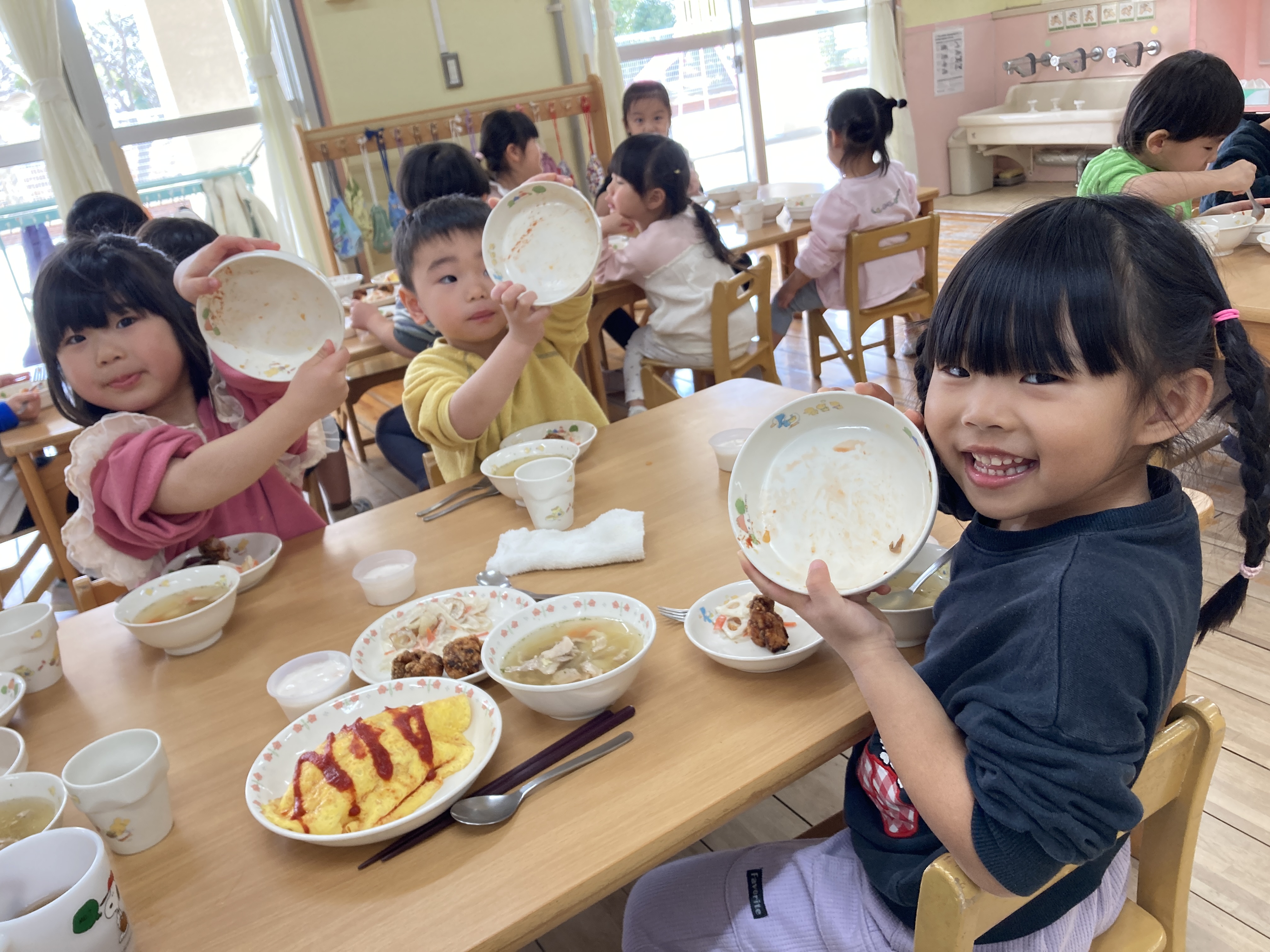 今日は午前中講師による体育あそびがあったので、たくさん体を動かしてお腹が空いた様子。