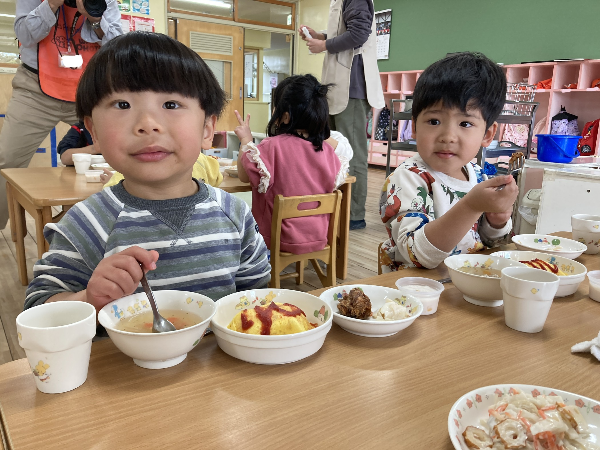 今回の献立は、好きなもの尽くしだったので「オムライスだ~!」「からあげ大好き」と大興奮のうさぎ組。ABCのスープに入っているアルファベットのマカロニも、発見を喜び、子ども達同士で見せ合っていました。