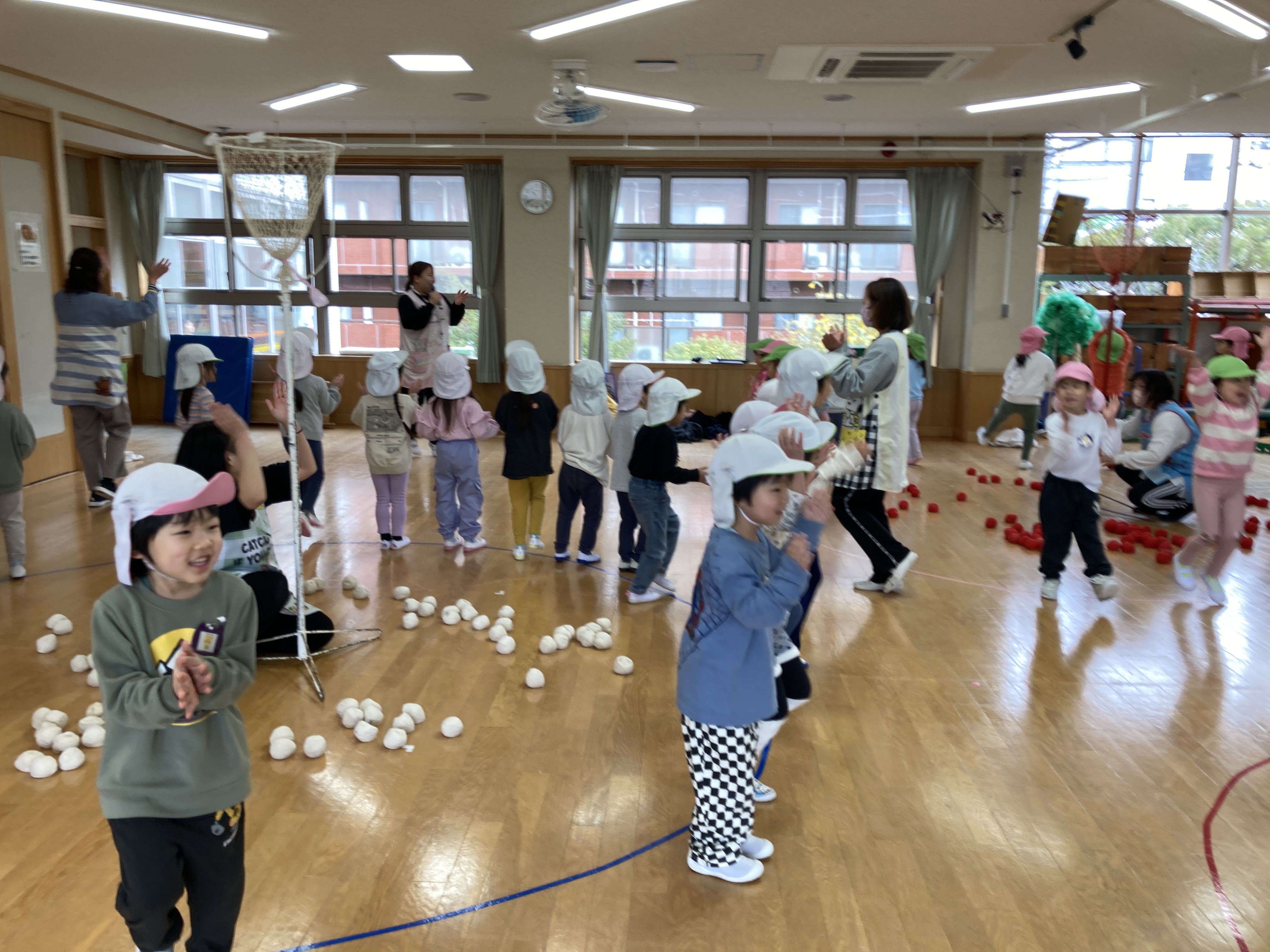 その後は、2チームに分かれて新聞じゃんけんゲーム、ダンシング玉入れをしました。