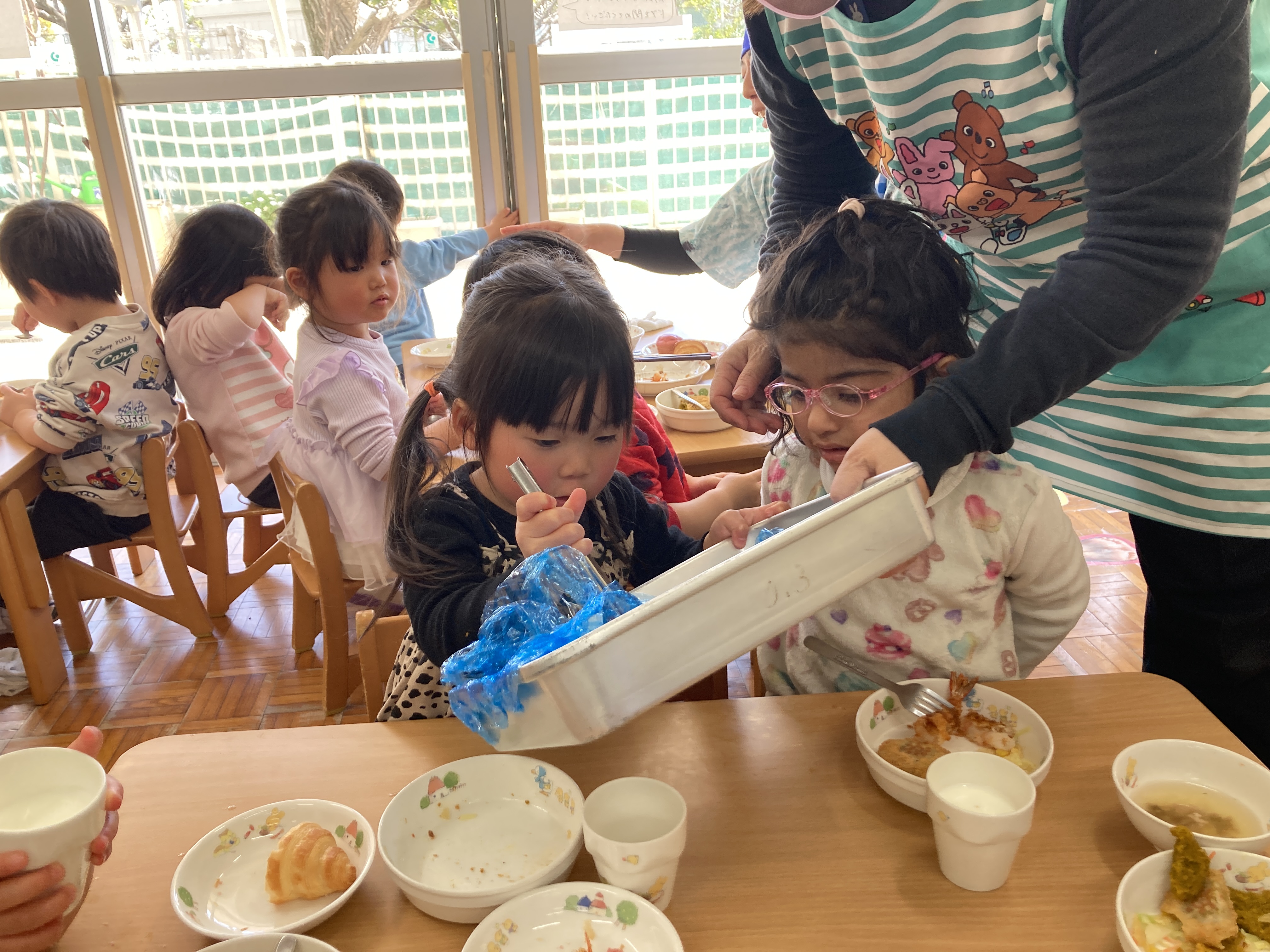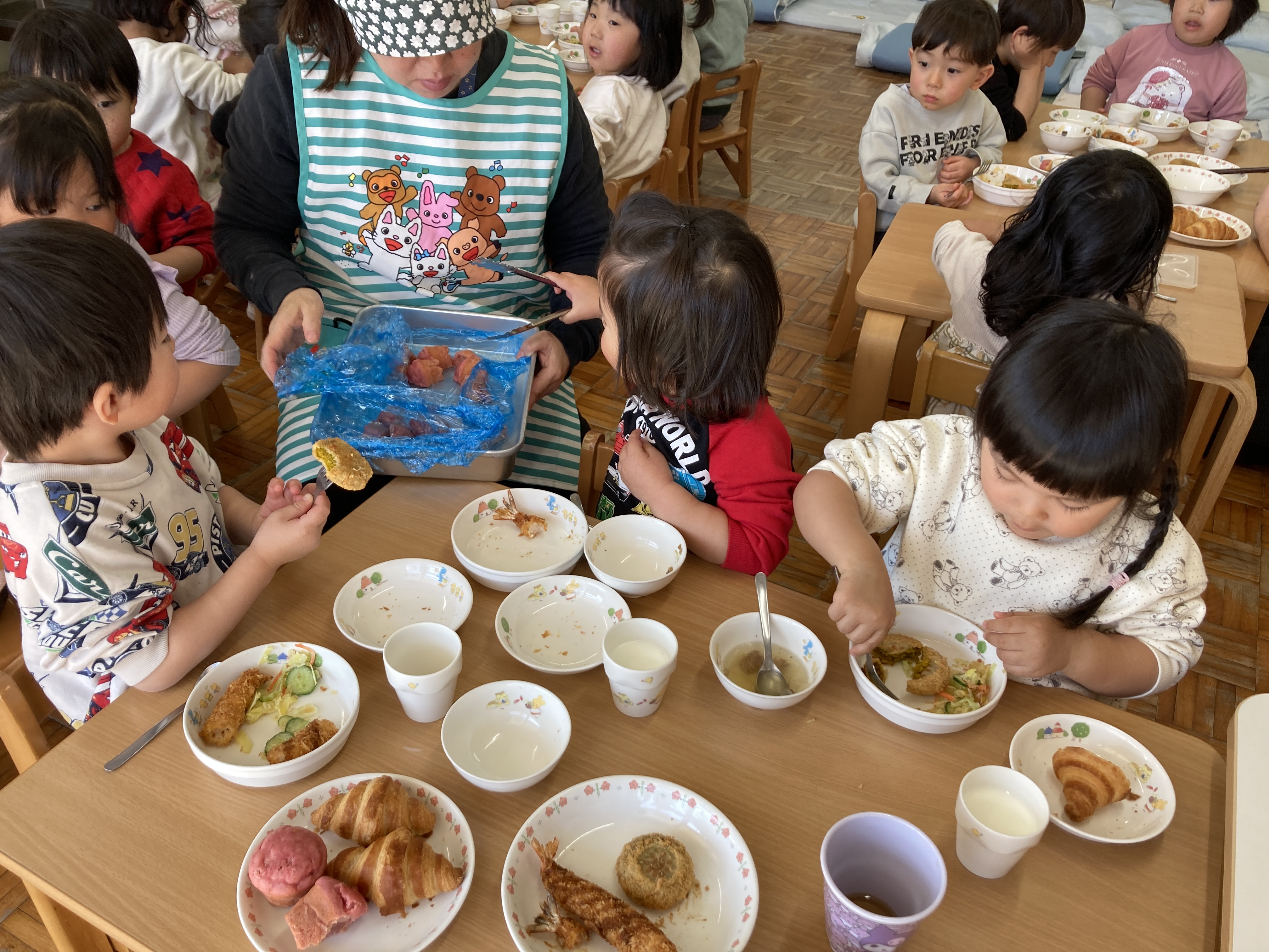 好きなパンを自分でトングで掴んでみました。初めて、トングを使った子もいたので