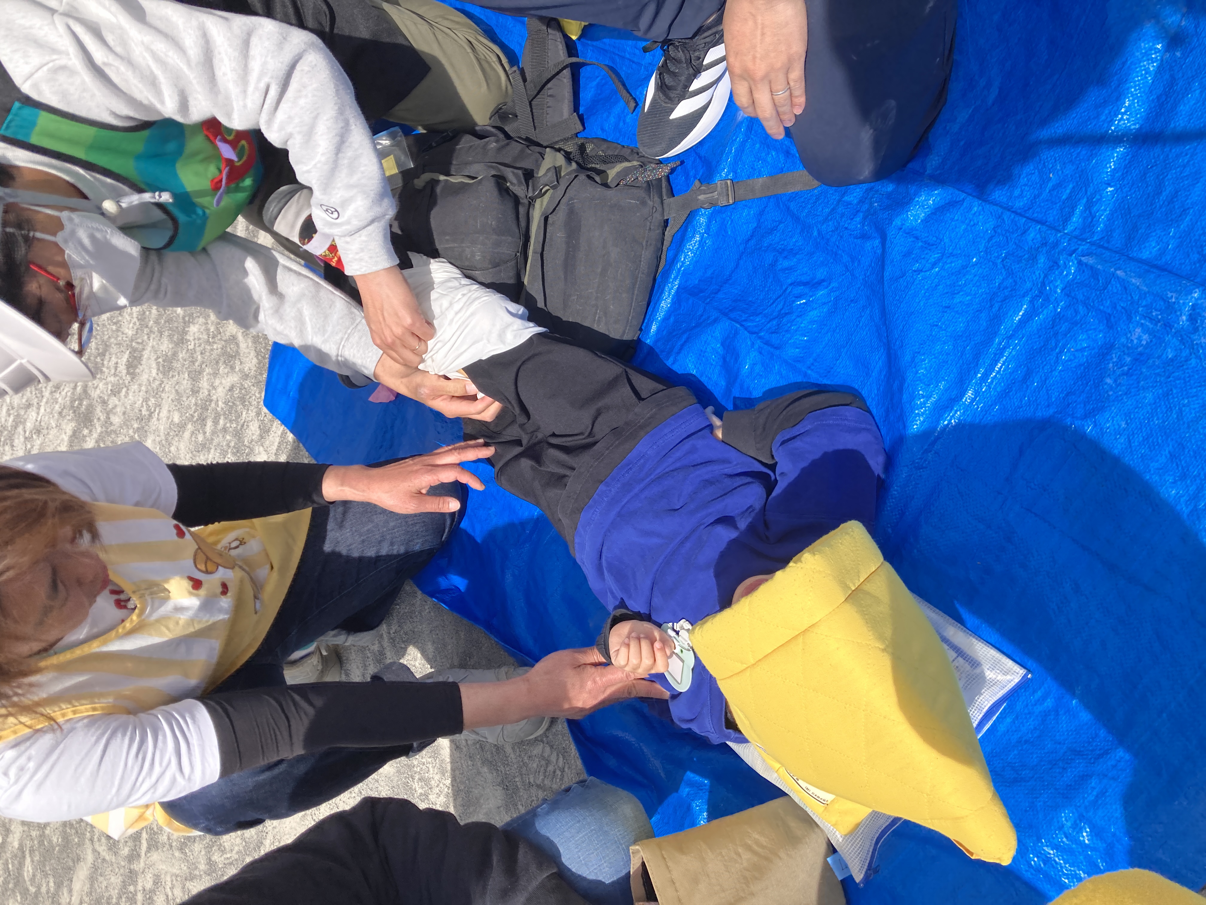 避難中に園児が怪我をした想定で怪我対応も行いました。(今回は右足骨折の疑いでした)